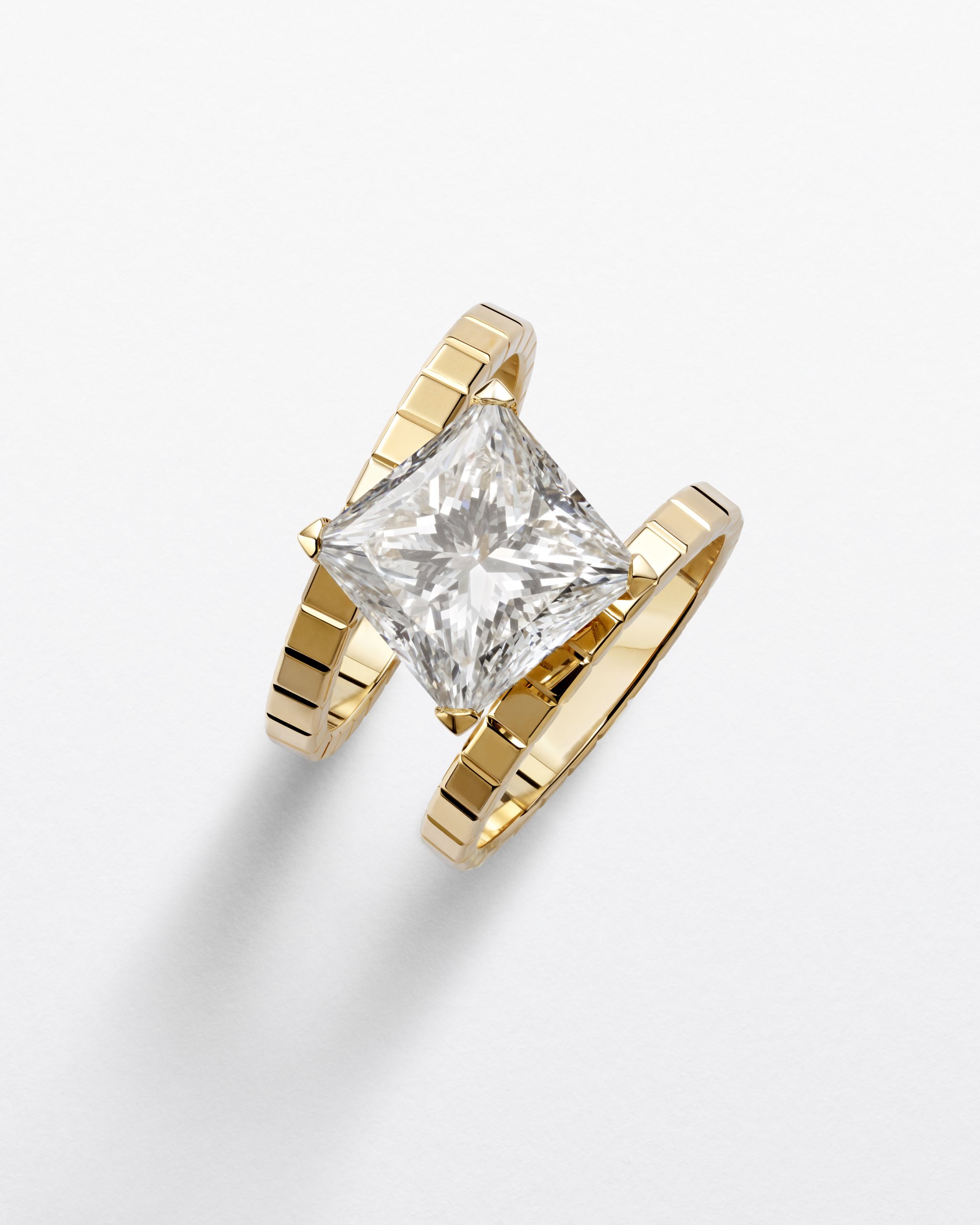 Completing this series of earrings to be worn solo or stacked, she has created a ring composed of two rings connected by a princess-cut solitaire diamond.
