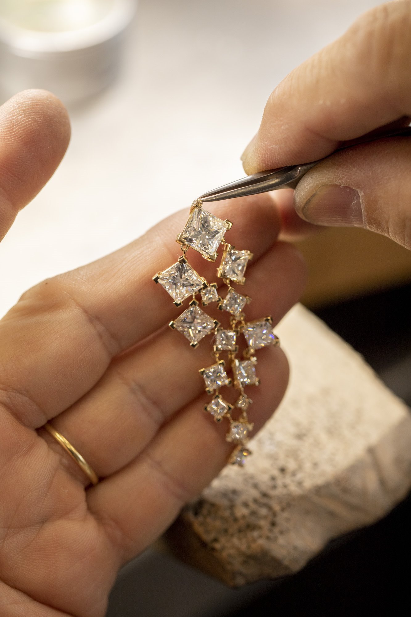 One side features a series consisting of two connected gold rings to wear on top of the ear; followed by a diamond-set counterpart; and finally, on the lobe, a princess-cut solitaire diamond with a square shape recalling the small faceted cubes of the rings.
