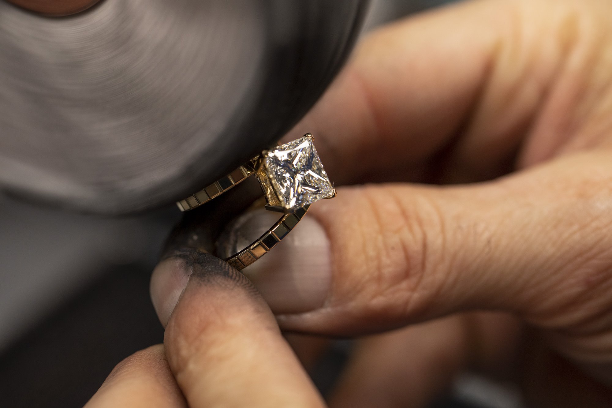 Ring in Fairmined-certified ethical 18-carat yellow gold set with a 5.73-carat princess-cut diamond.