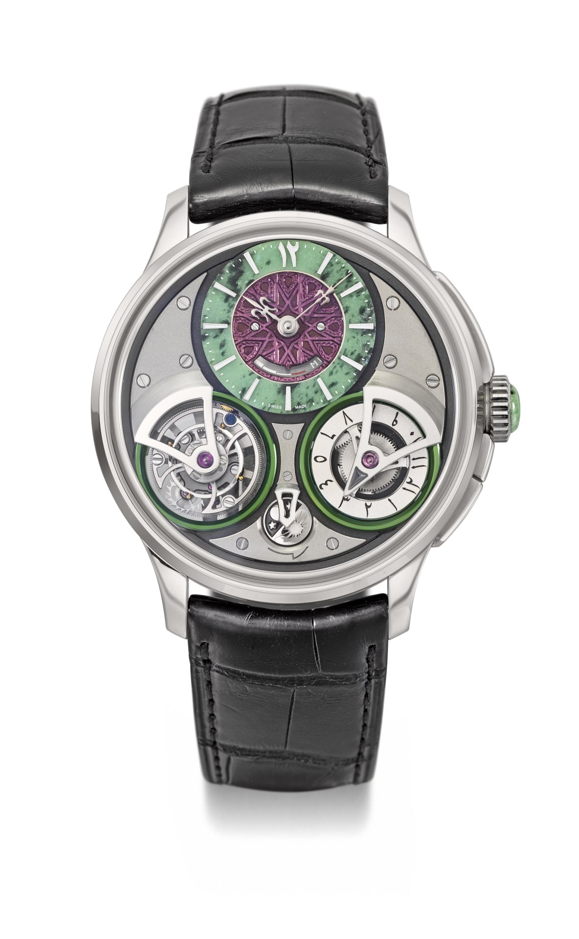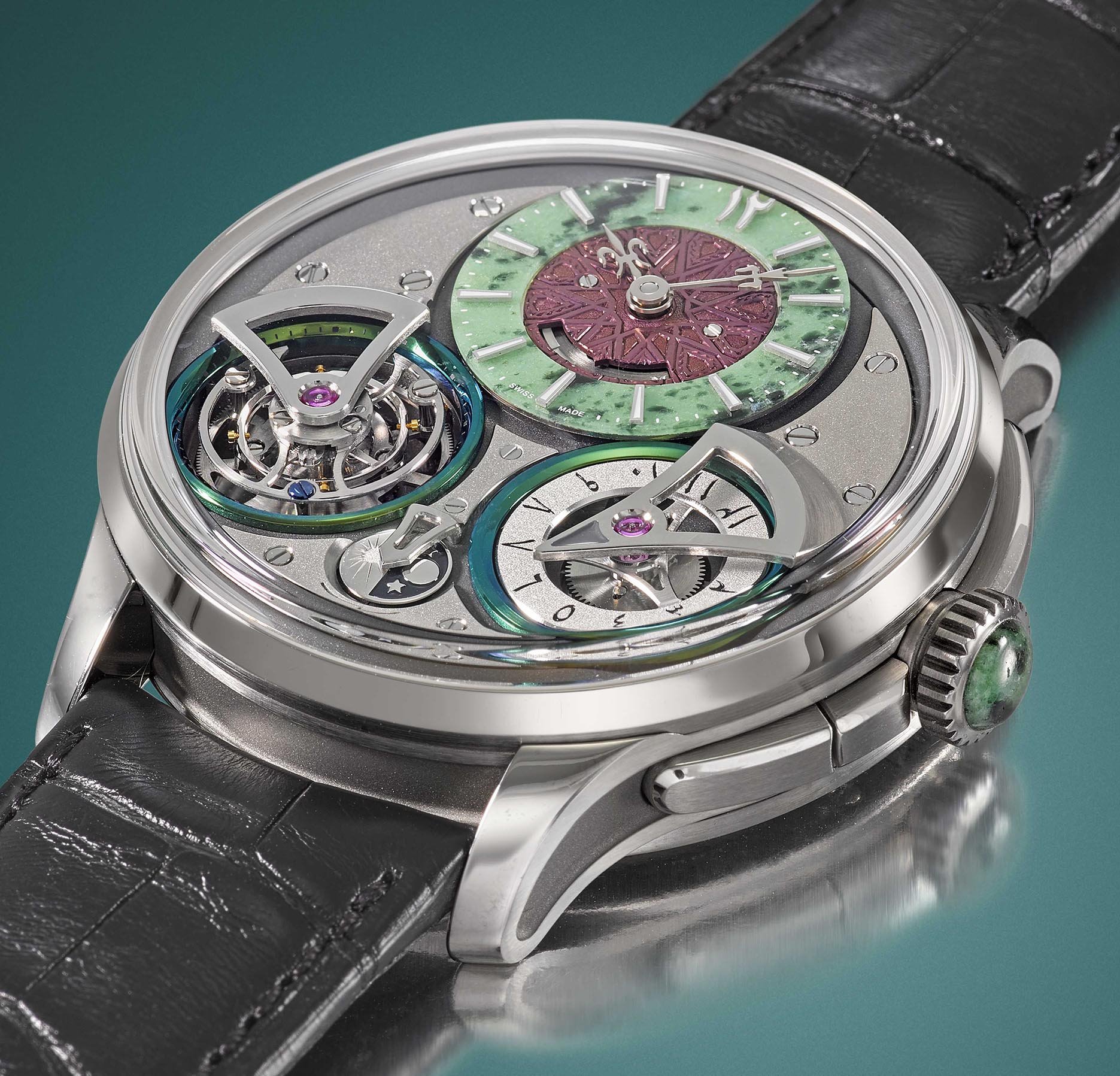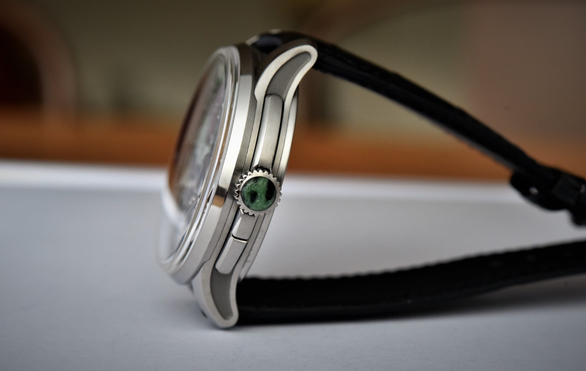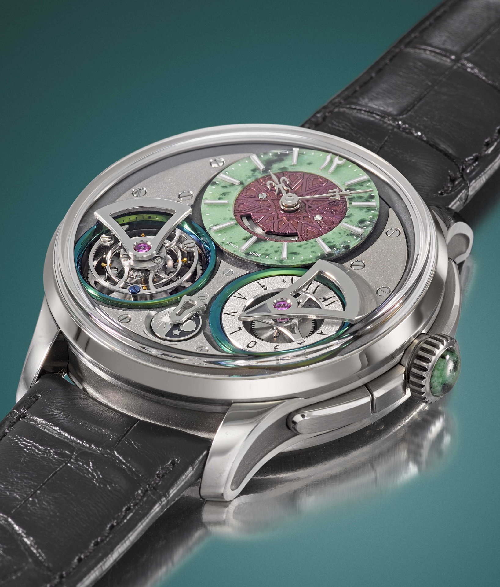 The ring displaying hours and minutes at 12 o’clock is made of Zoïsite, a very special green semi-precious stone with an irregular dark grey speckling, a world’s first in watchmaking.