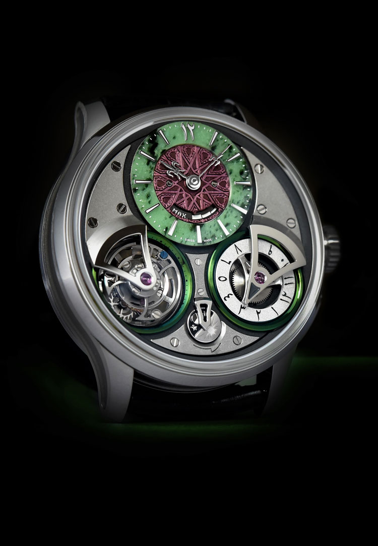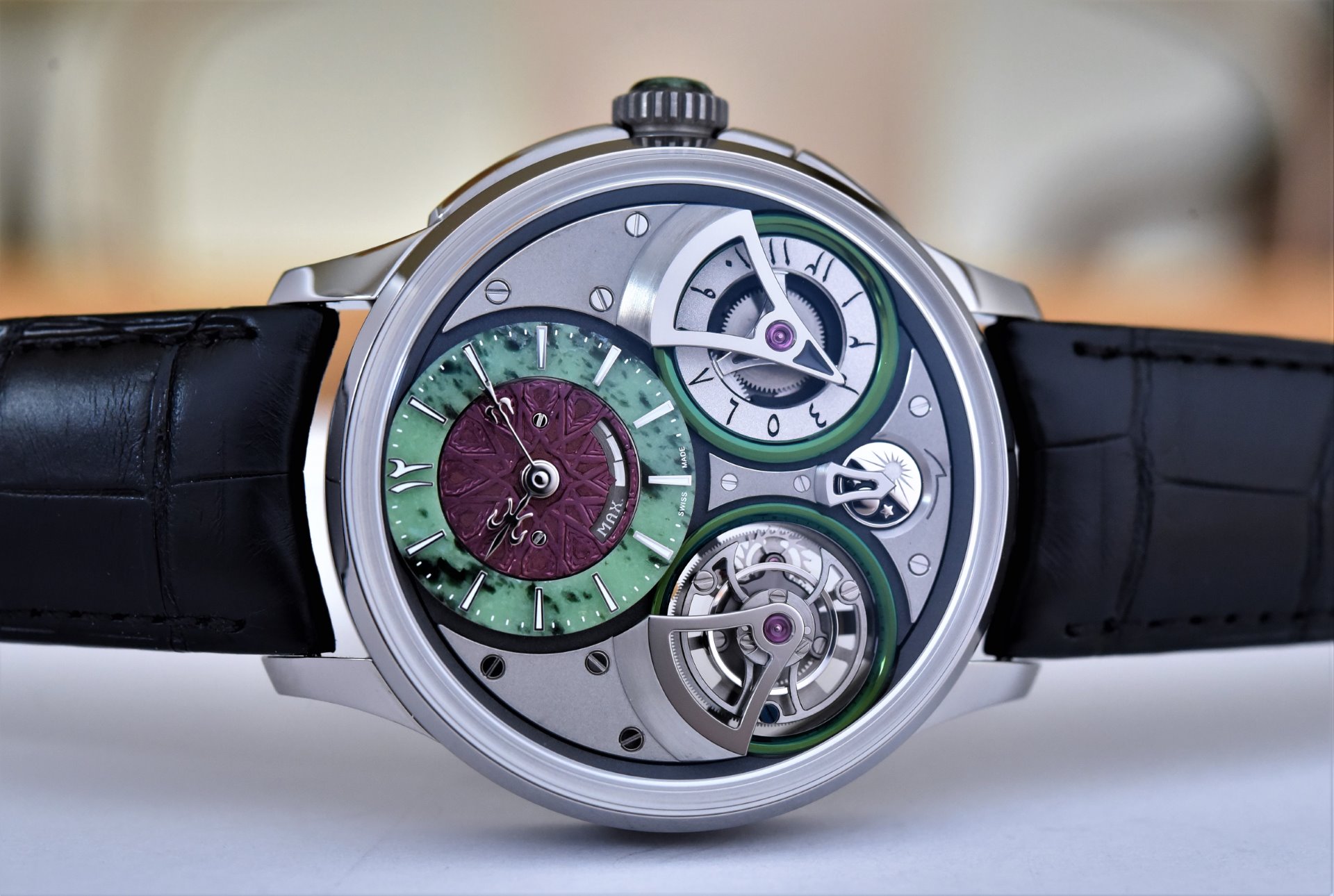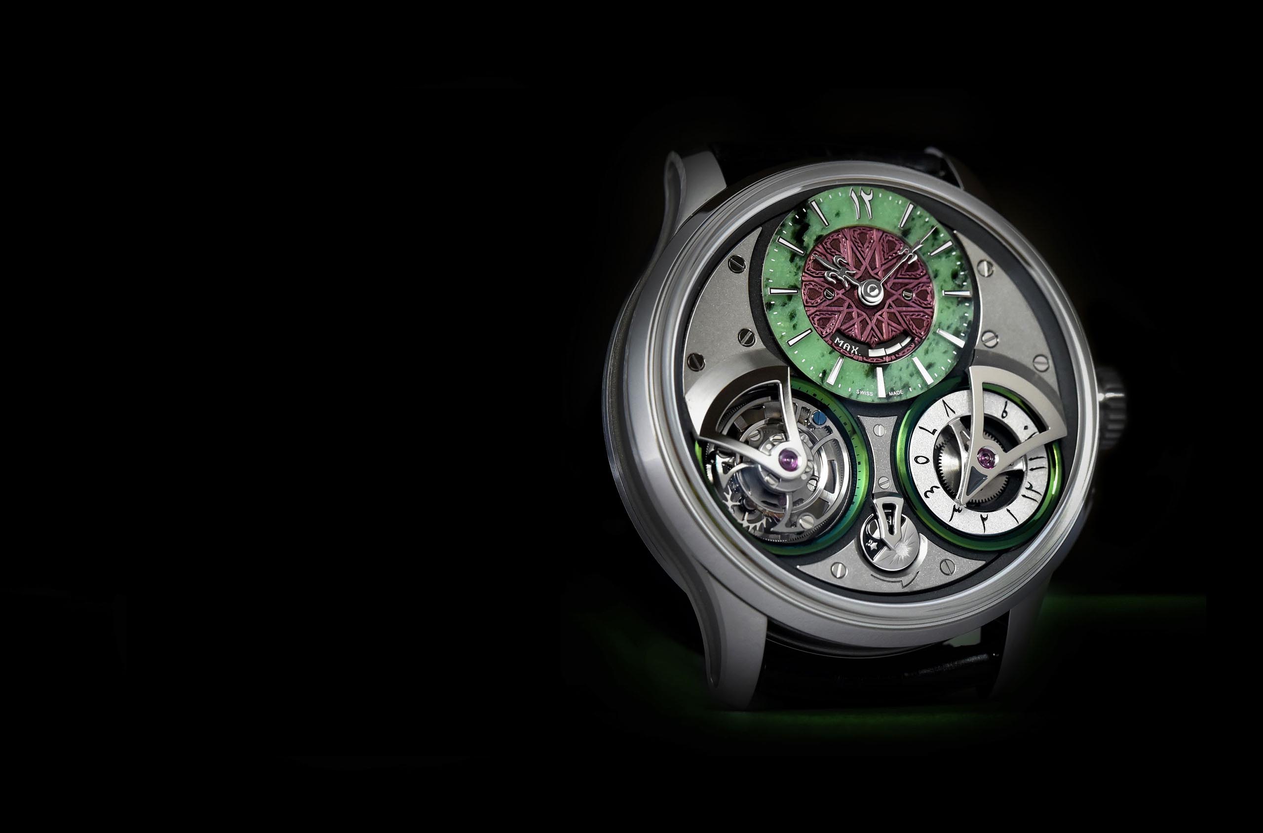 The ring displaying hours and minutes at 12 o’clock is made of Zoïsite, a very special green semi-precious stone with an irregular dark grey speckling, a world’s first in watchmaking.