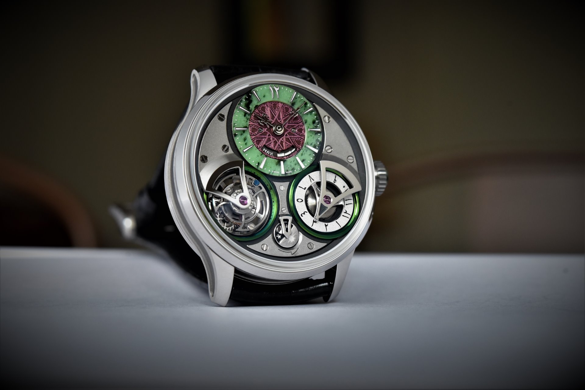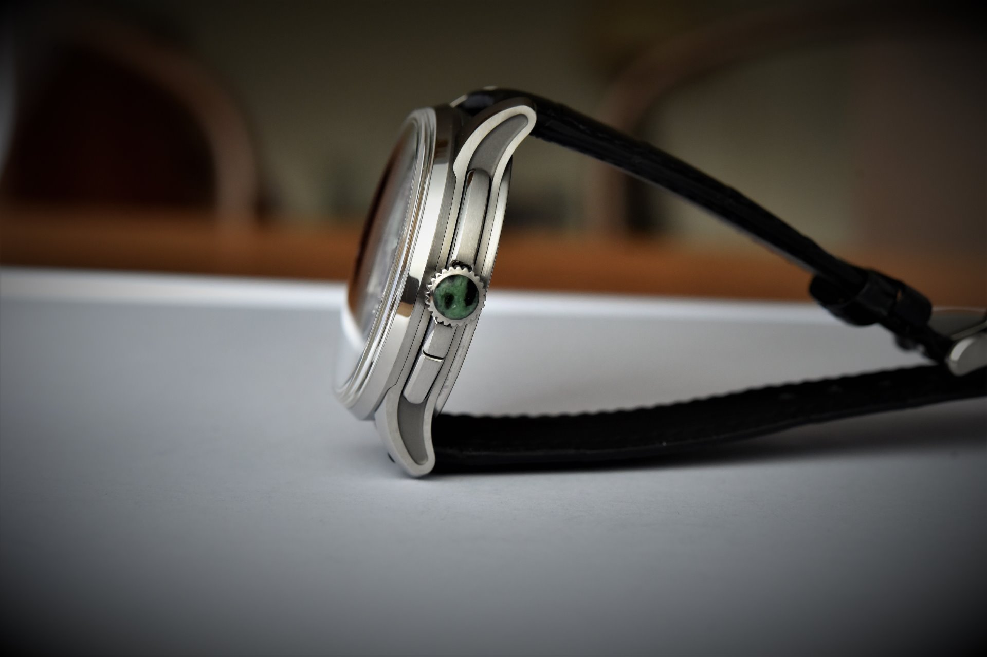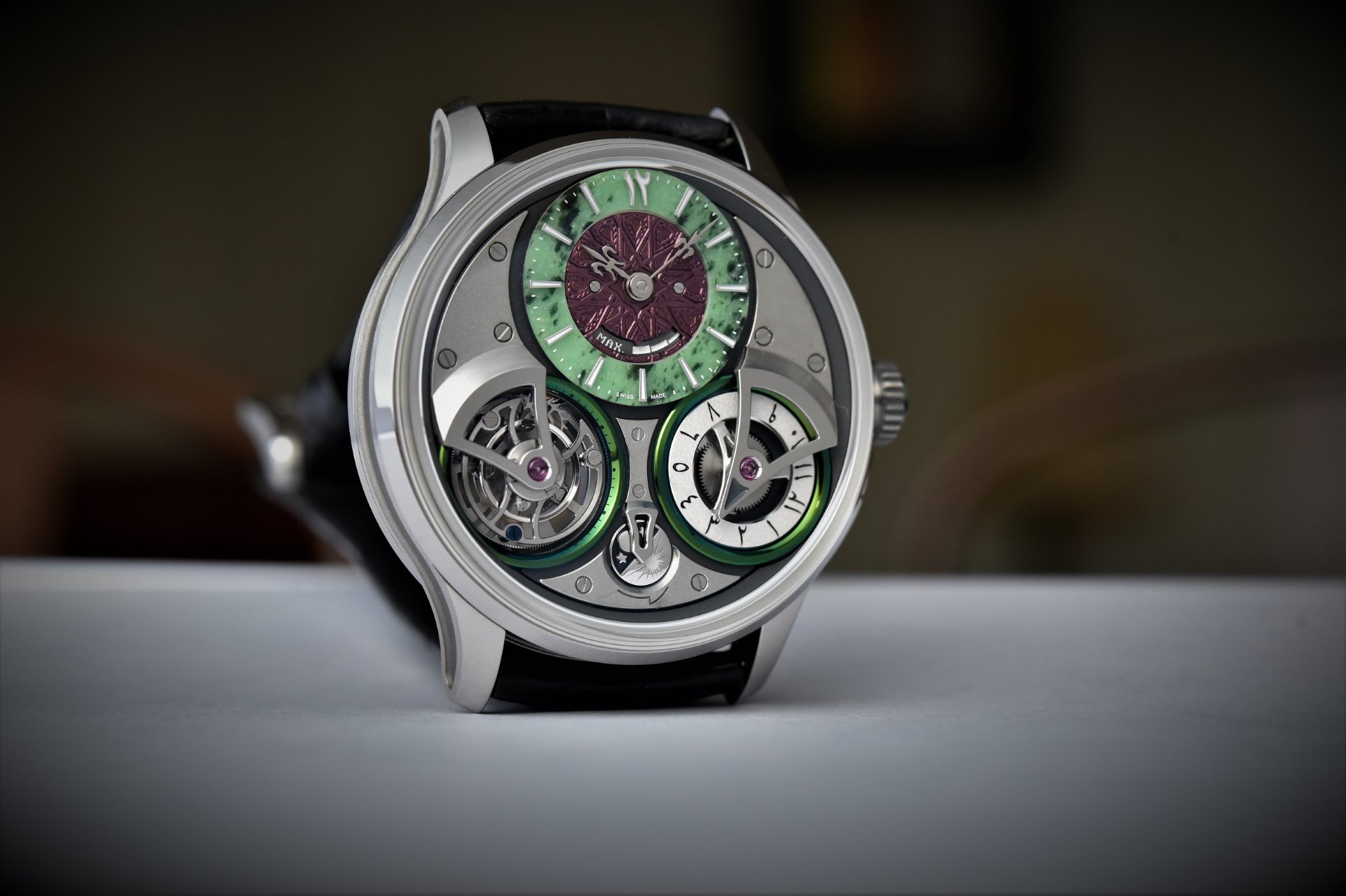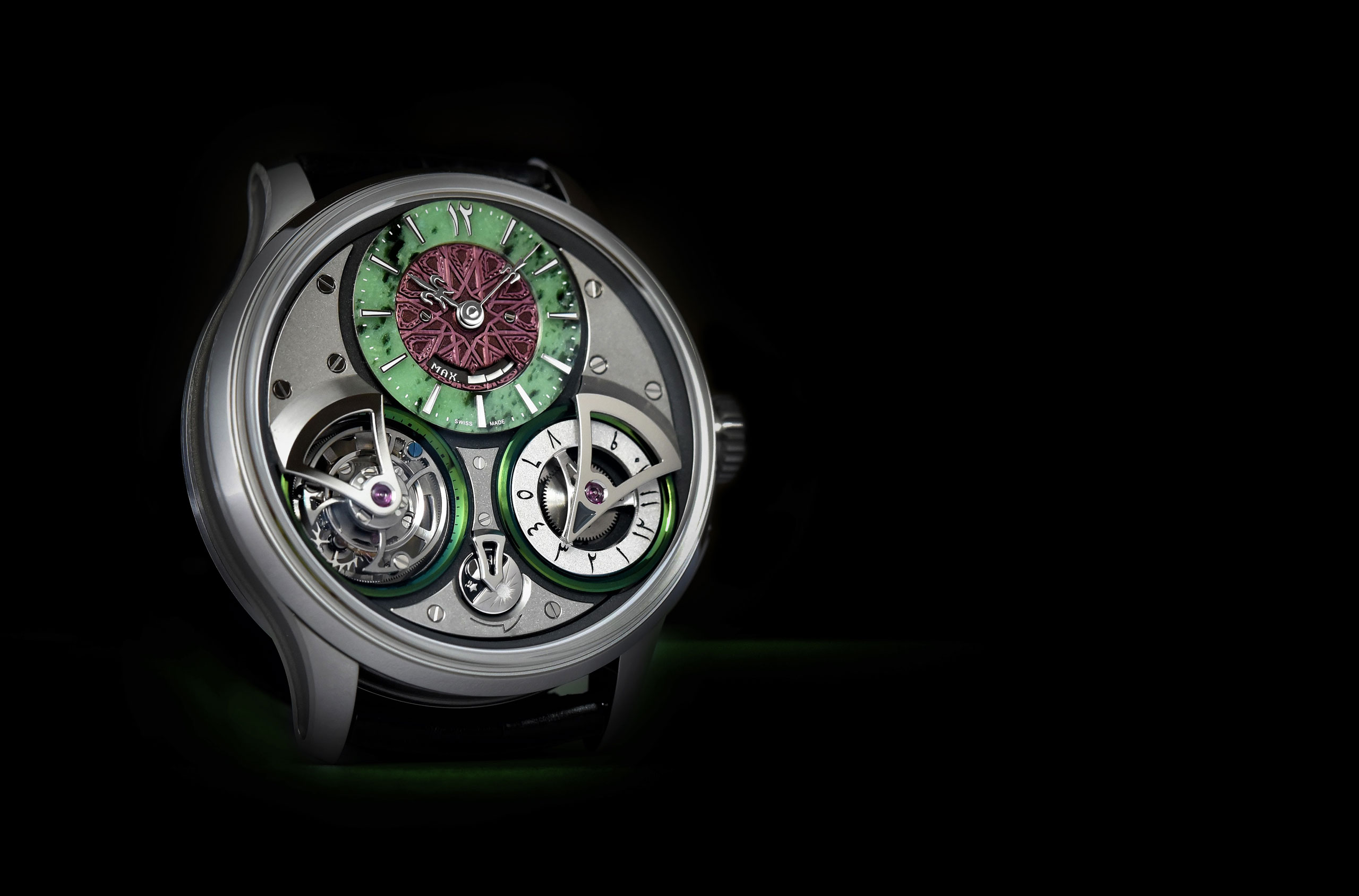 The ring displaying hours and minutes at 12 o’clock is made of Zoïsite, a very special green semi-precious stone with an irregular dark grey speckling, a world’s first in watchmaking.