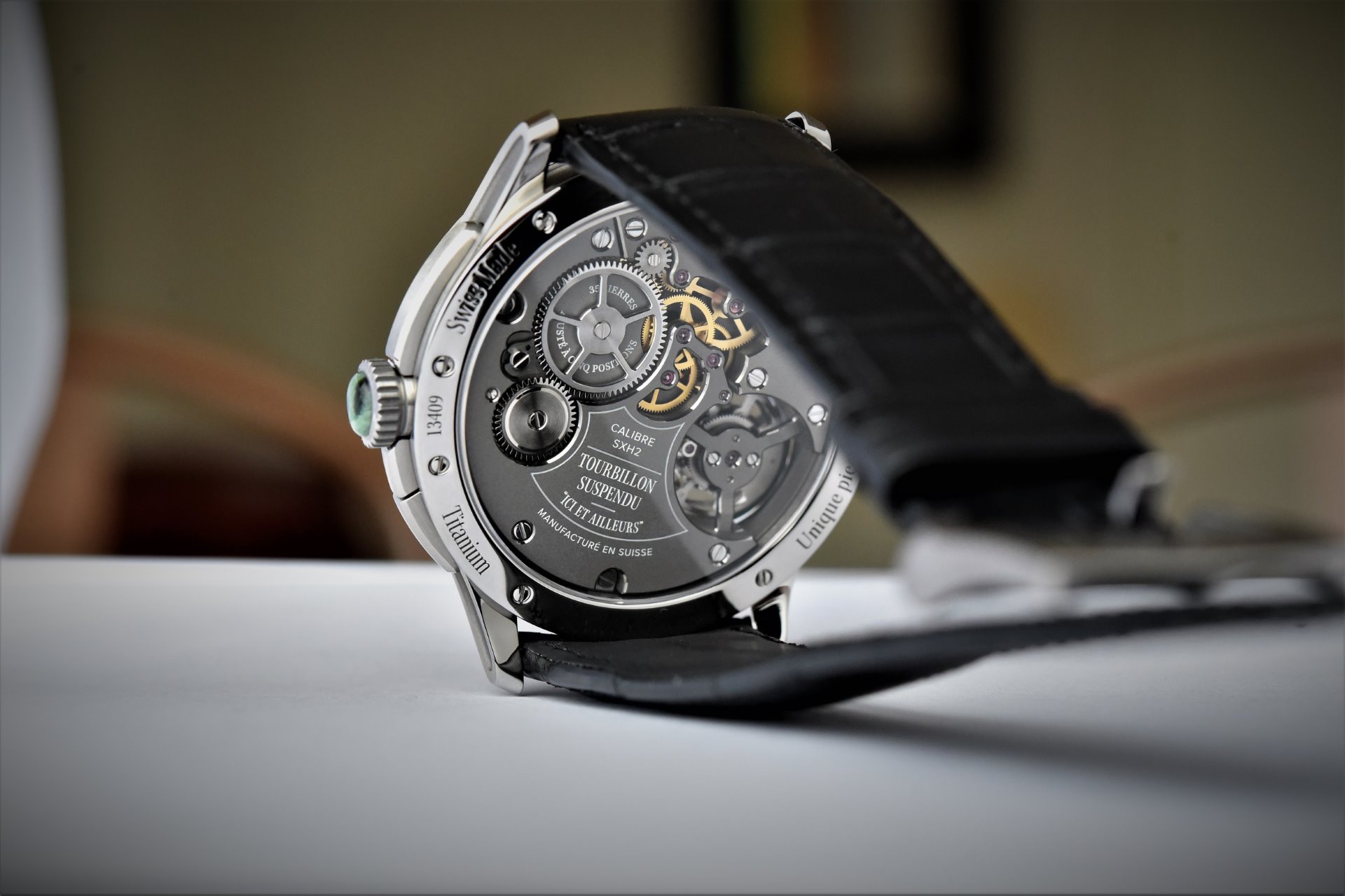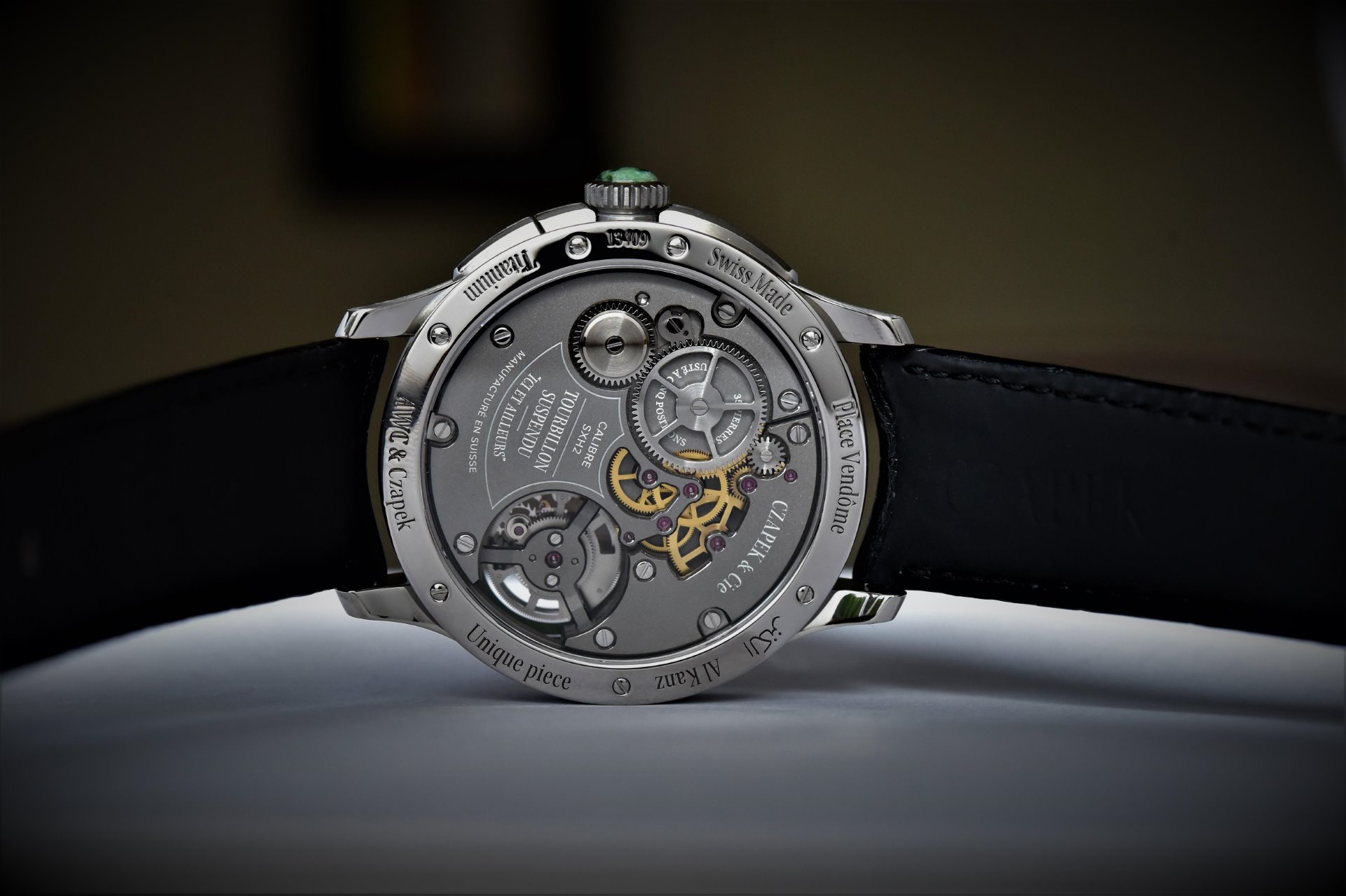 The Place Vendôme “Al Kanz” 43.5mm titanium Grade 5 case hosts Czapek’s proprietary, manually wound SXH2 movement beating at 21,600 vph (3 Hz). The single barrel spring delivers a solid 60 hours of power. The movement finish includes satin-brushed bridges and open worked ratchet. Czapek’s signature subdials at 7:30 and 4:30 carry a one-minute suspended tourbillon and a second time zone indication. The tourbillon and GMT rings are made of steel and covered with a green nanometrical layer. This process, originally invented for the medical industry, is a variant of the chemical vapor deposit, called ALD. It is executed by Positive Coating, in La-Chaux-de-Fonds.