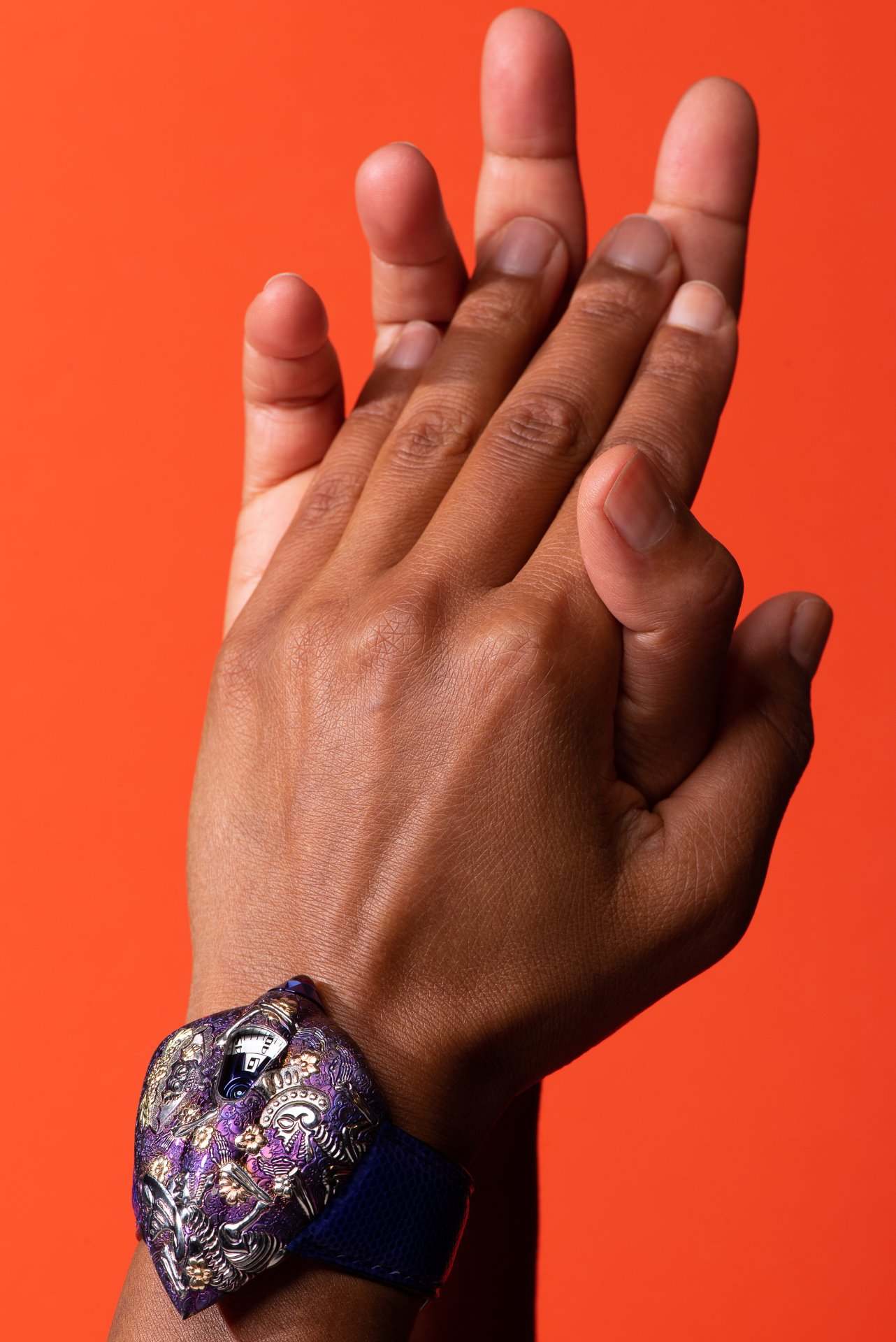 To make this timepiece, Denis Flageollet used titanium that he patiently machined, preparing it for the gold inserts, until he obtained the perfect fit for the piece, working it not only before the engraving stage, but also again afterwards, then in the fire to tint it, then on the workbench to polish it by hand, revisiting the state of the metal surfaces at each stage, each microscopic detail, each relief, even sparing some parts to ‘lift’ the design as a means of perfecting the whole. It was like redrawing the piece one last time.