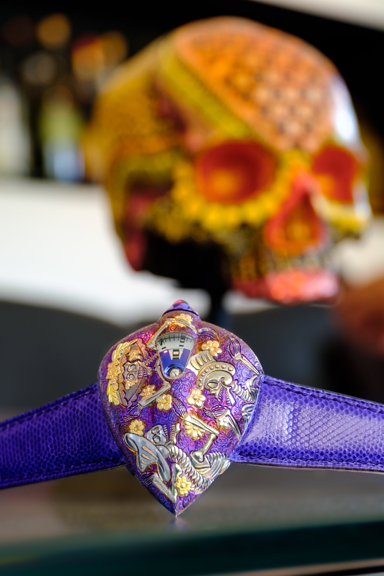 The colours of metals… one of Denis Flageollet’s favourite playgrounds. It quickly became clear to him that the subject at hand, a watch for the Day of the Dead, required a different approach, a playing on nuances to accentuate the edginess of the famous portrait of La Catrina by Posada.