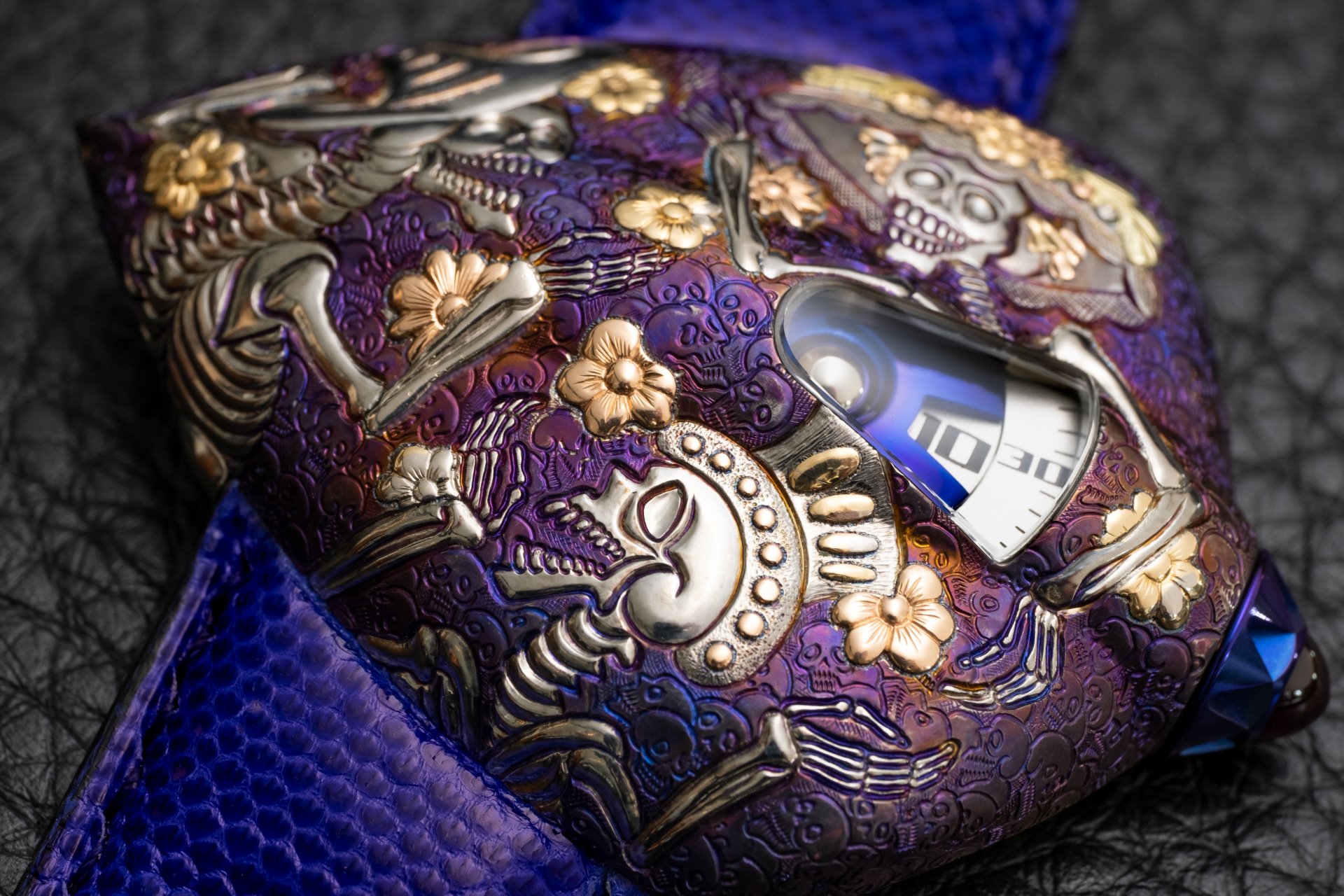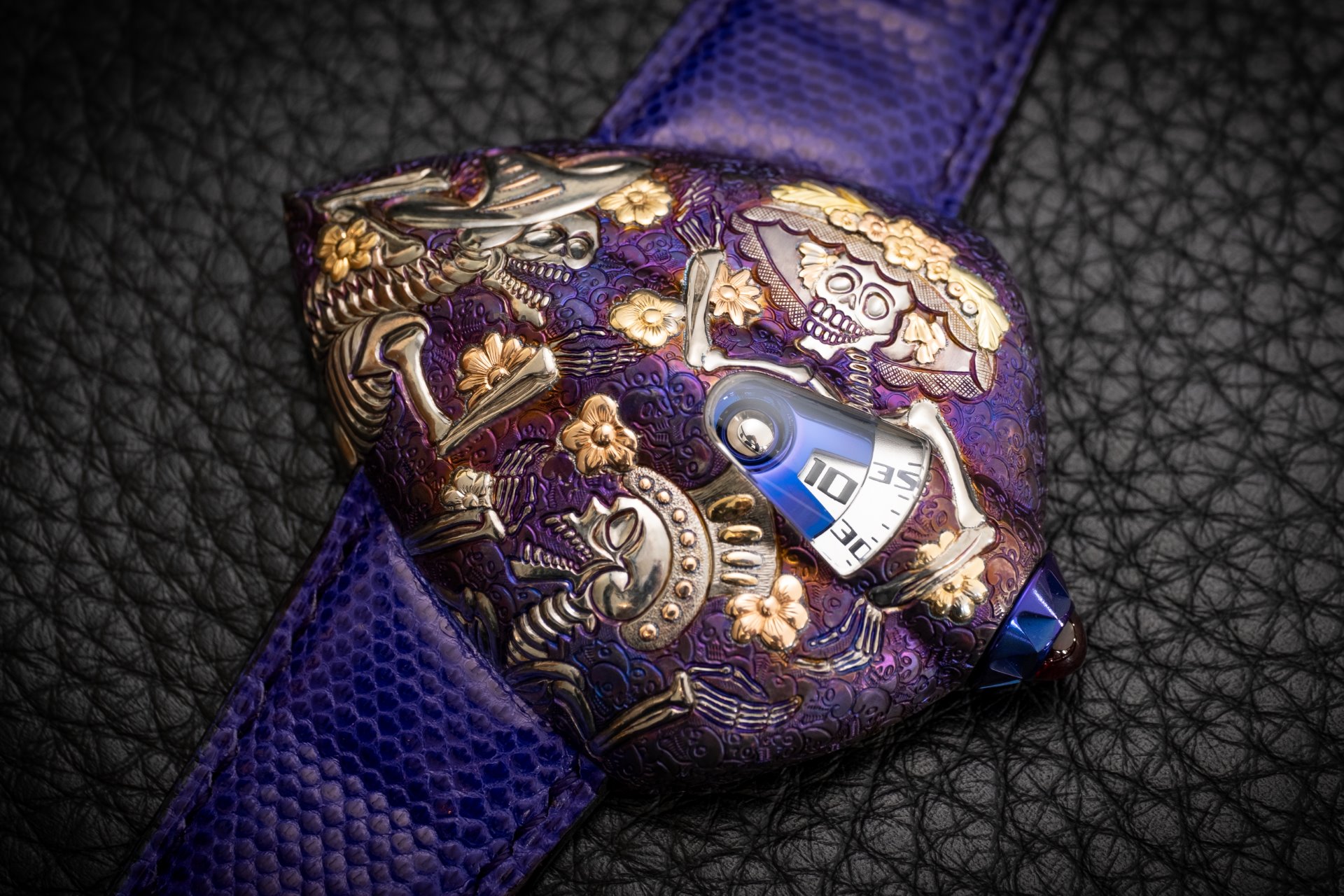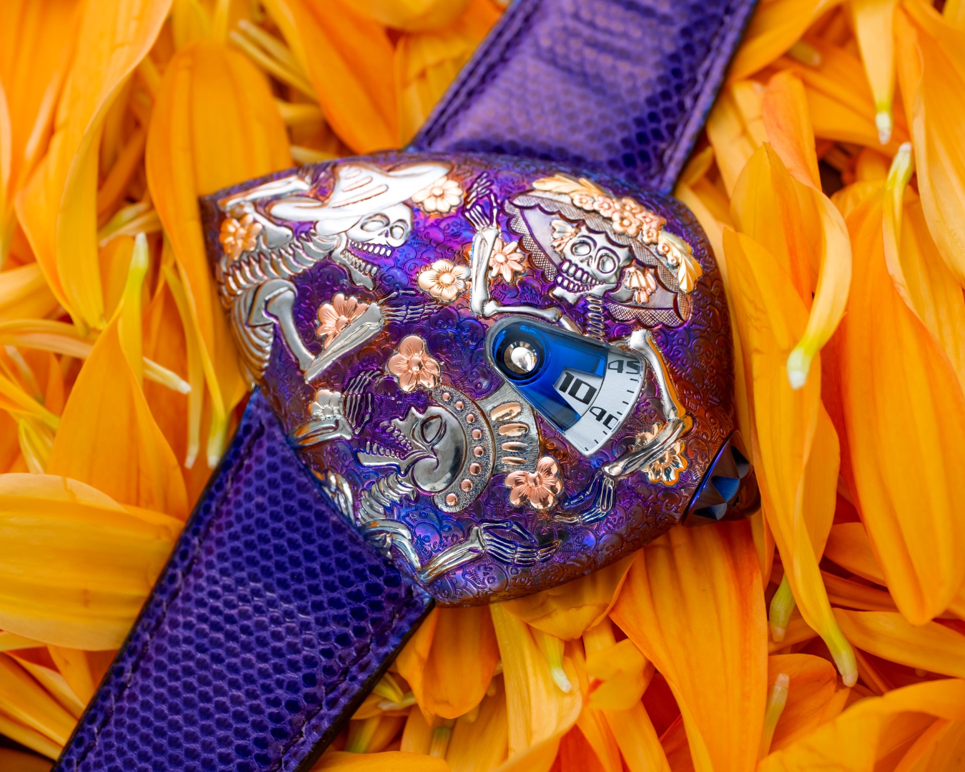 Reaching beyond the challenge of a contemporary reinterpretation of the Mexican artist’s engravings, Denis Flageollet and Michèle Rothen introduce the additional technical challenges of not only working with a titanium case, but also of having it flame-blued, hand-engraved, and decorated for the first time with delicate gold inserts, as well as engraved to magnify the Cempasúchil blossoms. And to take the level of difficulty a few notches higher still, several different types of 18K gold alloy are used.