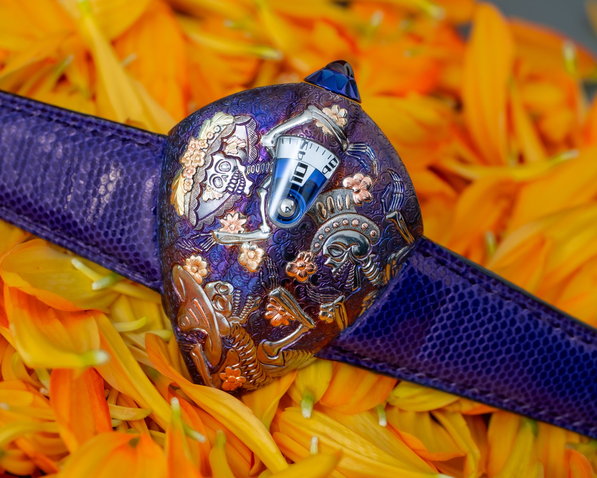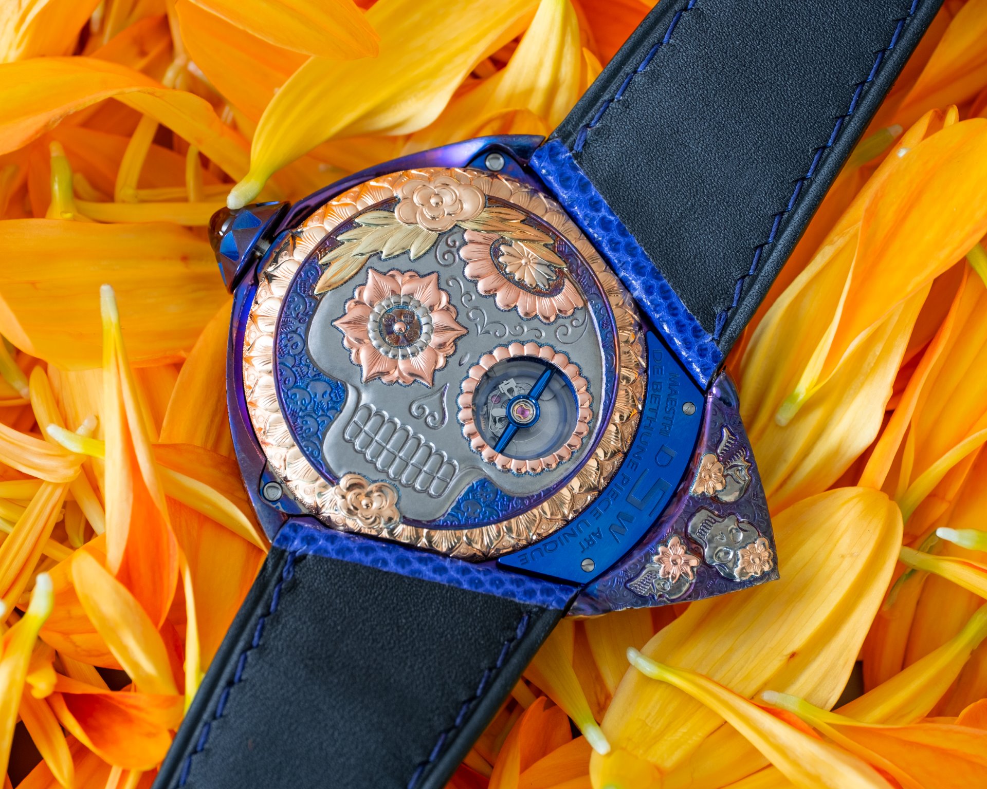 With the DW5 Cempasúchil, De Bethune interprets the notion of time in Mexican culture, the accepted permeability between the real world and the netherworld, by imagining an object for measuring time that speaks to all these transitions.