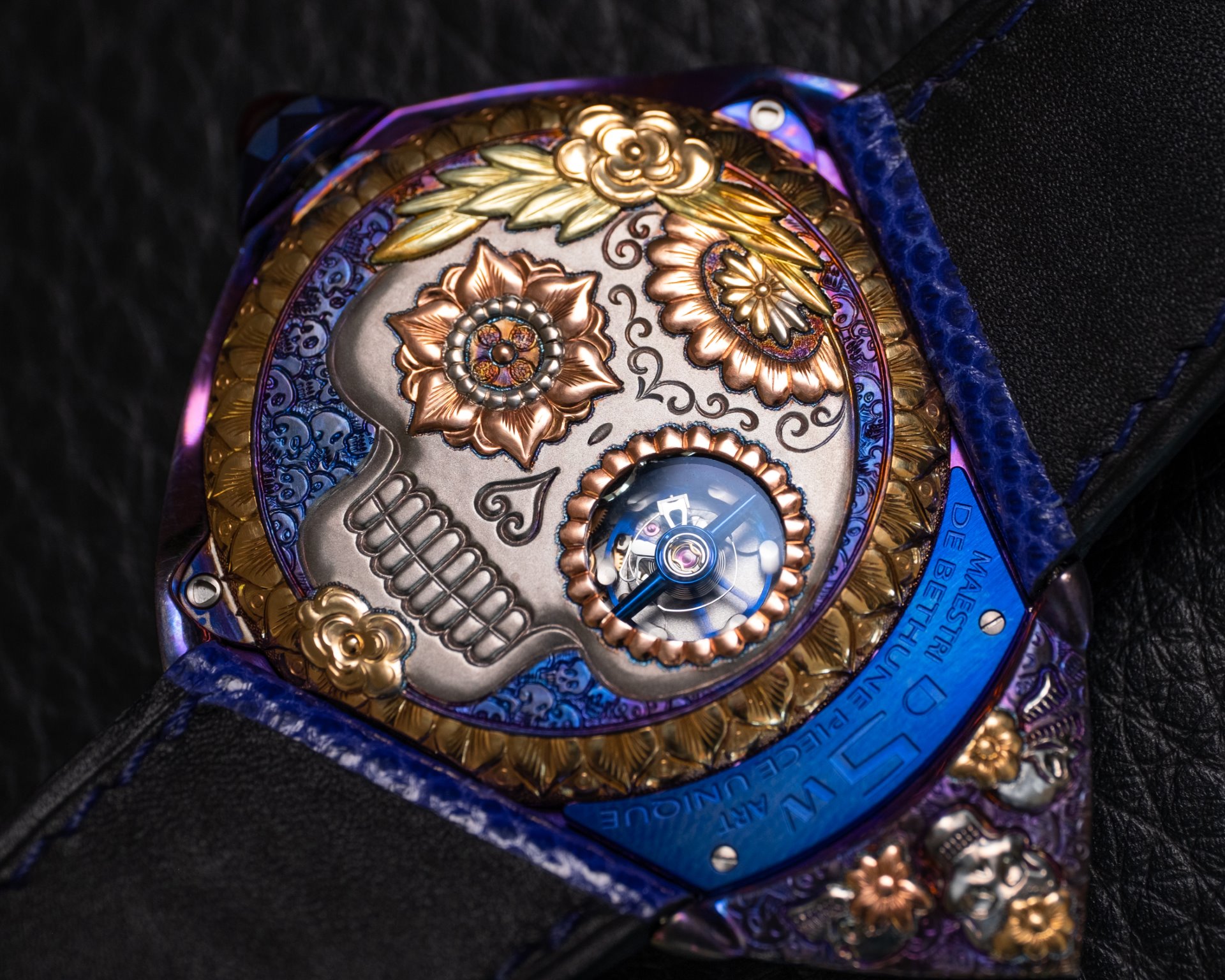 A mischievous wink: the back of the watch is also treated like a true work of art. Also made of titanium and 18K gold, it is adorned with an immense skull, ‘another true calavera’ decorated with multiple flowers, with two large eye sockets, through one of which the movement’s balance-spring can be admired.