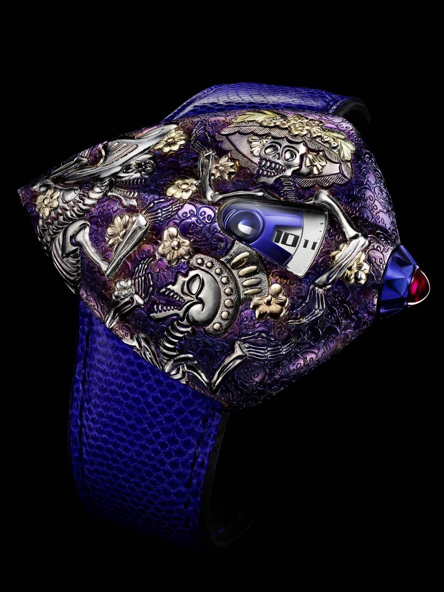 On the outside of the timepiece, the watchmaker gives us the phantasmagorical world inspired by the discovery, on a trip across the Atlantic, of an old engraving that depicted a joyful rendering by Posada. On the inside, the real world of watchmaking precision and engineering.