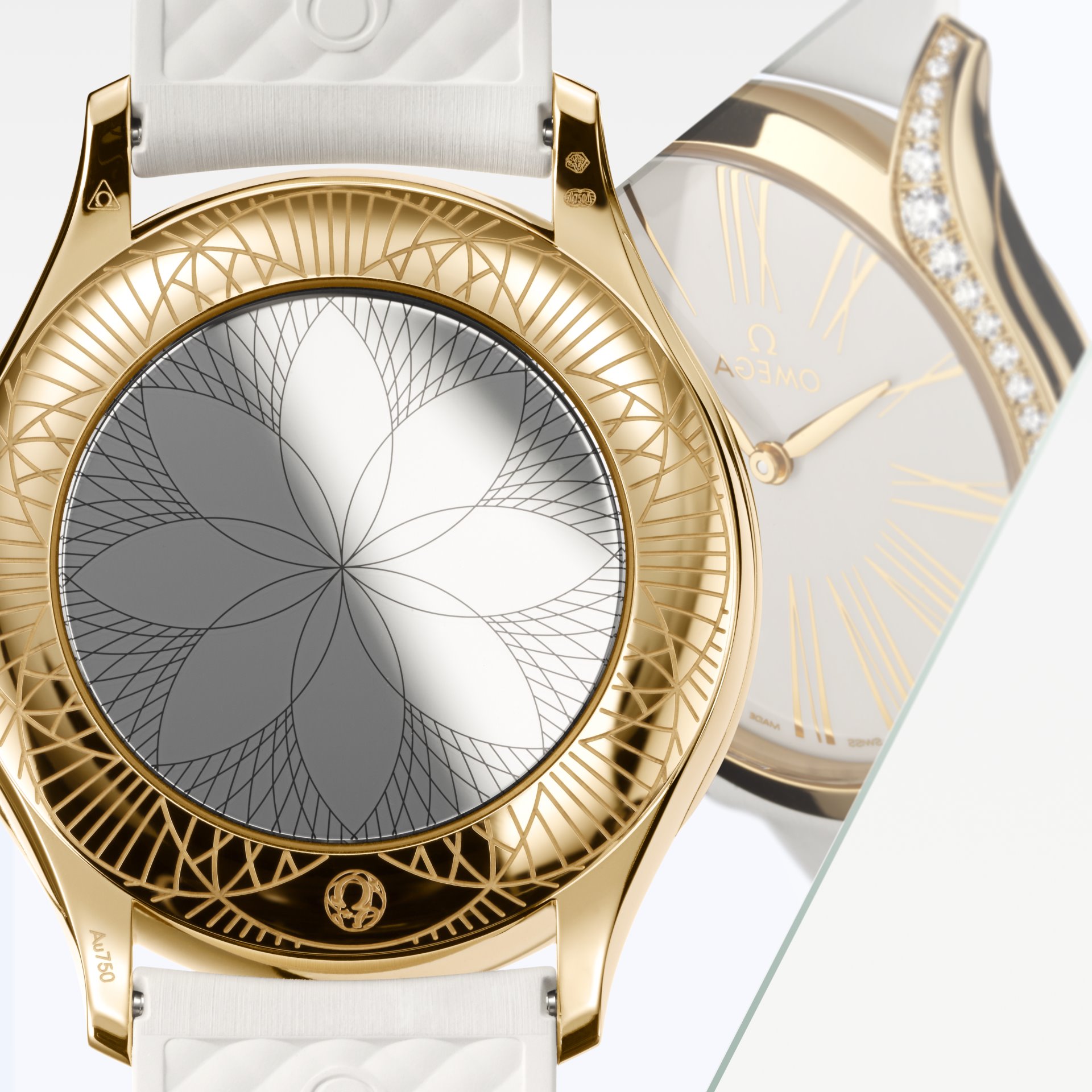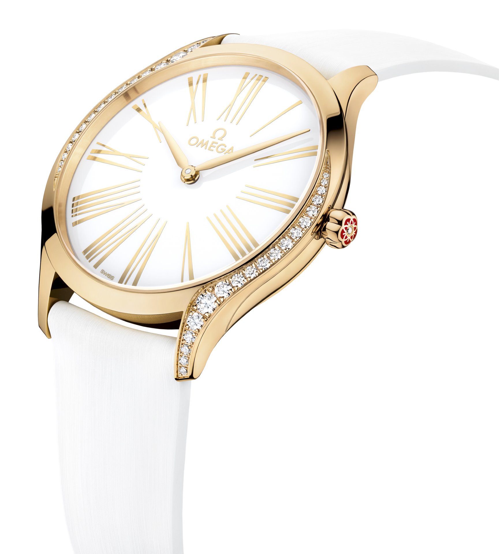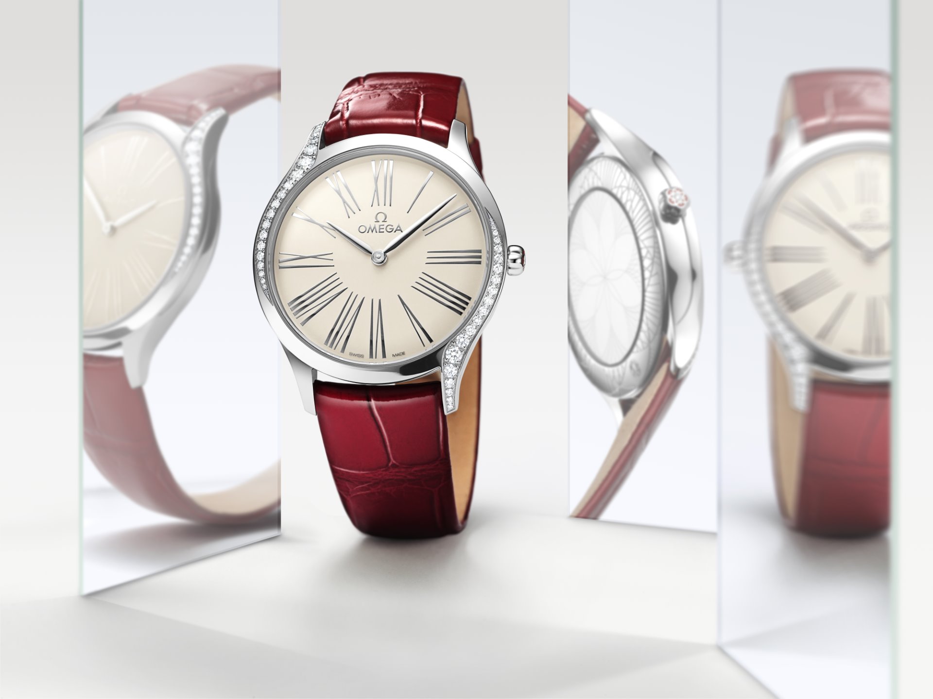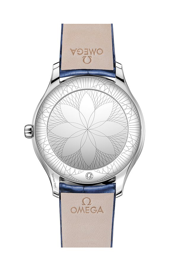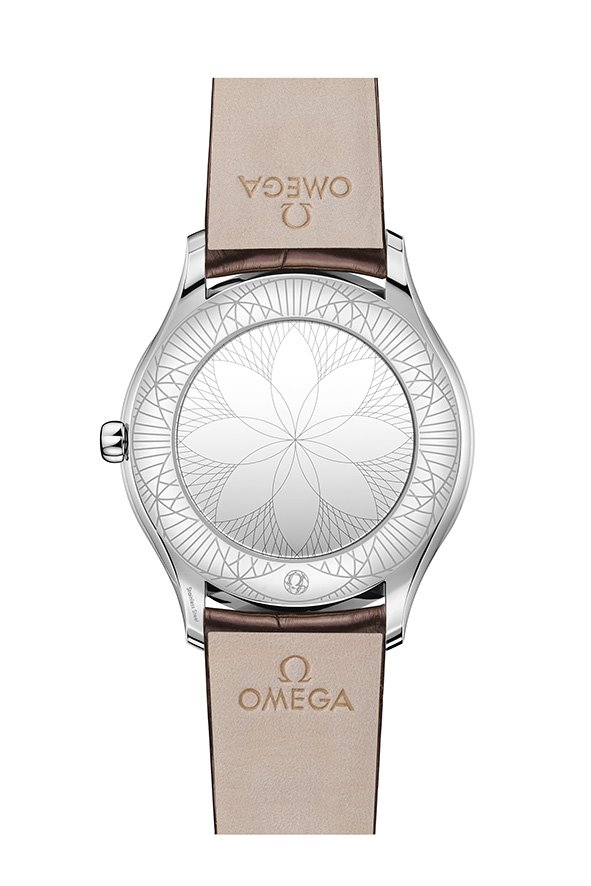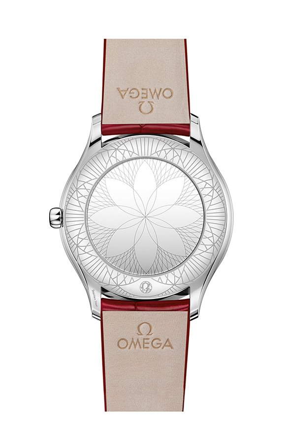 In keeping with the Trésor’s distinctive design, each case is embellished with 38 full-cut diamonds, which curve along the sides of the case. An additional diamond is also placed on each crown, amidst an OMEGA flower made of red liquid ceramic. Furthermore, the timepieces are notable for their beautifully polished mirror casebacks, with each one embellished by a metalized “Her Time” pattern.