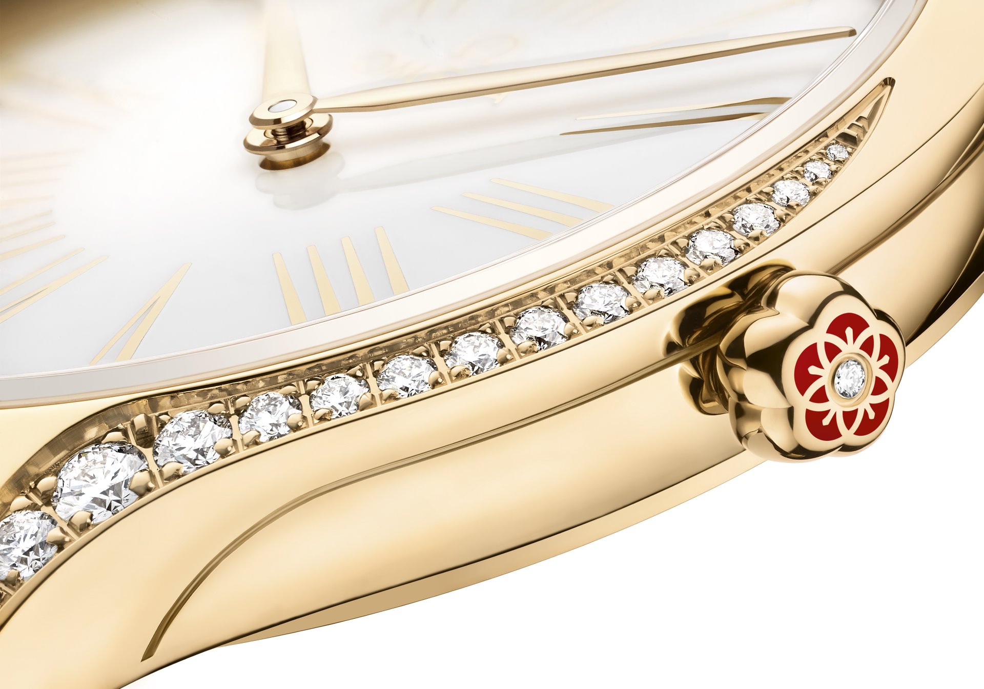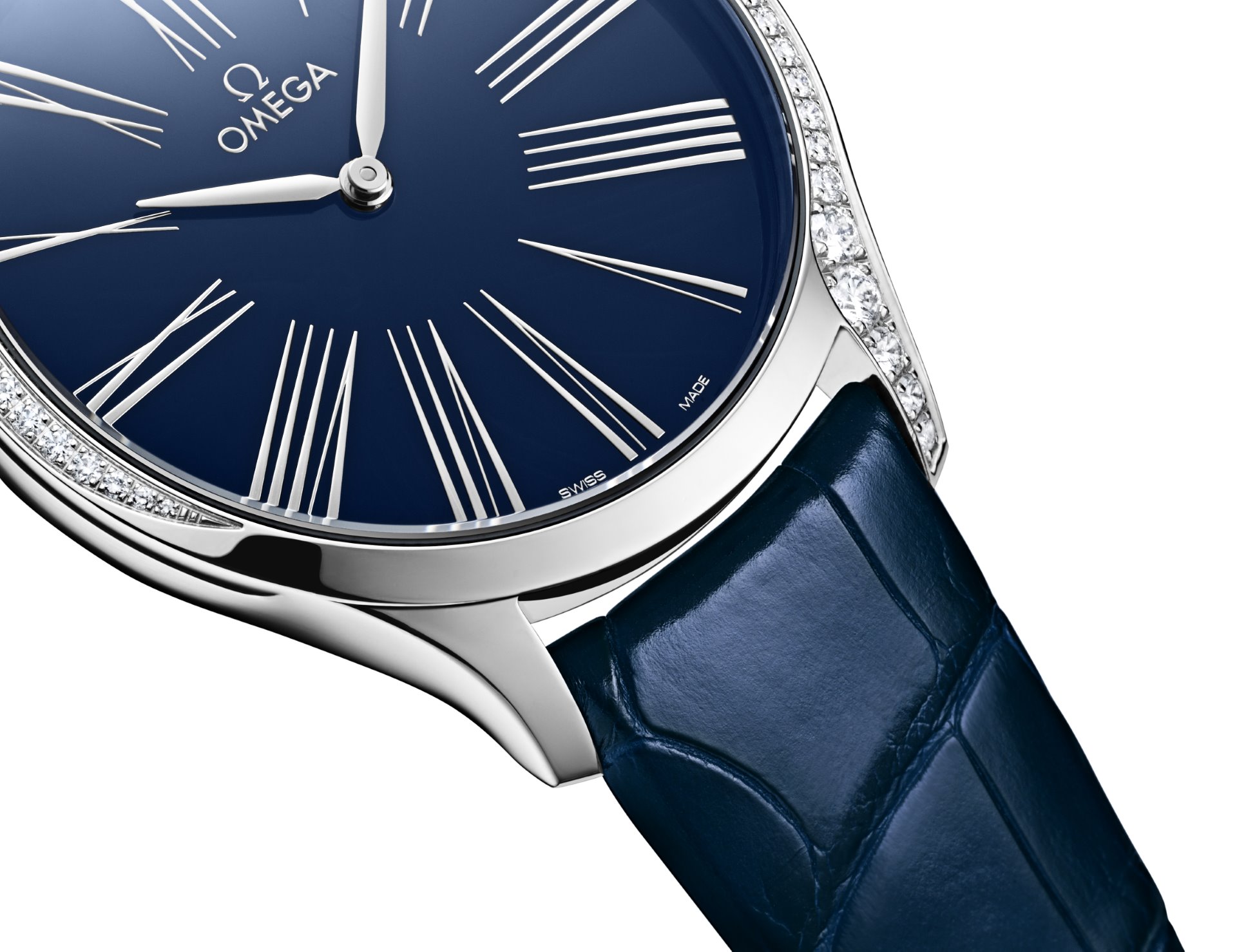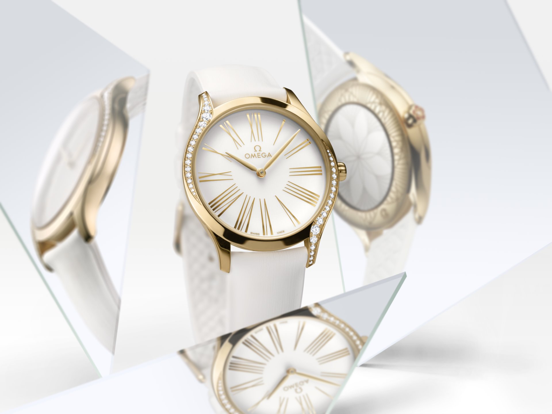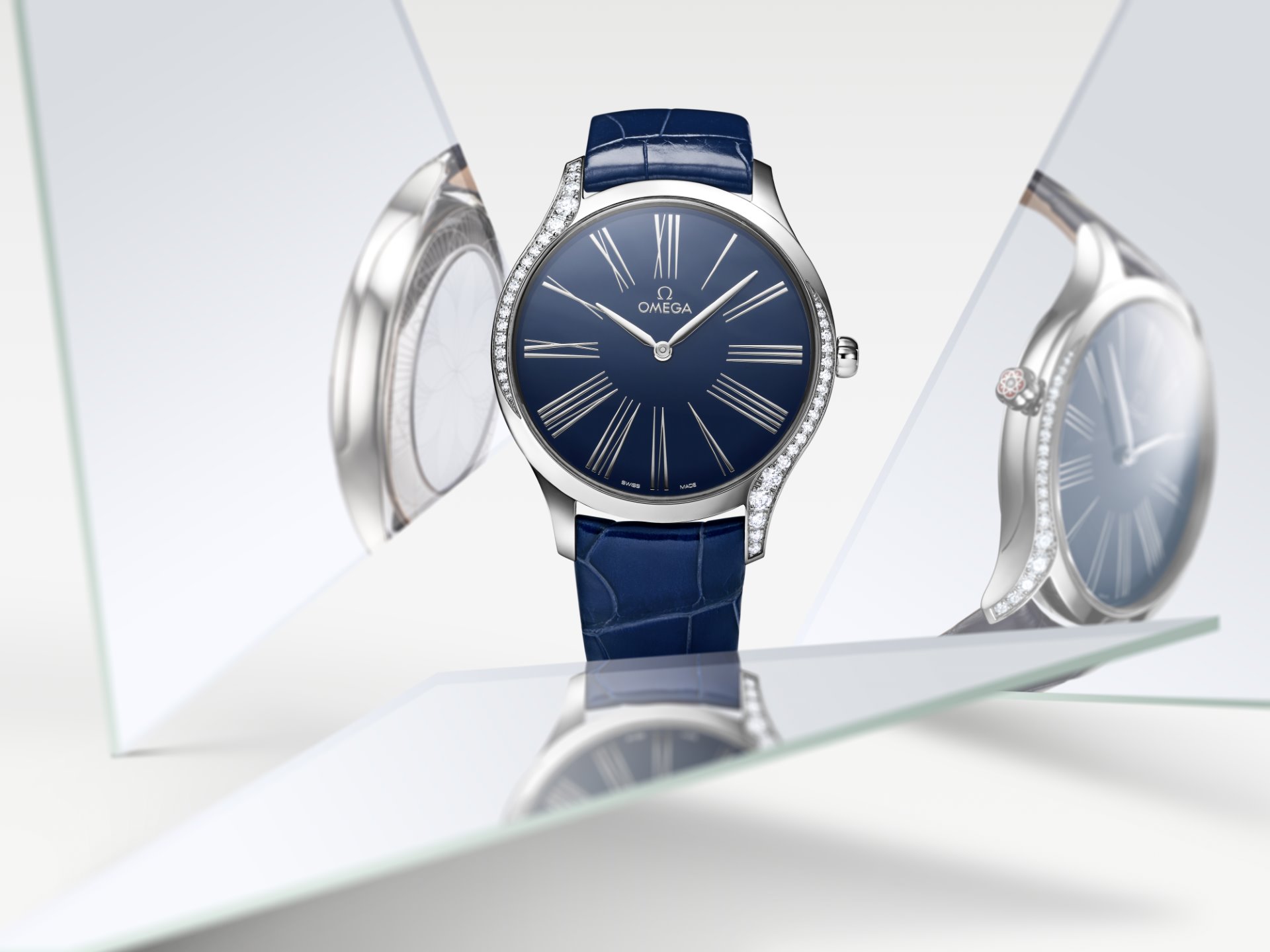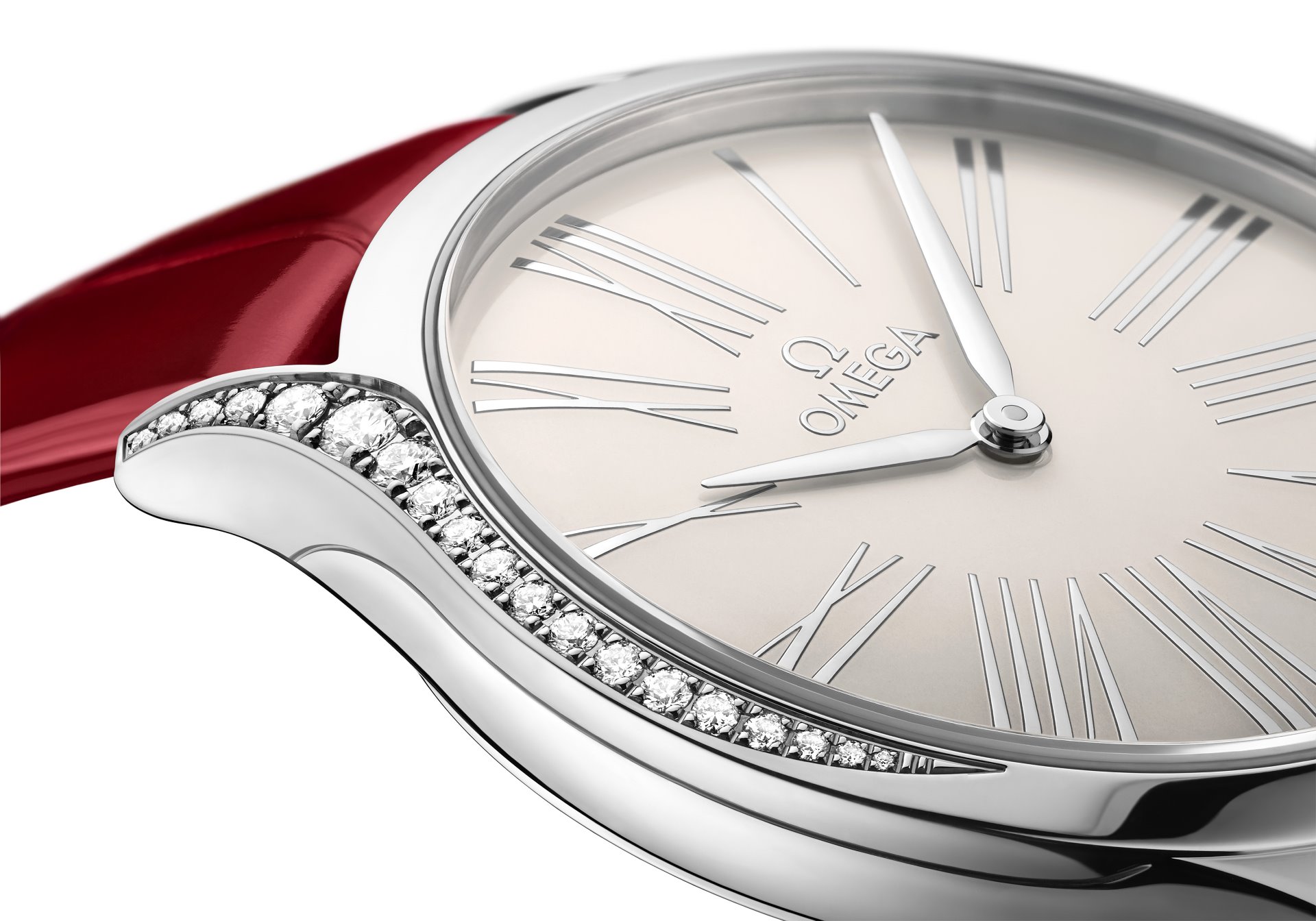 In keeping with the Trésor’s distinctive design, each case is embellished with 38 full-cut diamonds, which curve along the sides of the case. An additional diamond is also placed on each crown, amidst an OMEGA flower made of red liquid ceramic. Furthermore, the timepieces are notable for their beautifully polished mirror casebacks, with each one embellished by a metalized “Her Time” pattern.