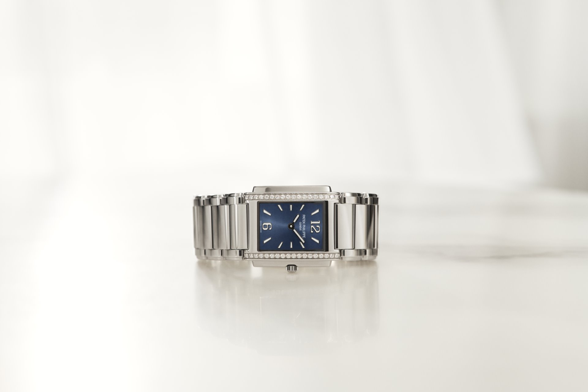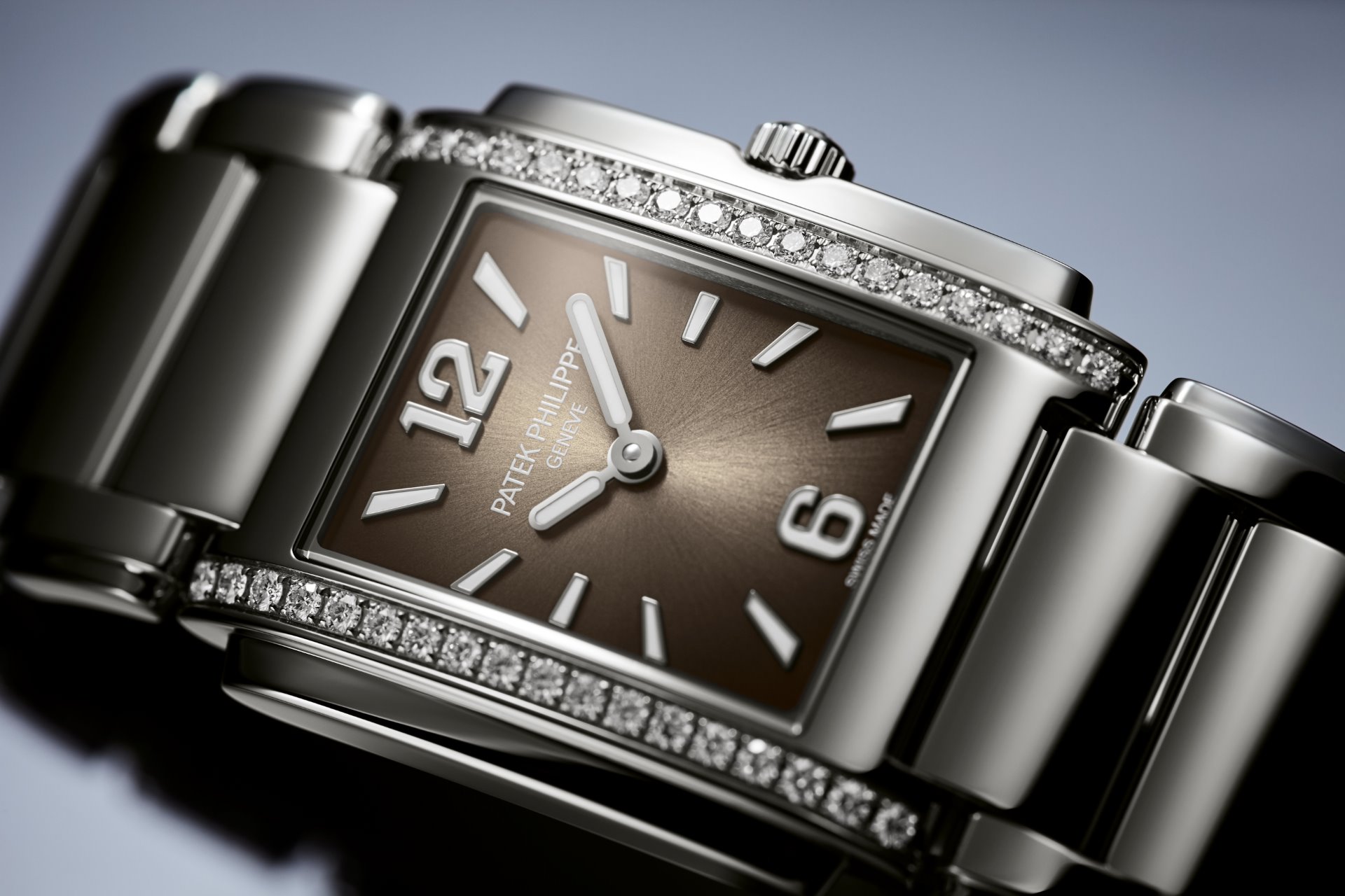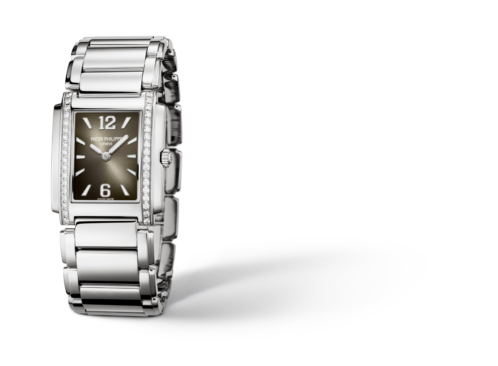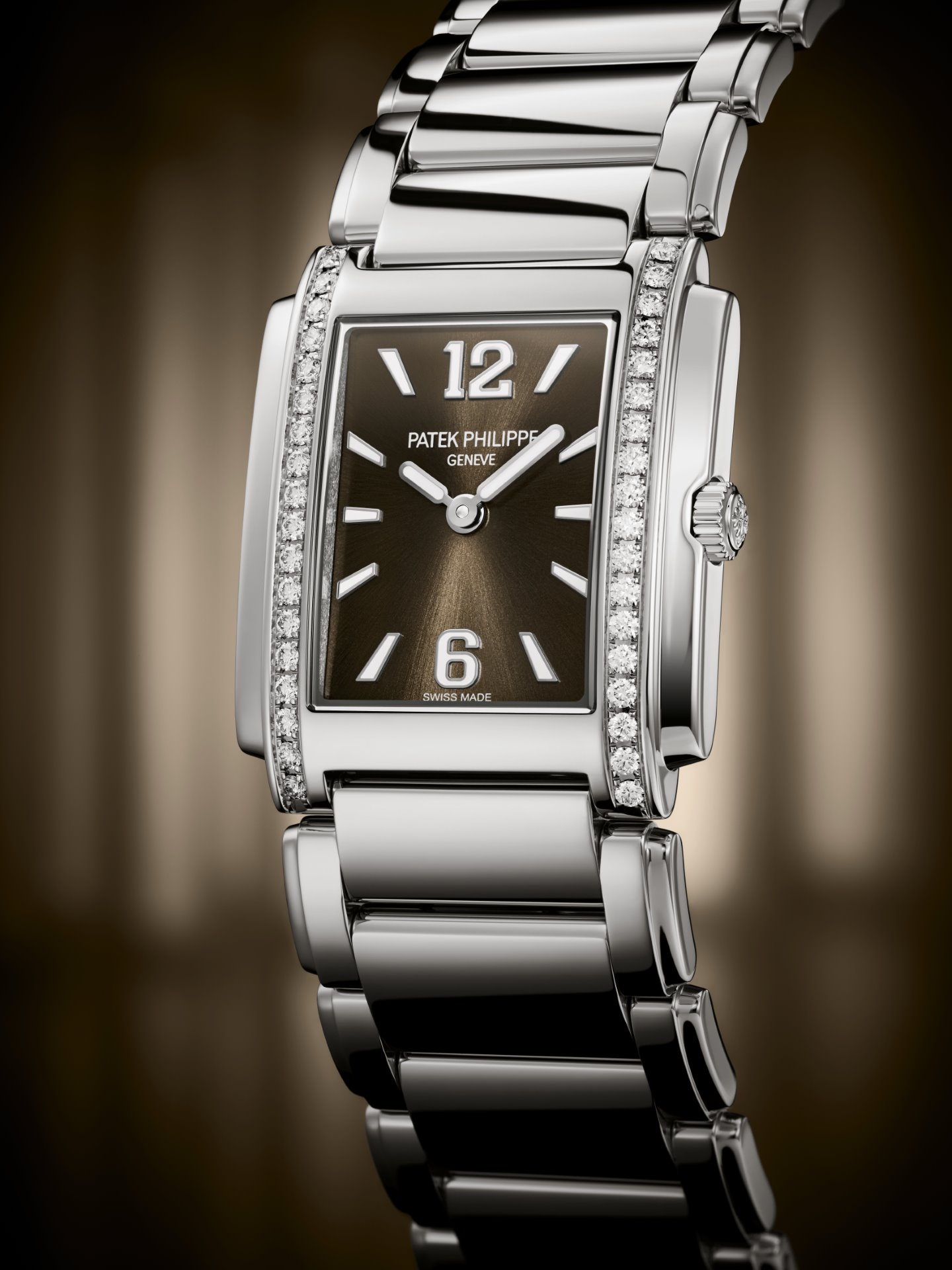 Blessed with its strong identity and a design tailor-made to live the lives of modern discerning women, the Twenty~4 quartz “manchette” model was a great success from the start and has established itself in the last two decades as one of the manufacture’s best-sellers. Over the years it has appeared in rose gold and white gold, with other dial colors (brown and blue), in a small format complementing the medium-size models, on satin straps, in dazzling Haute Joaillerie versions (including two endowed with manually wound mechanical movements) and in a yellow-gold model without diamonds on the case. Now seen as epitomizing the classic modern style, the Twenty~4 has represented, for many women, their right of entry into the Patek Philippe universe. It has consolidated the manufacture’s position as a major player in the women’s watch market and paved the way for the expansion of other women’s lines, such as the Calatravas, as well as the complications that are useful in everyday situations (the Annual Calendar, the time-zone watches and the chronographs) and even the grand complications (perpetual calendar, split-seconds chronograph and minute repeater).