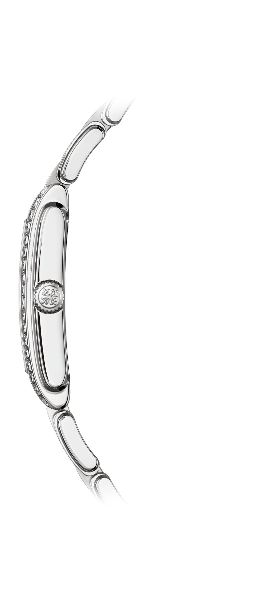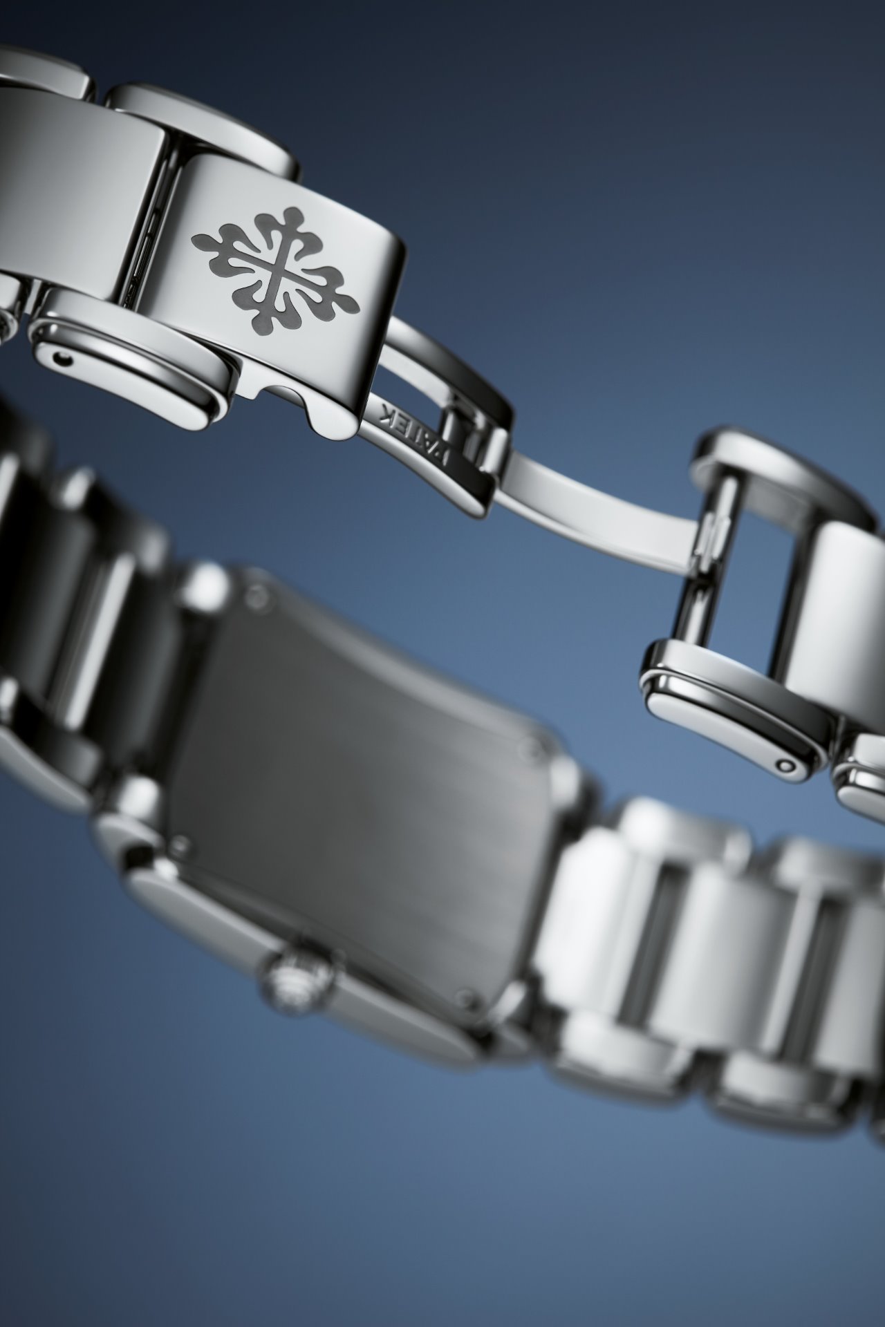 The distinctive shape of the two-tier rectangular case is underlined by two rows of 18 Top Wesselton Pure diamonds (approx. 0.42 ct) set with textbook precision. A Calatrava Cross, emblem of the Patek Philippe manufacture, embellishes the crown. The supple, comfortable bracelet, fitted with a fold-over clasp, is a jewel in its own right. Each component is manually finished and fully polished. The Patek Philippe caliber E15 quartz movement is made with the same devotion to fine workmanship as the manufacture’s mechanical movements. The new references 4910/1200A-001 and 4910/1200A-010 with Arabic numerals replace the previous references 4910/10A-001, 4910/10A-010, 4910/10A-011 and 4910/10A-012 with Roman numerals.