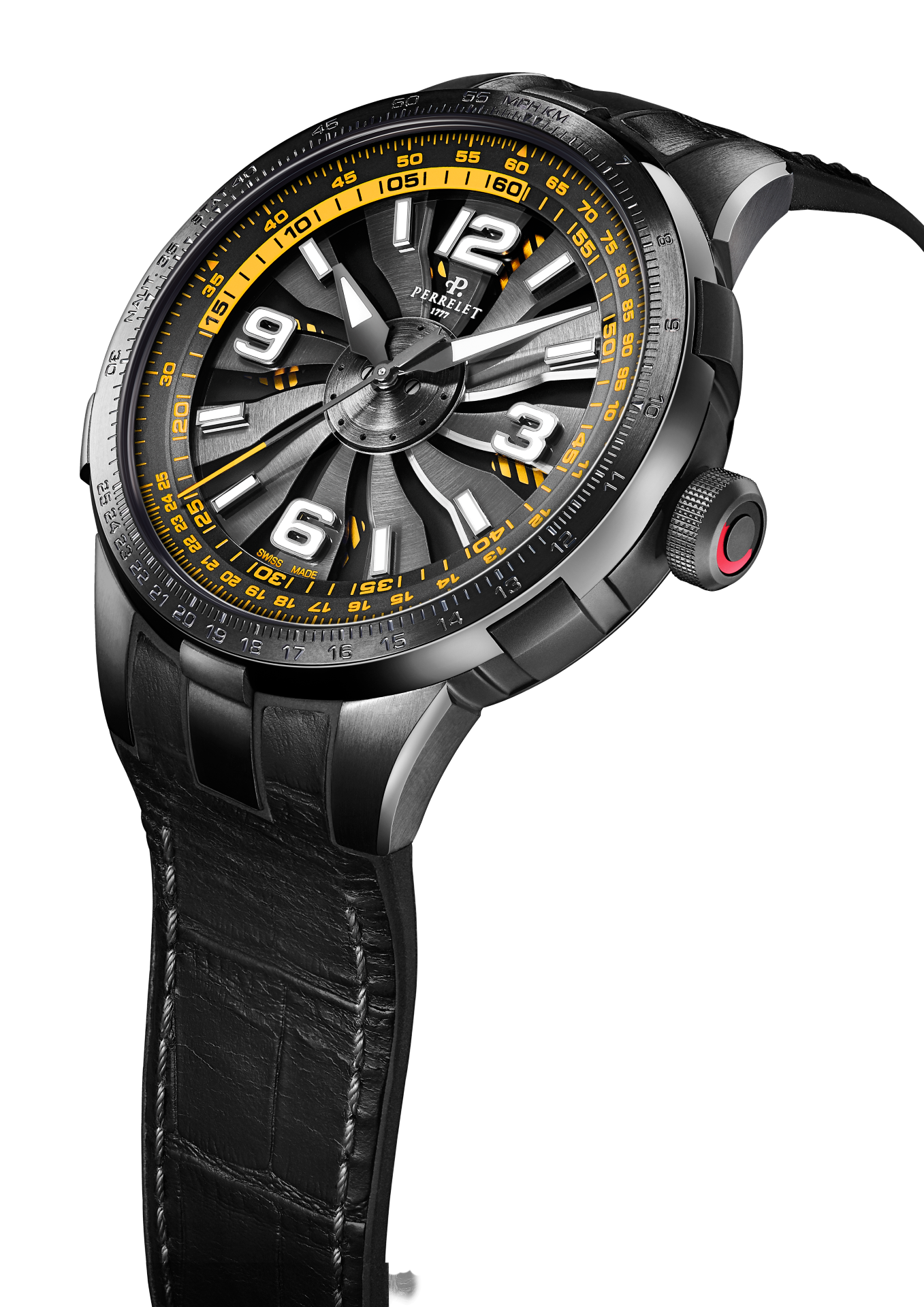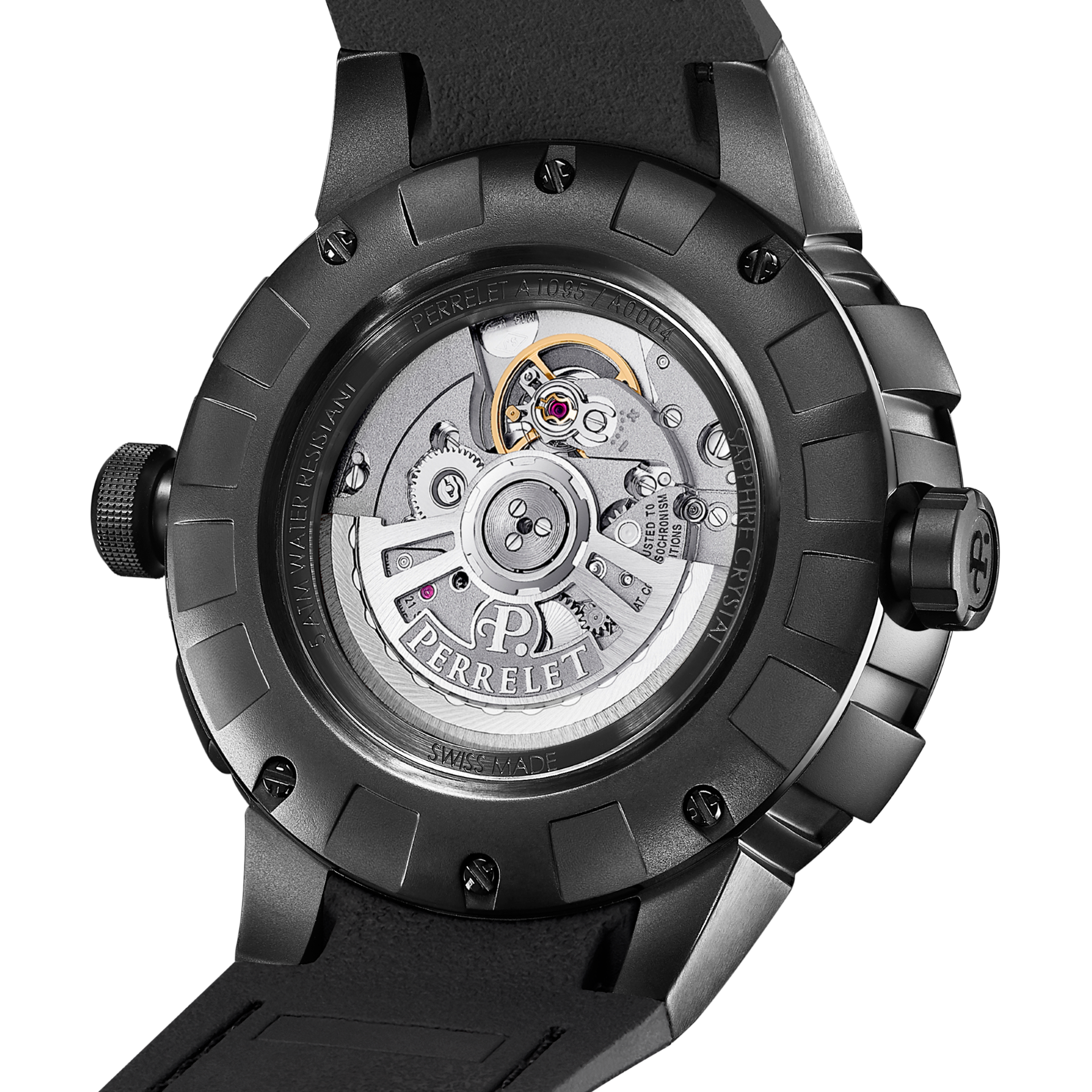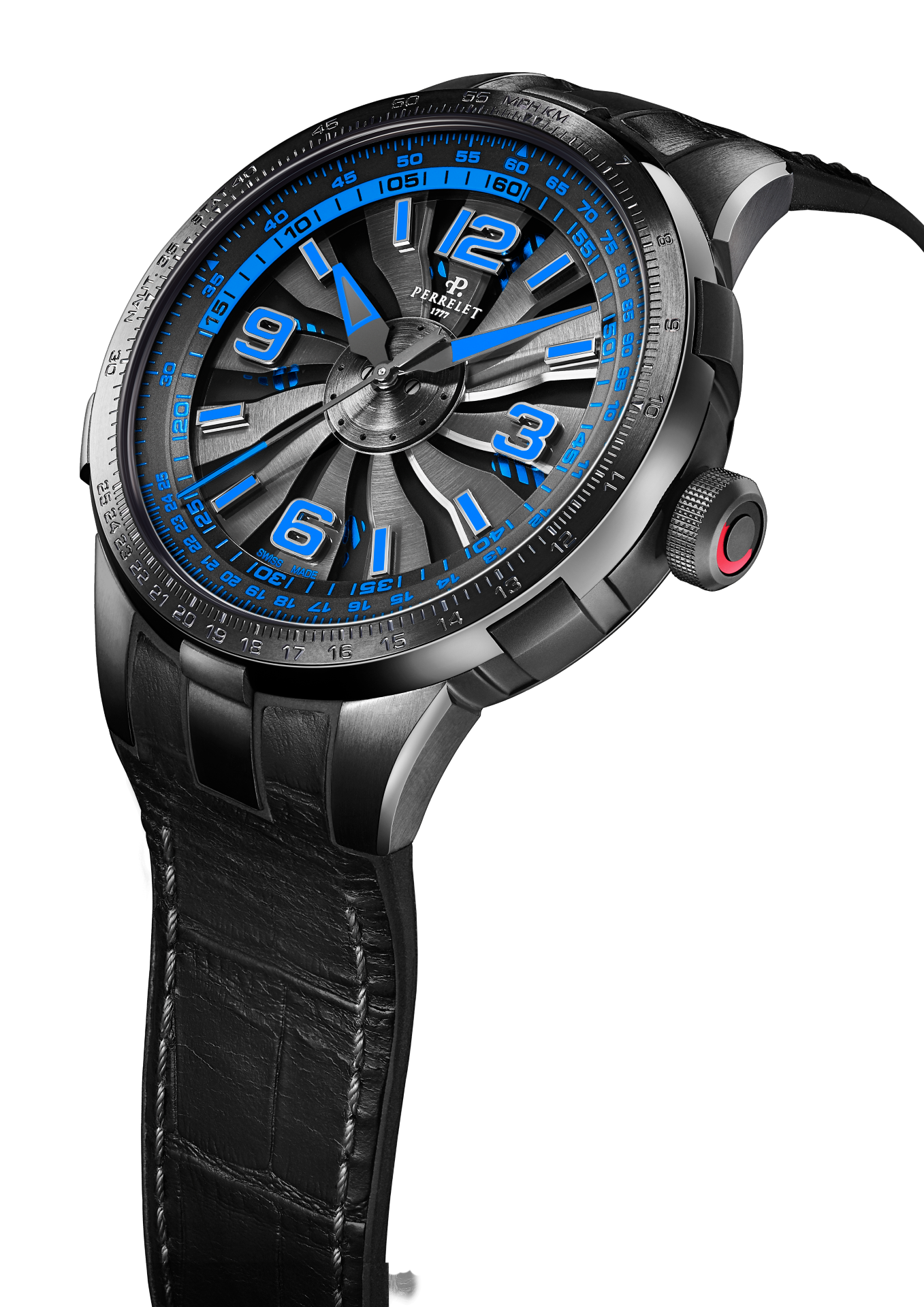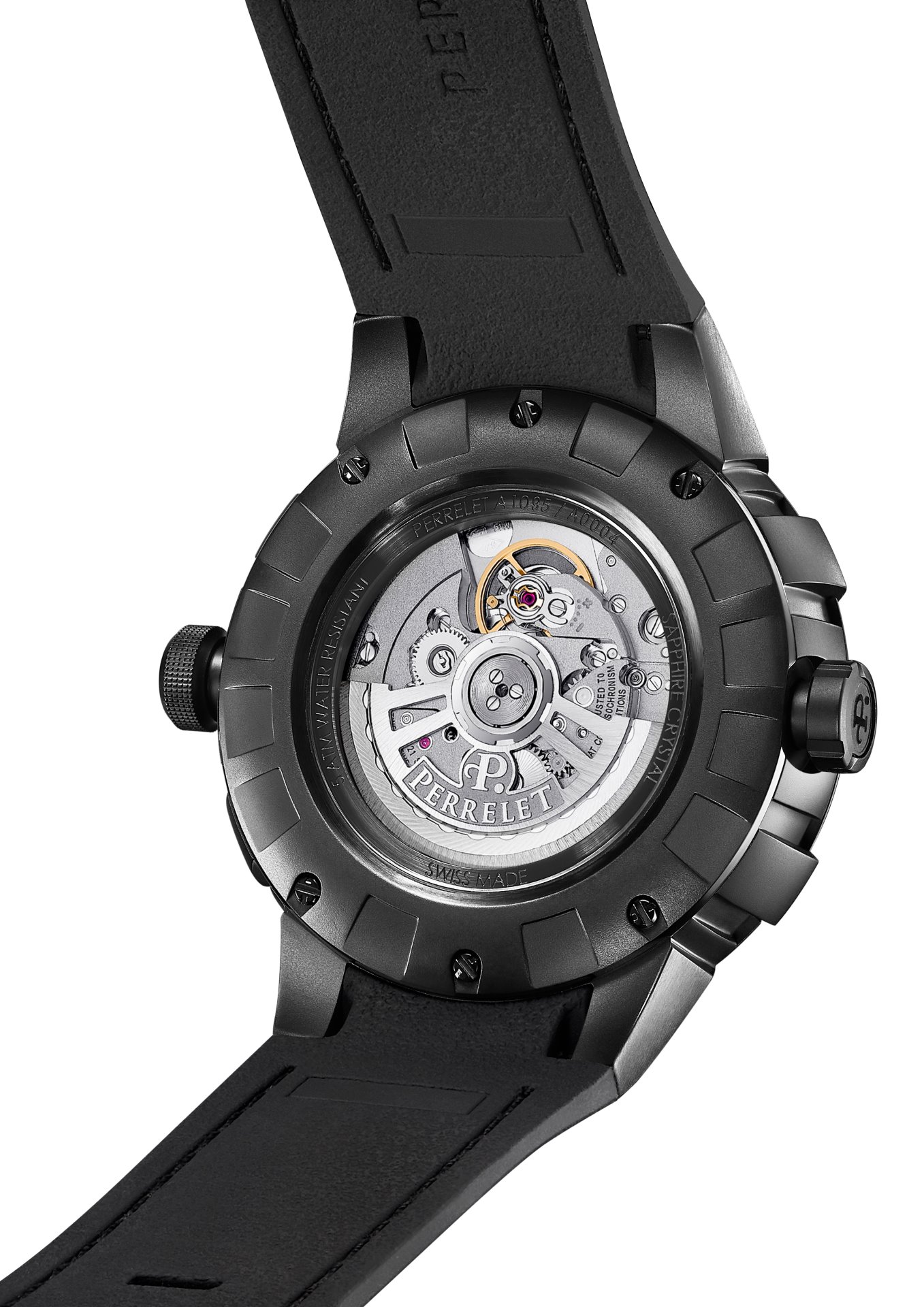 - Bi-material rubber- black leather strap with alligator pattern and black PVD stainless steel folding clasp customised with the Perrelet logo for the versions with electric blue, red and yellow dial’s details.
