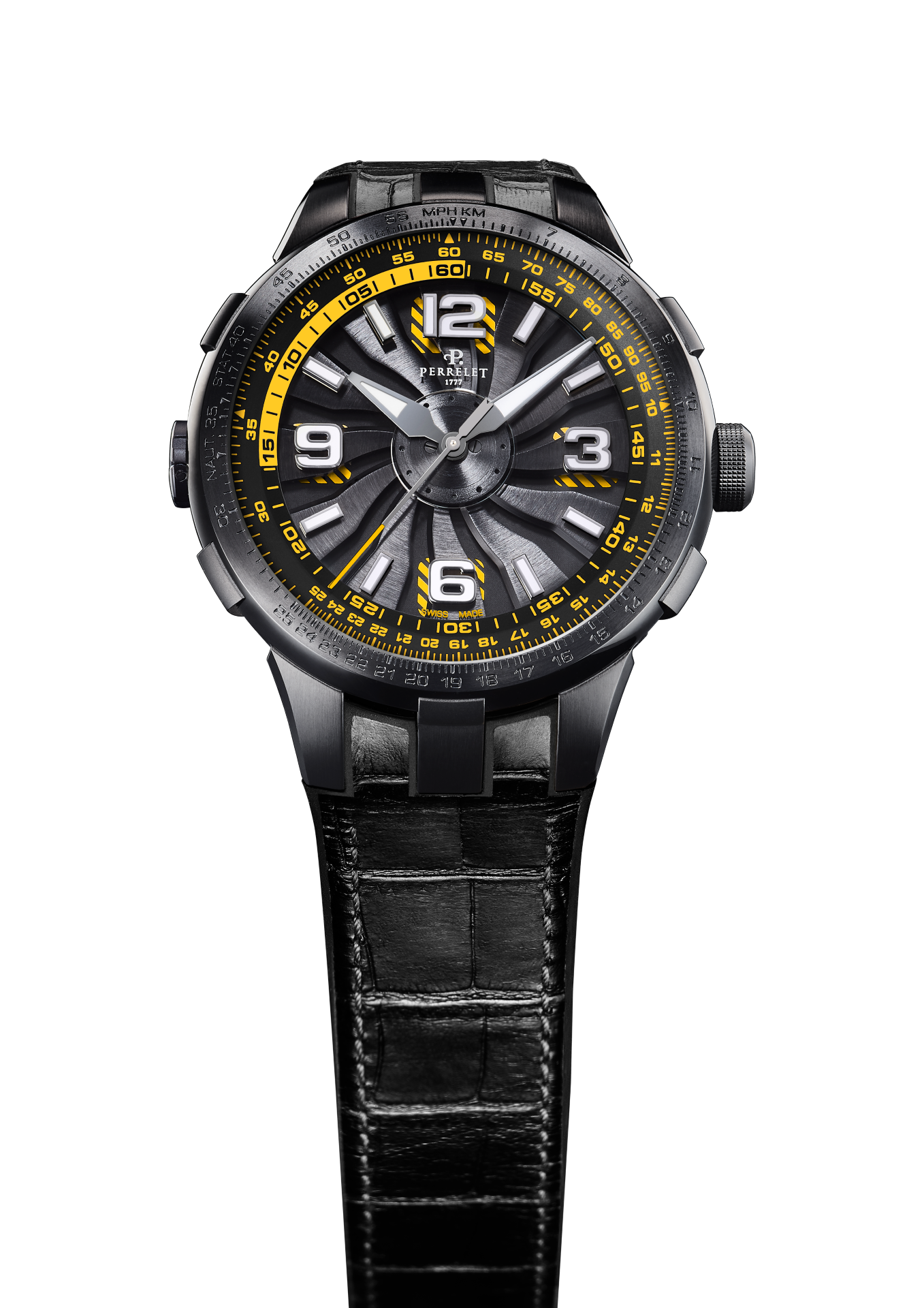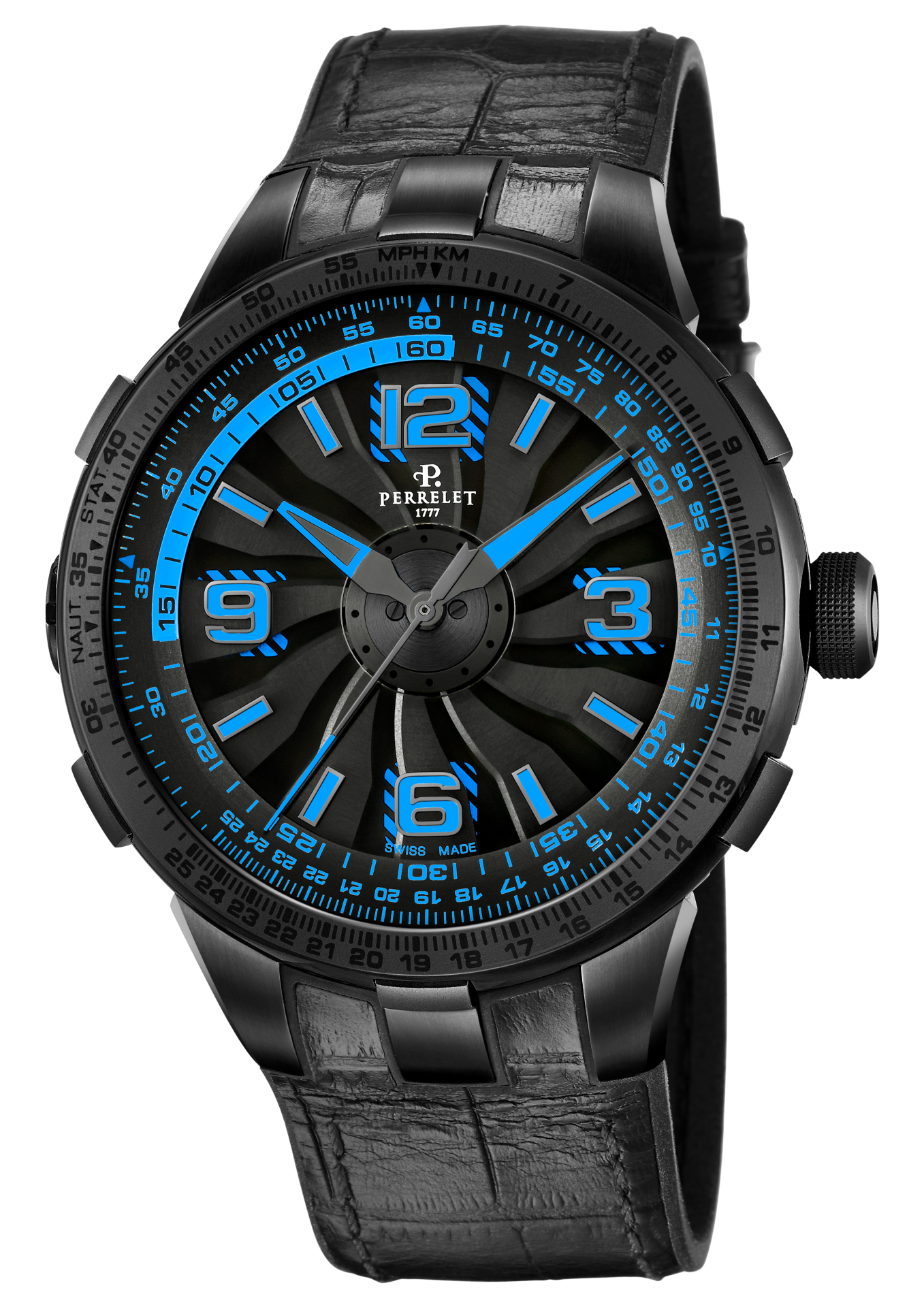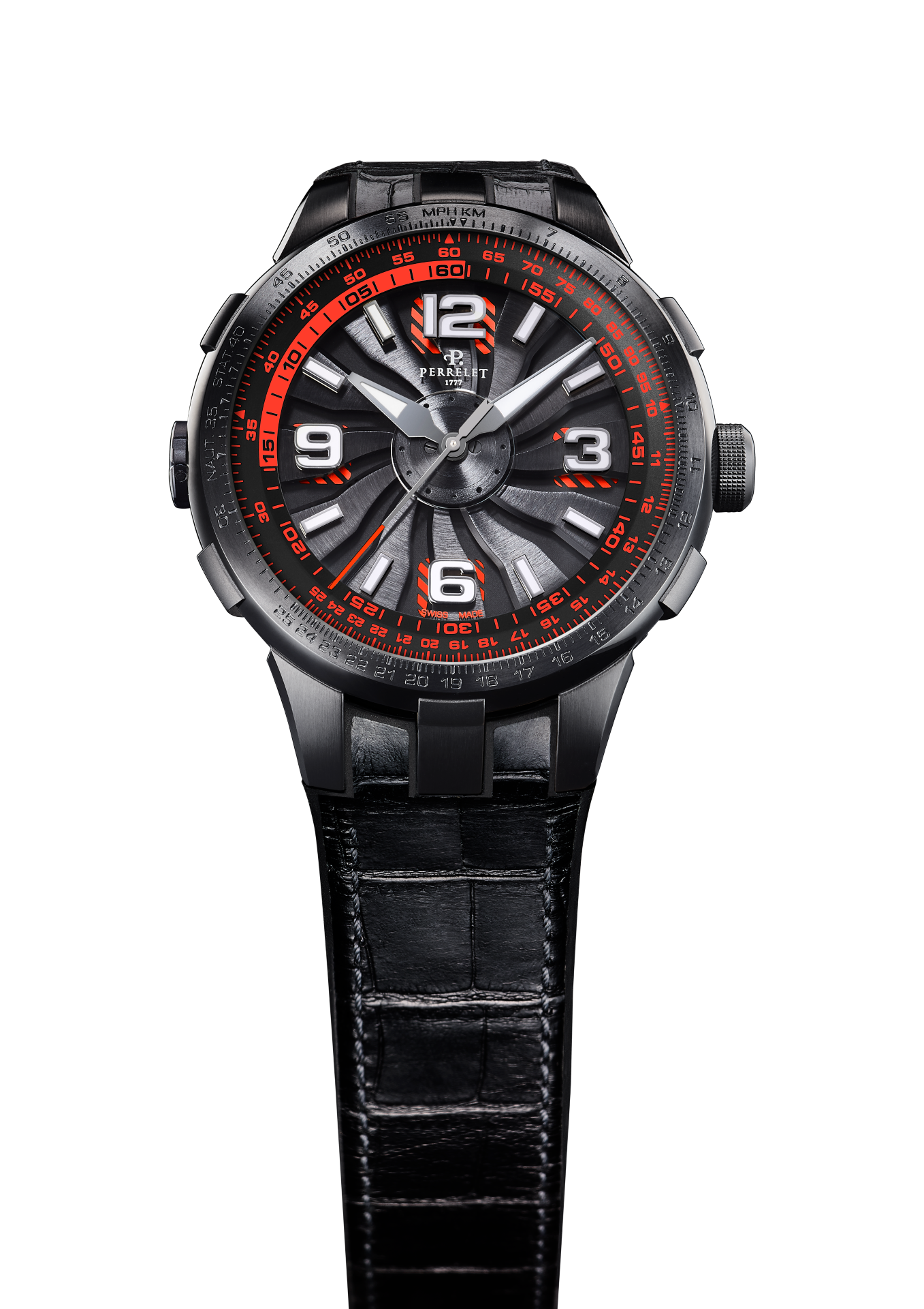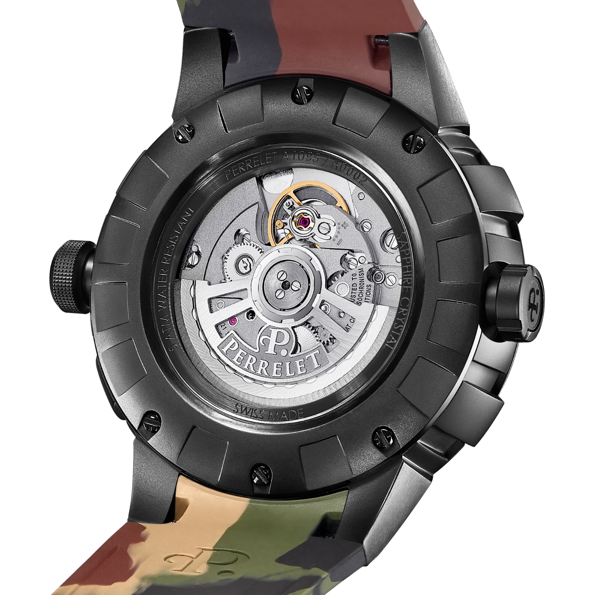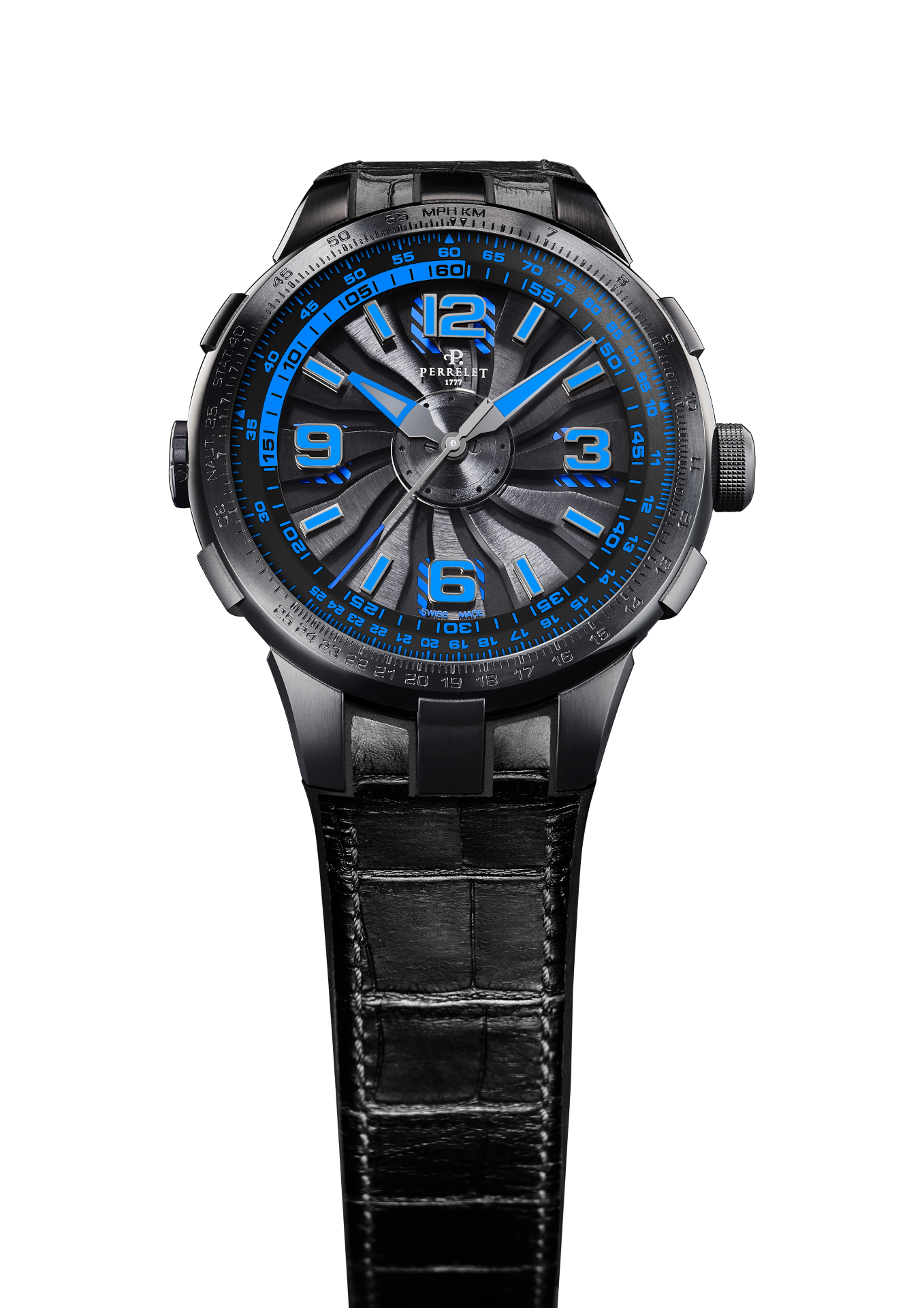 - Bi-material rubber- black leather strap with alligator pattern and black PVD stainless steel folding clasp customised with the Perrelet logo for the versions with electric blue, red and yellow dial’s details.