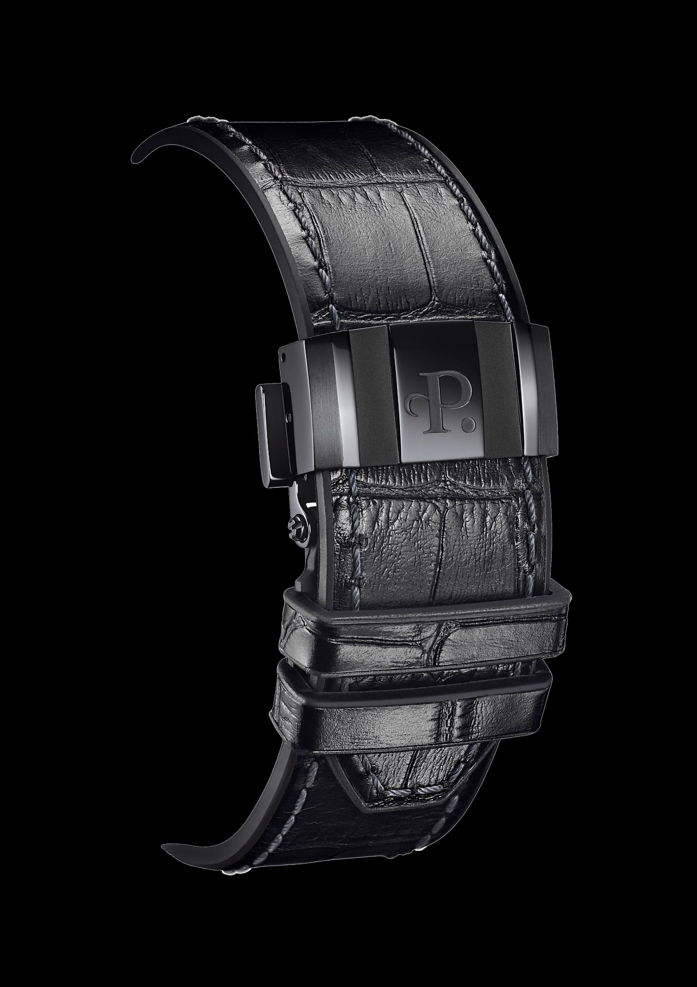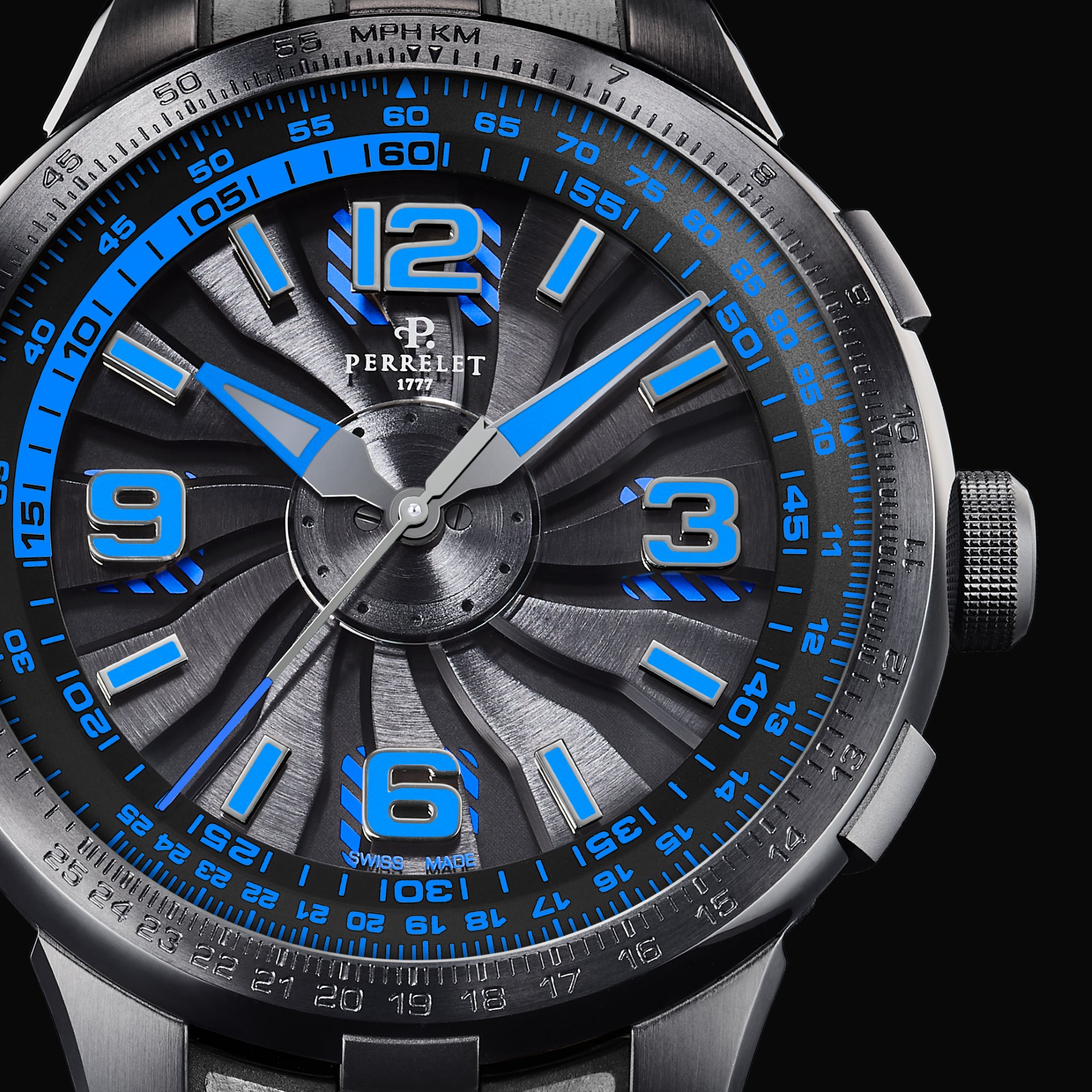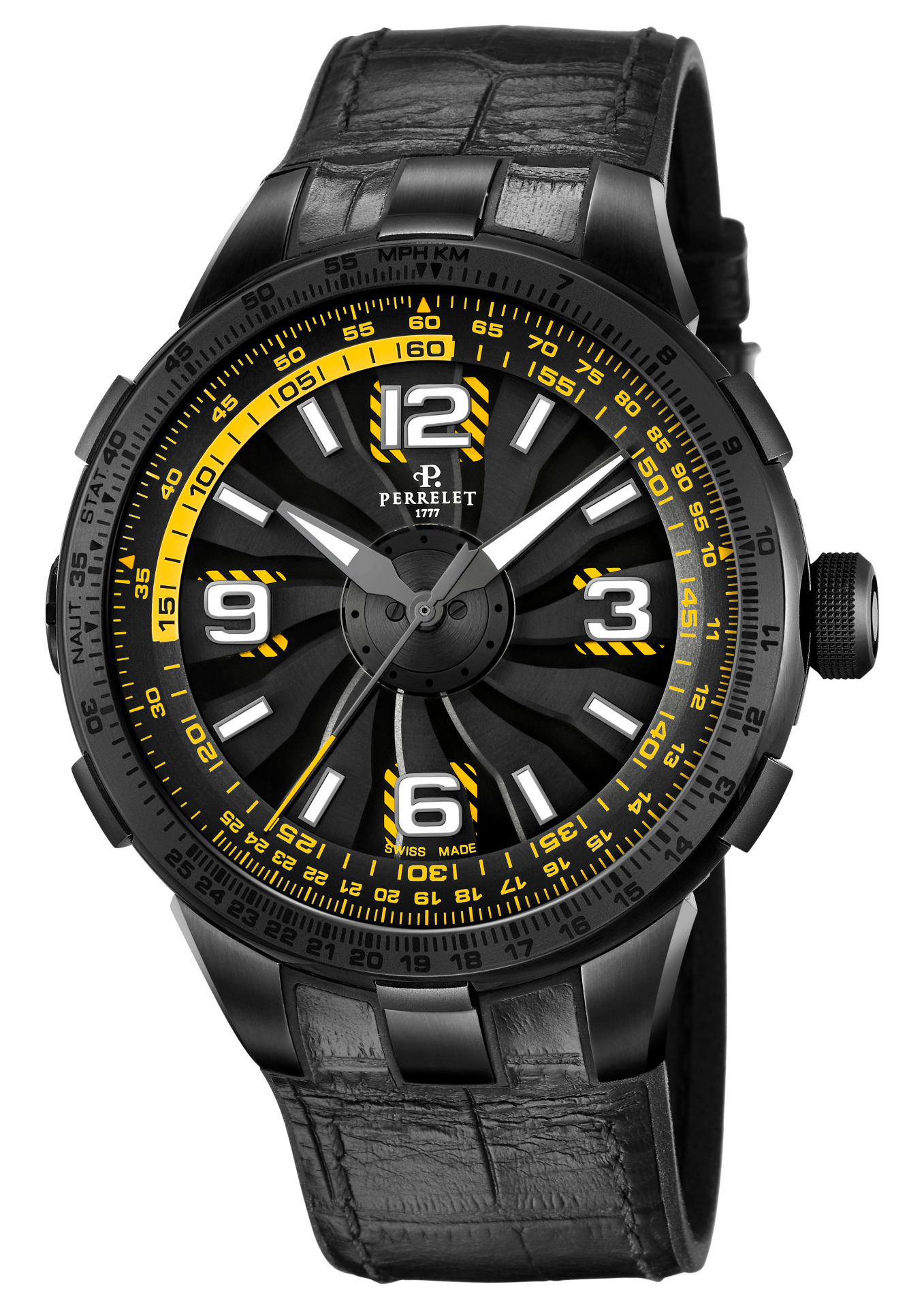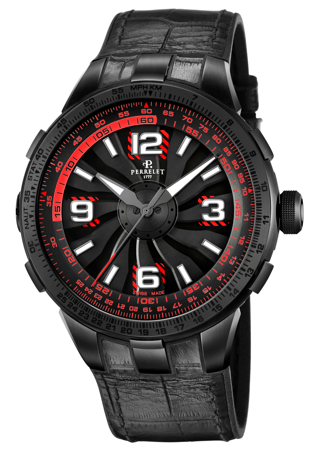 - Bi-material rubber- black leather strap with alligator pattern and black PVD stainless steel folding clasp customised with the Perrelet logo for the versions with electric blue, red and yellow dial’s details.