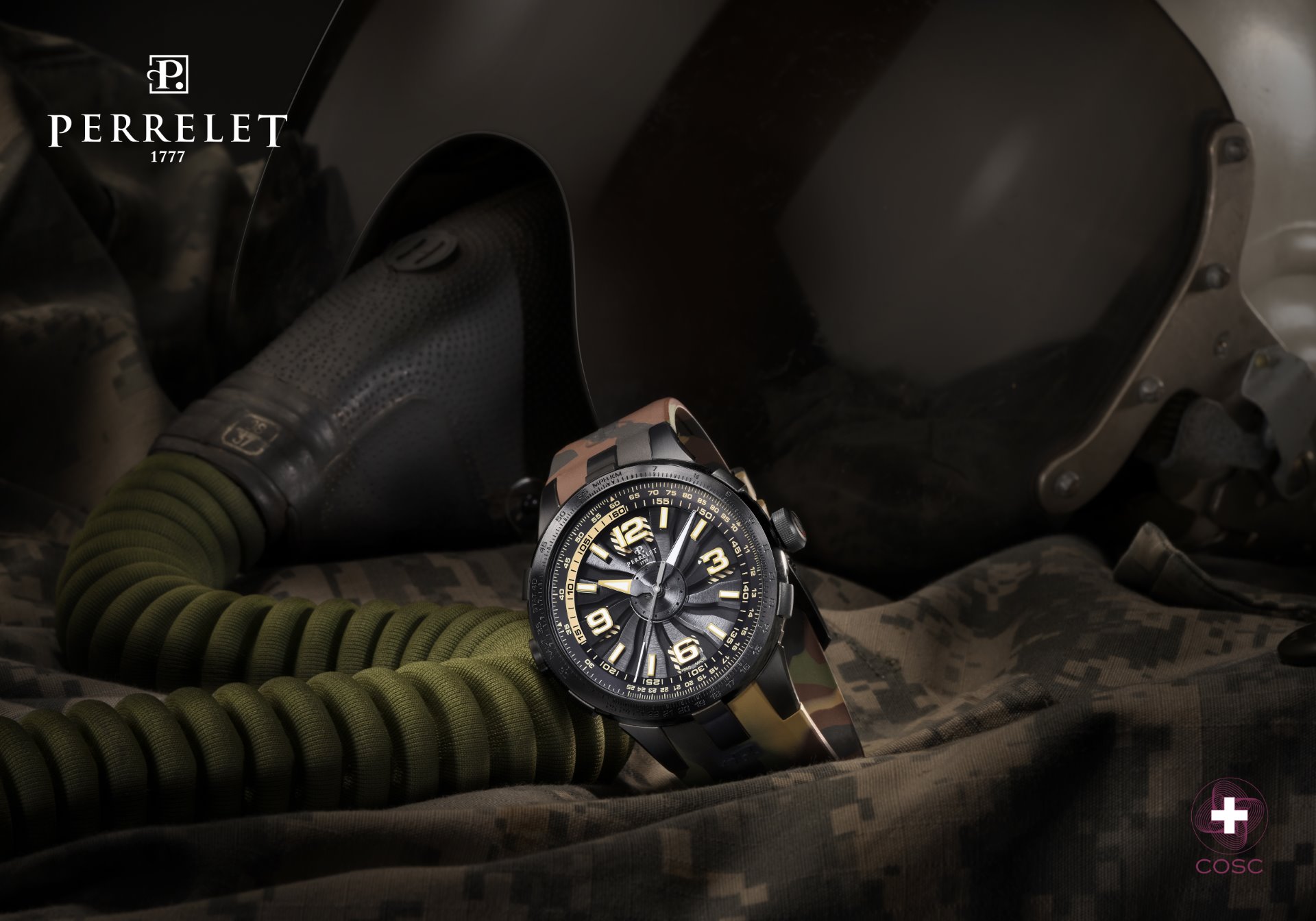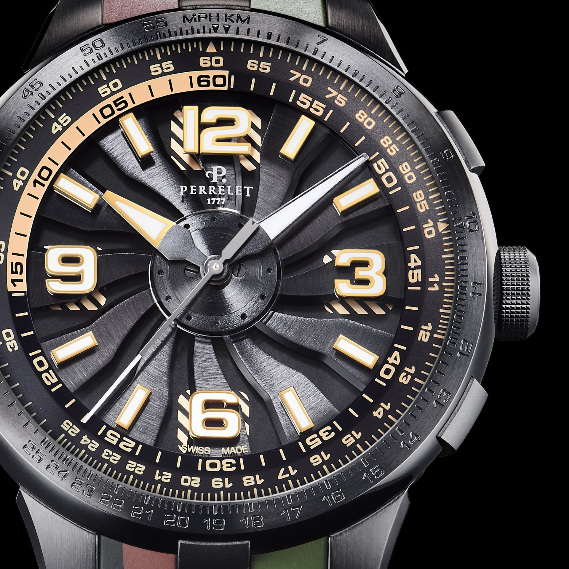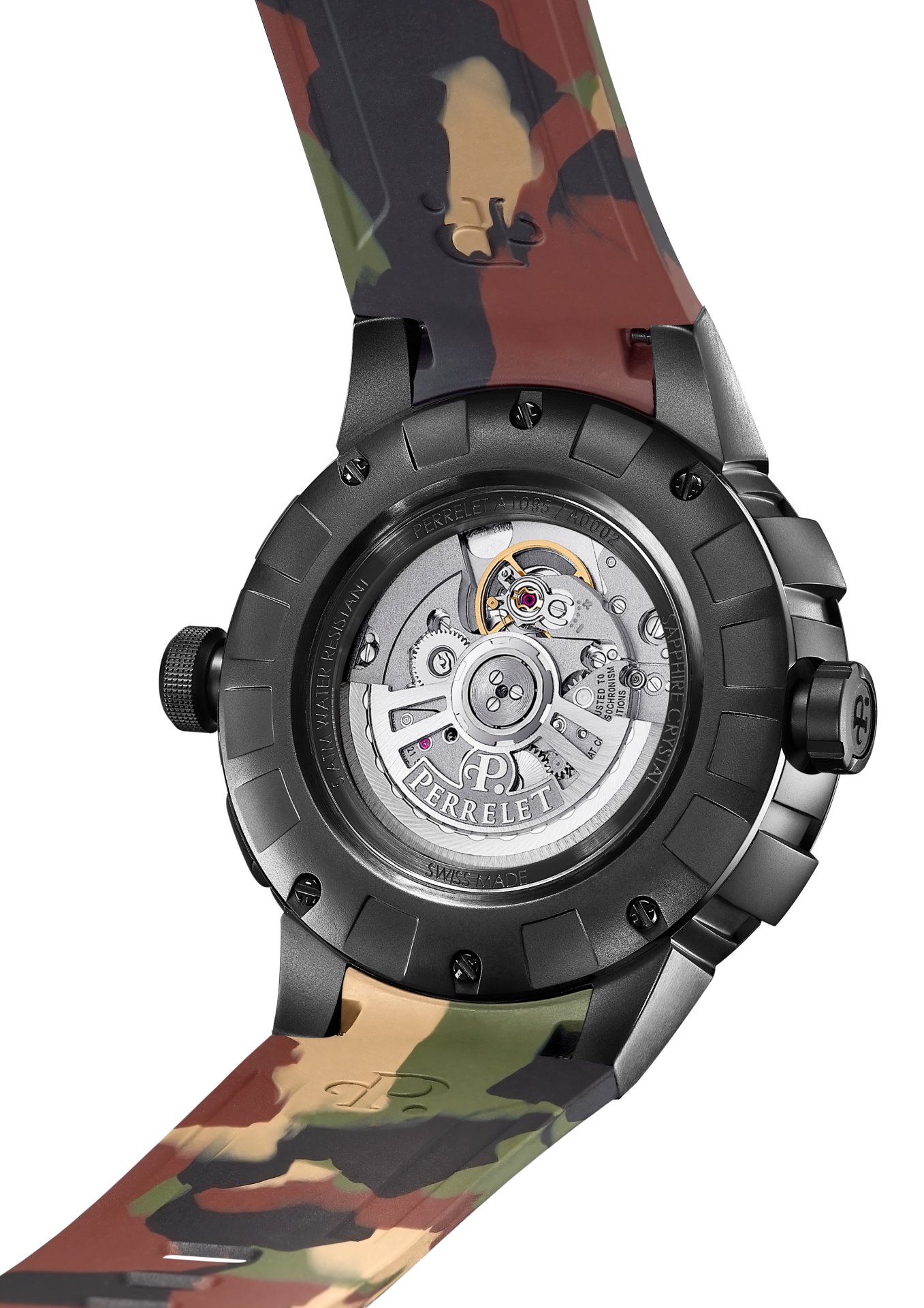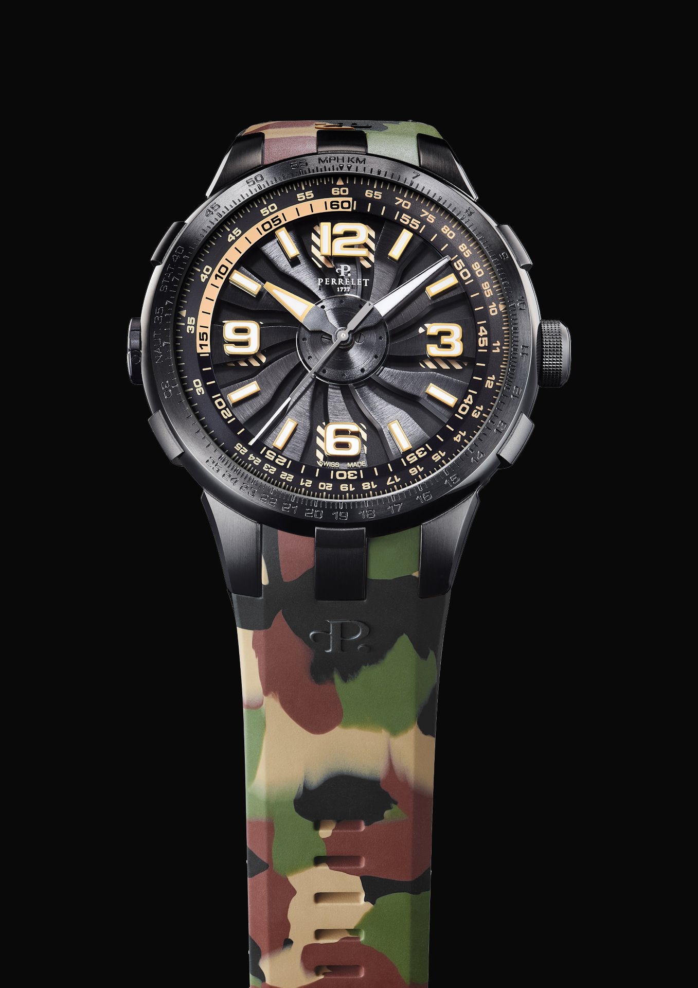 To complete the package, the new “Turbine Pilot” models come with a bi-material strap (Rubber/Leather) with alligator pattern and deployant buckle with black PVD customised with the Perrelet logo. A fourth model with a rubber strap with camo pattern and black PVD pin buckle offers a more relaxed look.