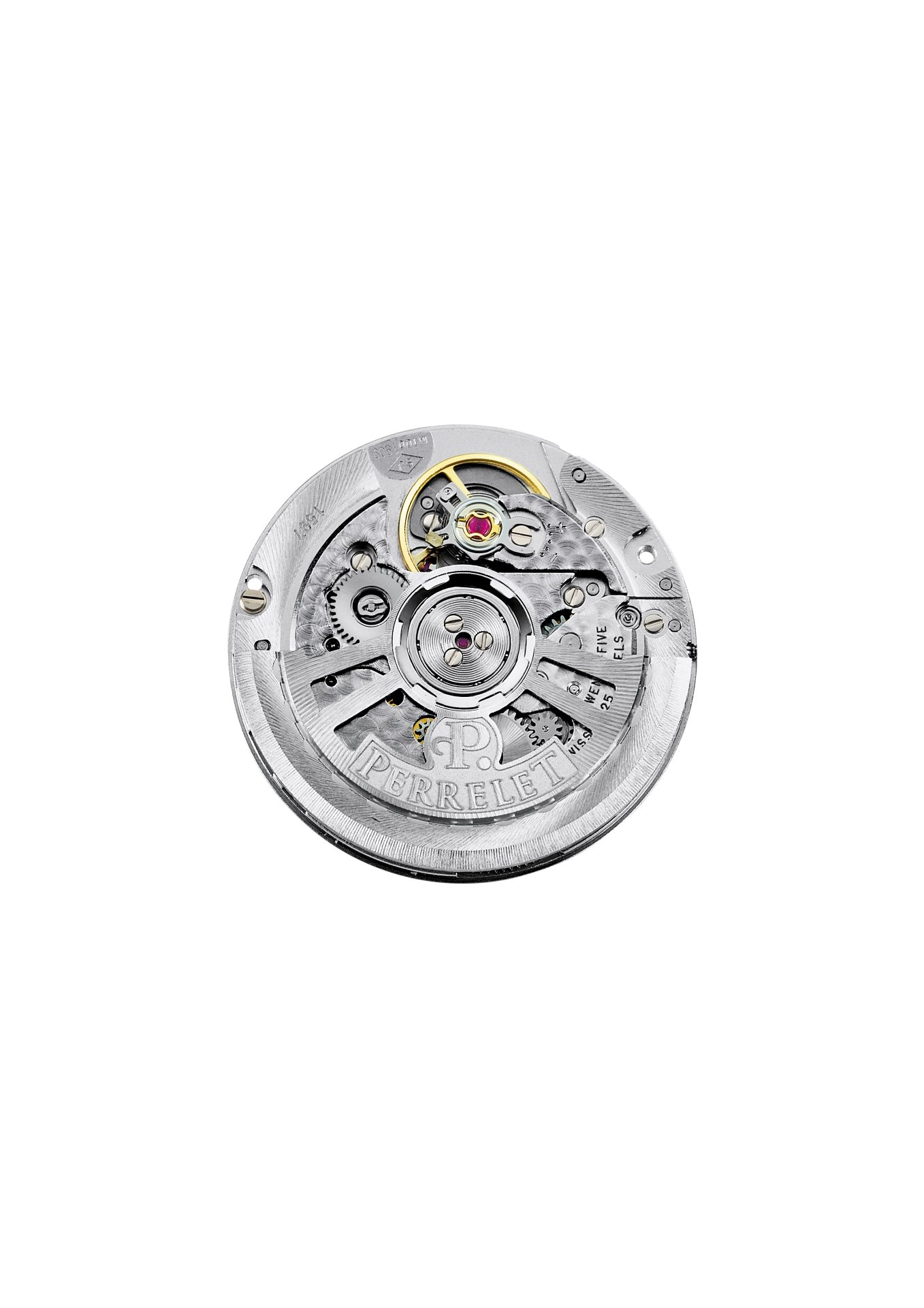 - Open-worked and rhodium-plated oscillating weight with Perrelet logo