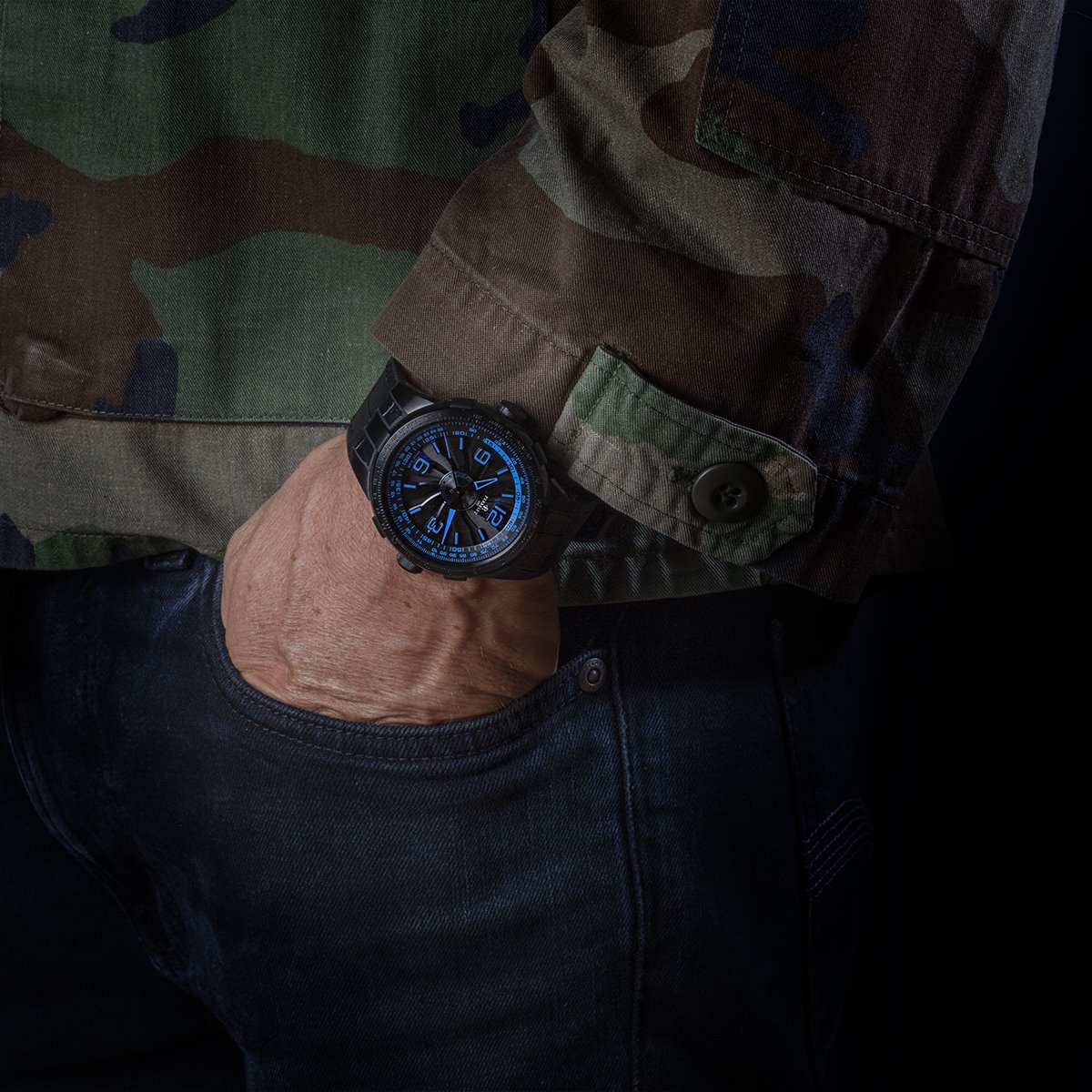 - Black under-dial with electric blue stripes