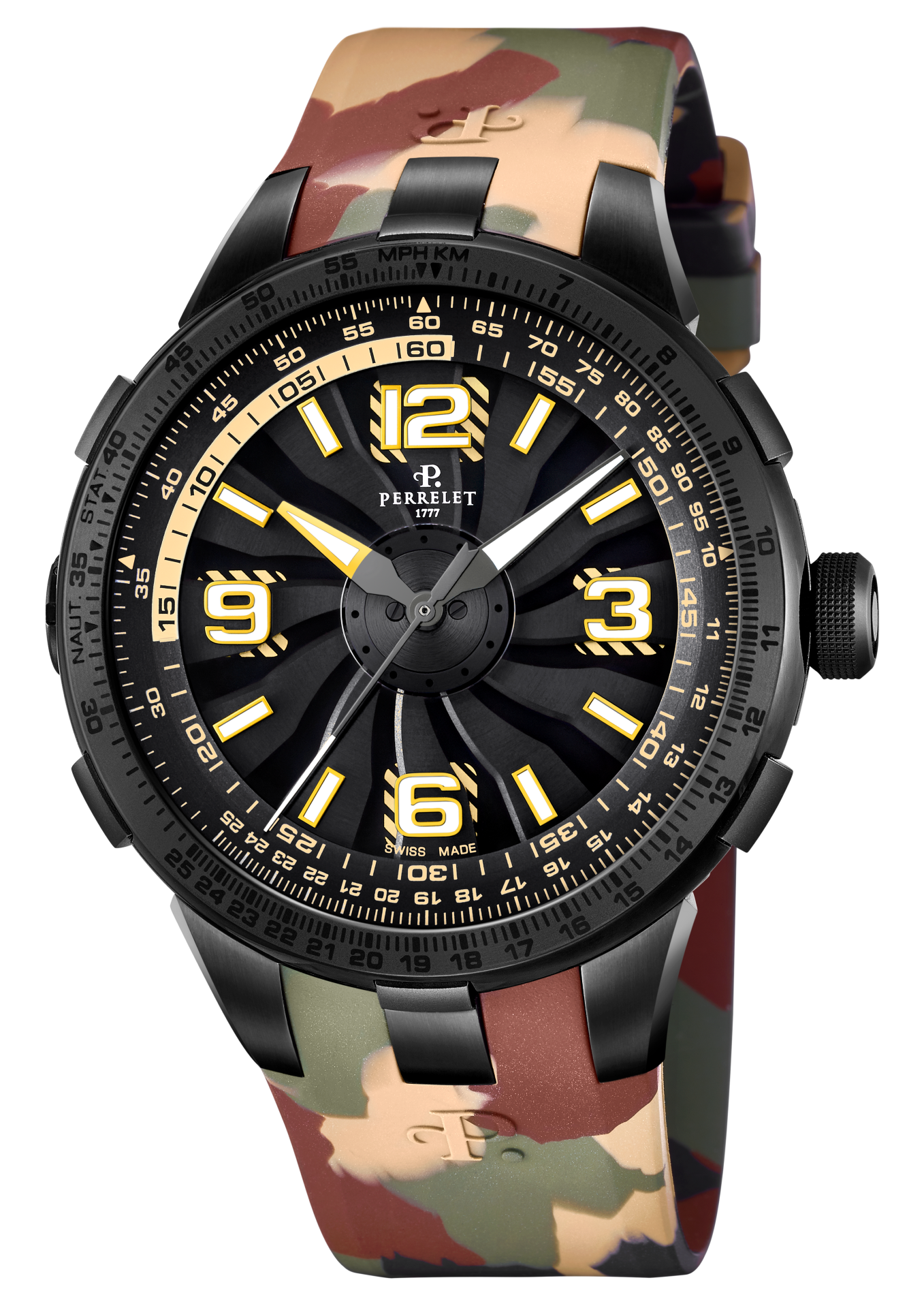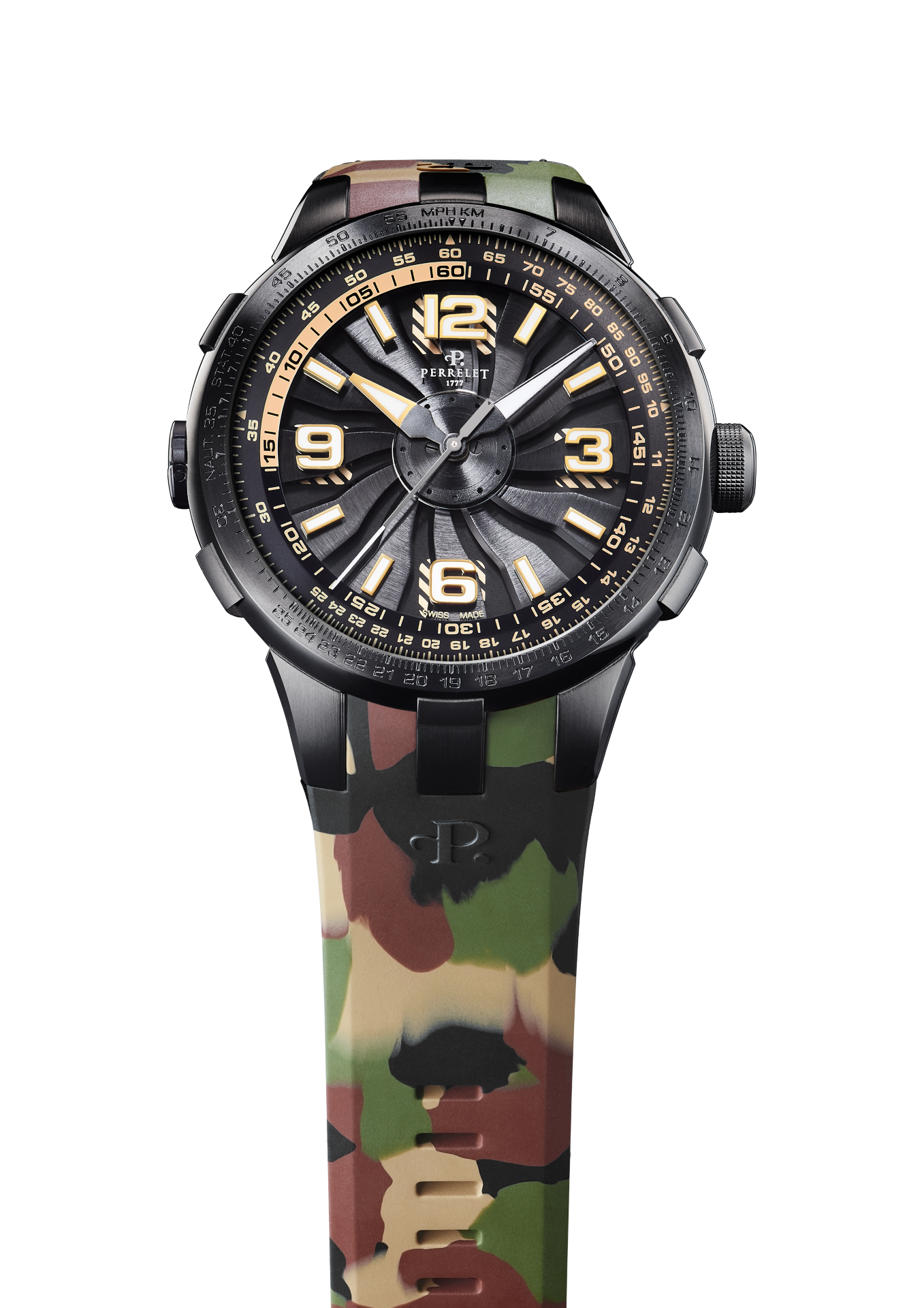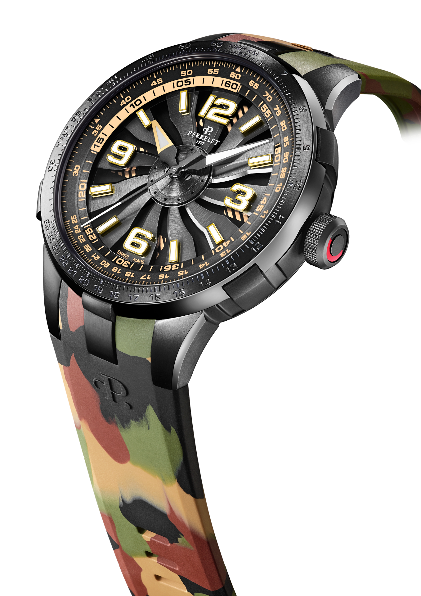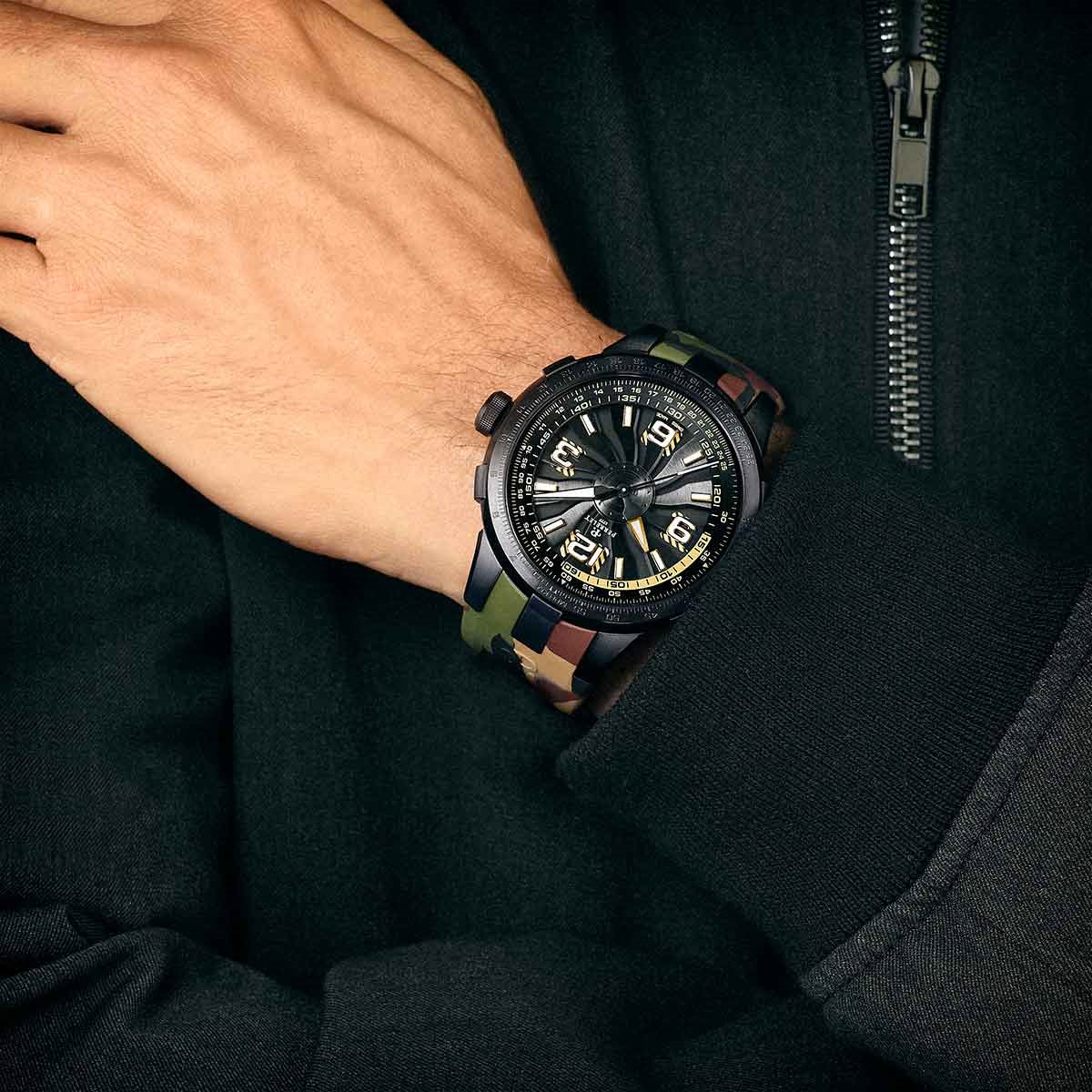 Perrelet has always displayed a mastery of colour in its Turbine Technology timepieces. Three of the new “Turbine Pilot” protagonists feature bright, vivid colours like electric blue, red and yellow. A fourth version dons a camouflage rubber strap decorated with the classic mottled greens, browns and beige tones of this specific colouration pattern used for concealment.