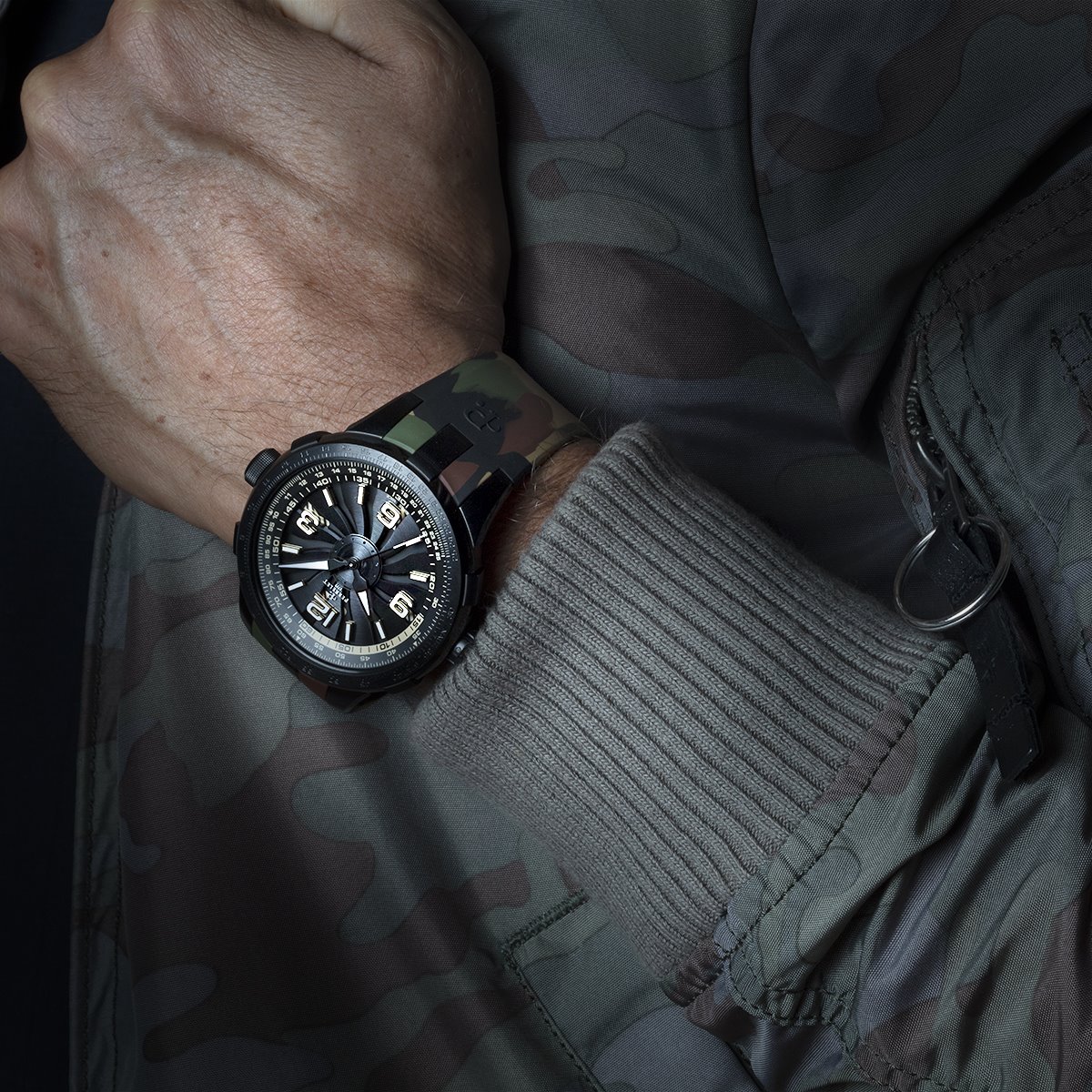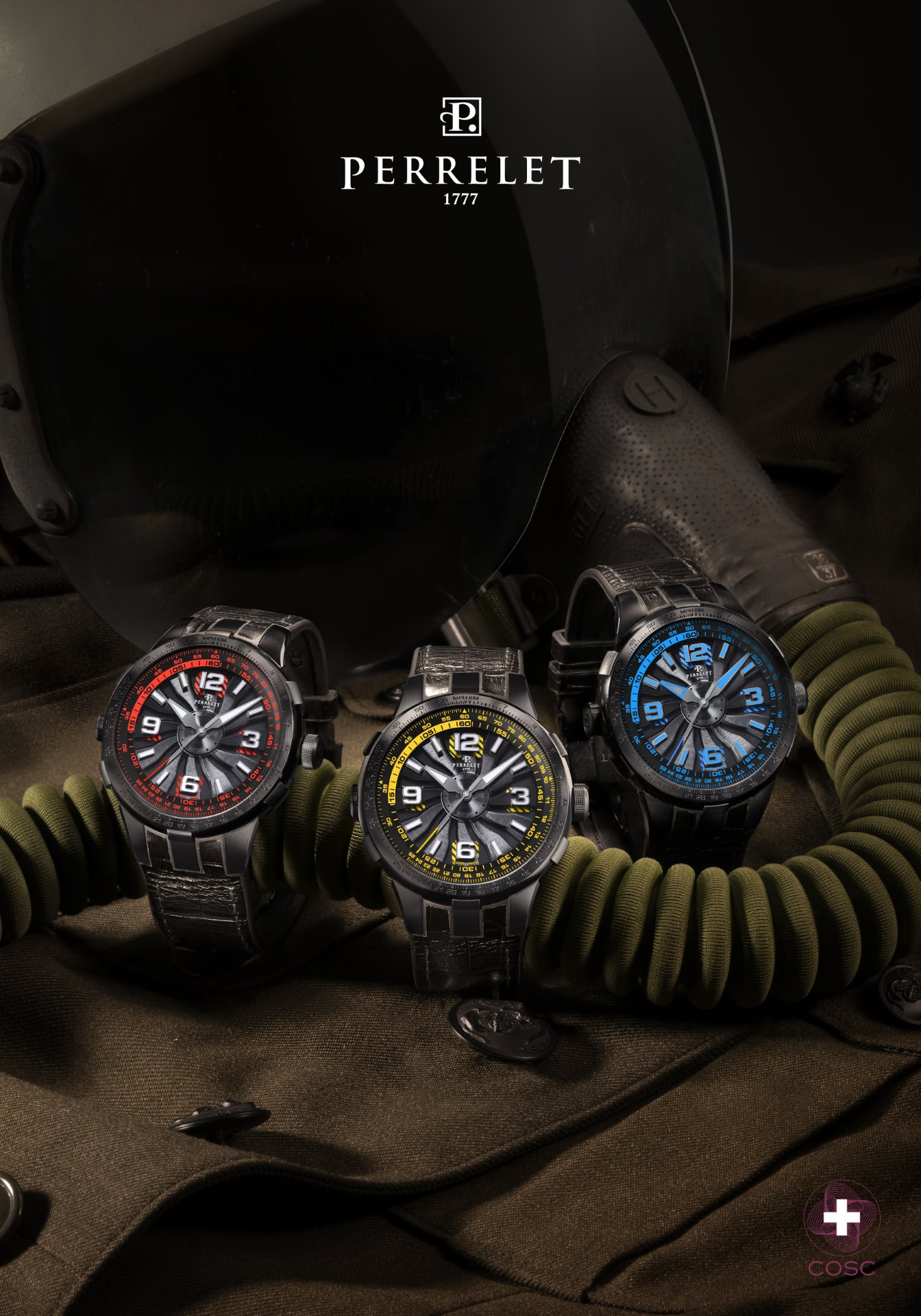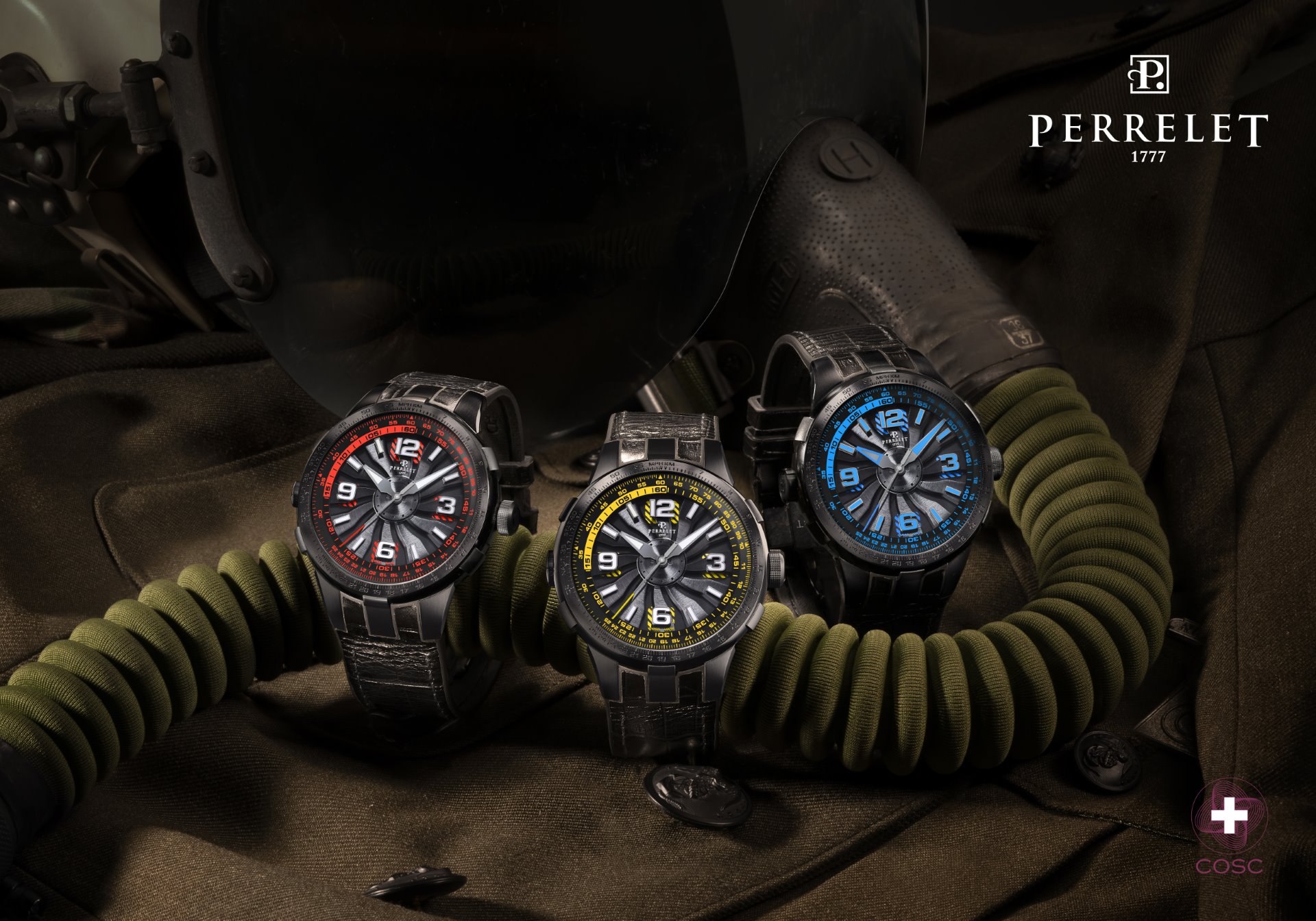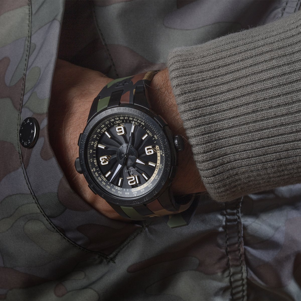Perrelet has always displayed a mastery of colour in its Turbine Technology timepieces. Three of the new “Turbine Pilot” protagonists feature bright, vivid colours like electric blue, red and yellow. A fourth version dons a camouflage rubber strap decorated with the classic mottled greens, browns and beige tones of this specific colouration pattern used for concealment.