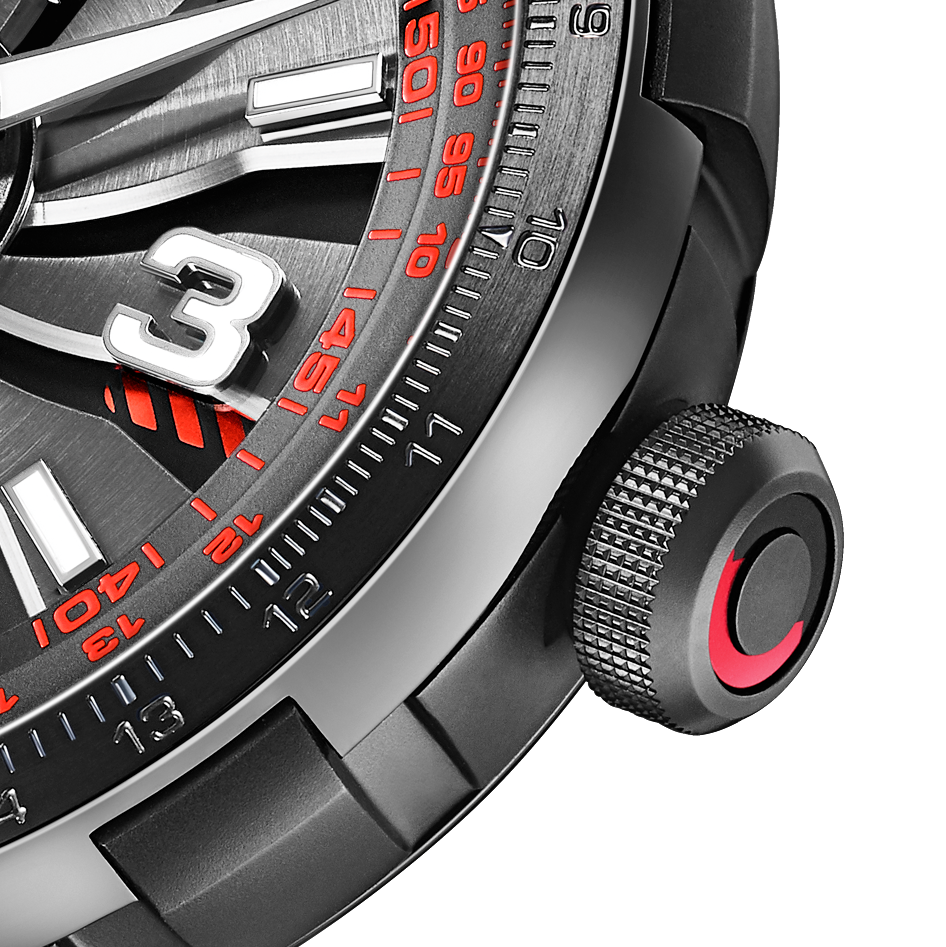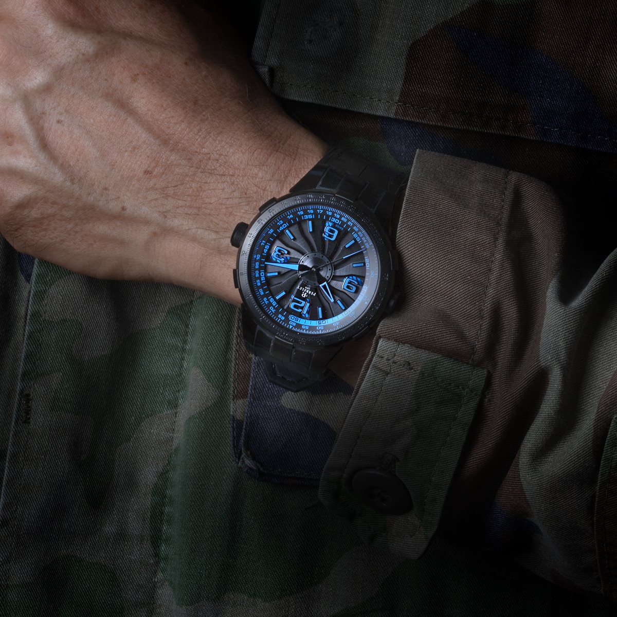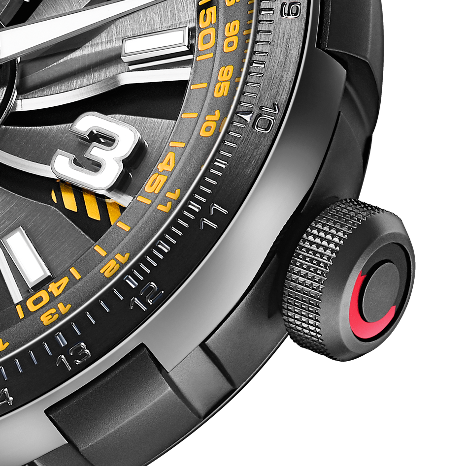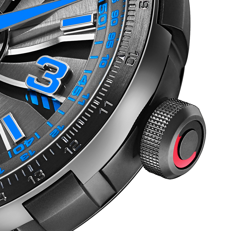 To ensure optimal legibility in all light conditions, the indices and Arabic numerals at 3, 6, 9 and 12 o’clock, which are applied on sapphire crystal disc above the turbine, are luminescent, as are the hands. On the electric blue and camouflage rubber strap models, for example, the hour hand is picked out in the same colour as the stripes below the blades. The peripheral slide rule scales on the flange and the tip of the central seconds hand on all four models also match the colour of the stripes. The bidirectional rotating bezel is activated by the crown at 3 o’clock, while the time is adjusted via the integrated crown at 9 o’clock.