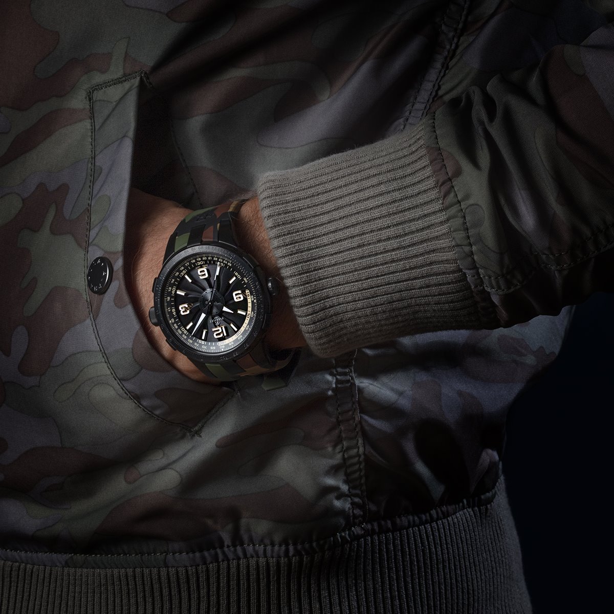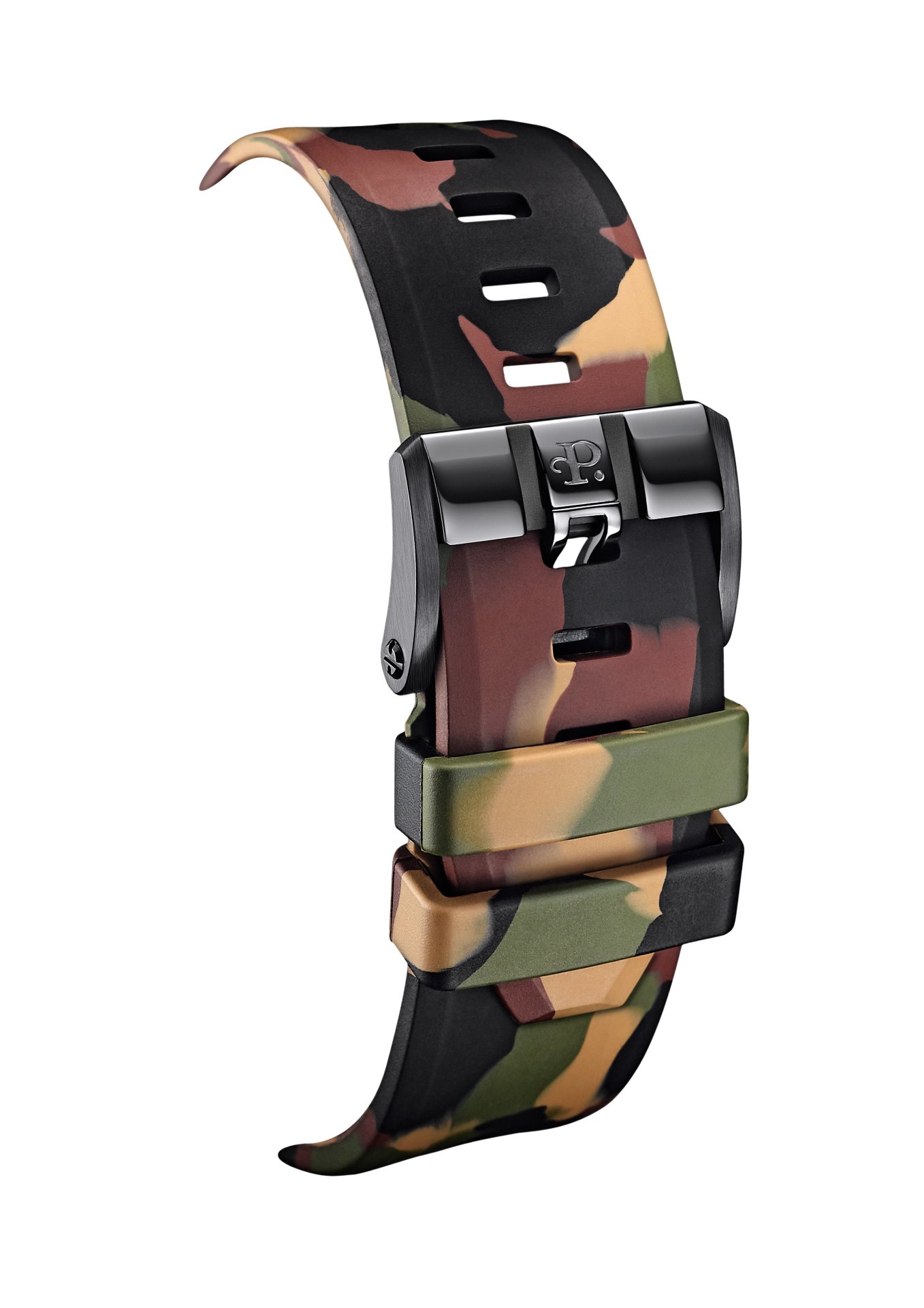 - Rubber strap with camo pattern equipped with a black PVD stainless steel pin buckle for the version with beige dial’s details.