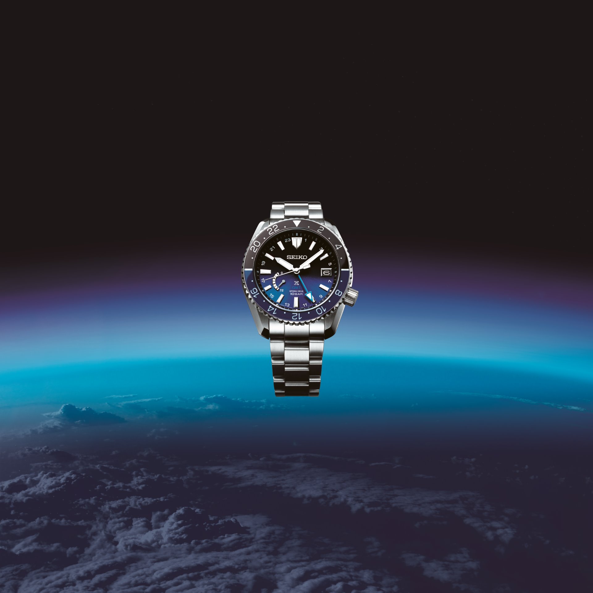 The stratosphere’s change in colour from black to blue is expressed in the graded dial and the two-tone colour bezel.