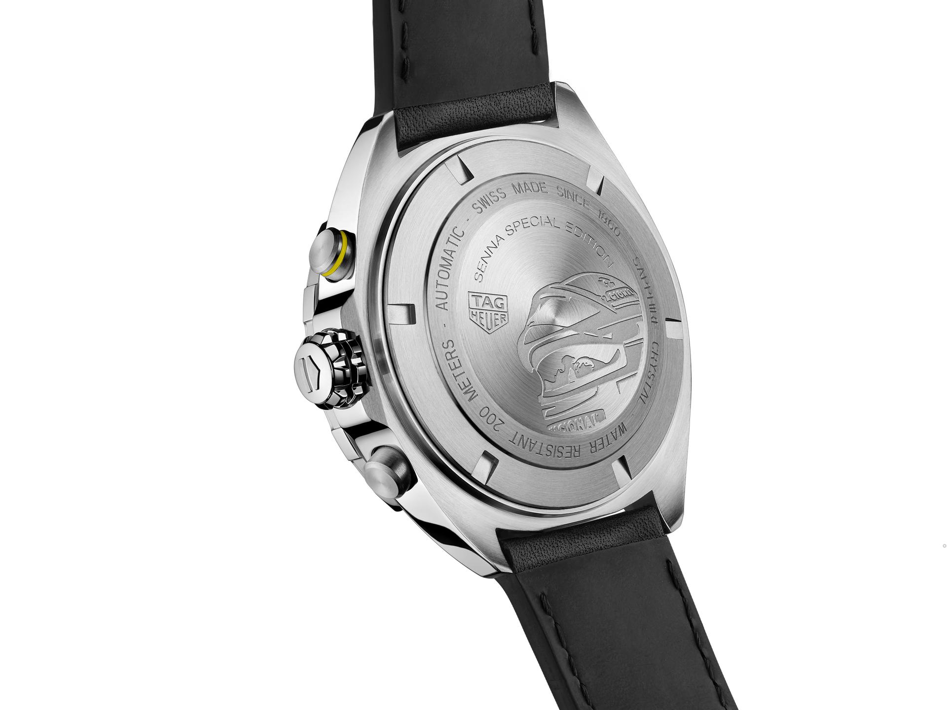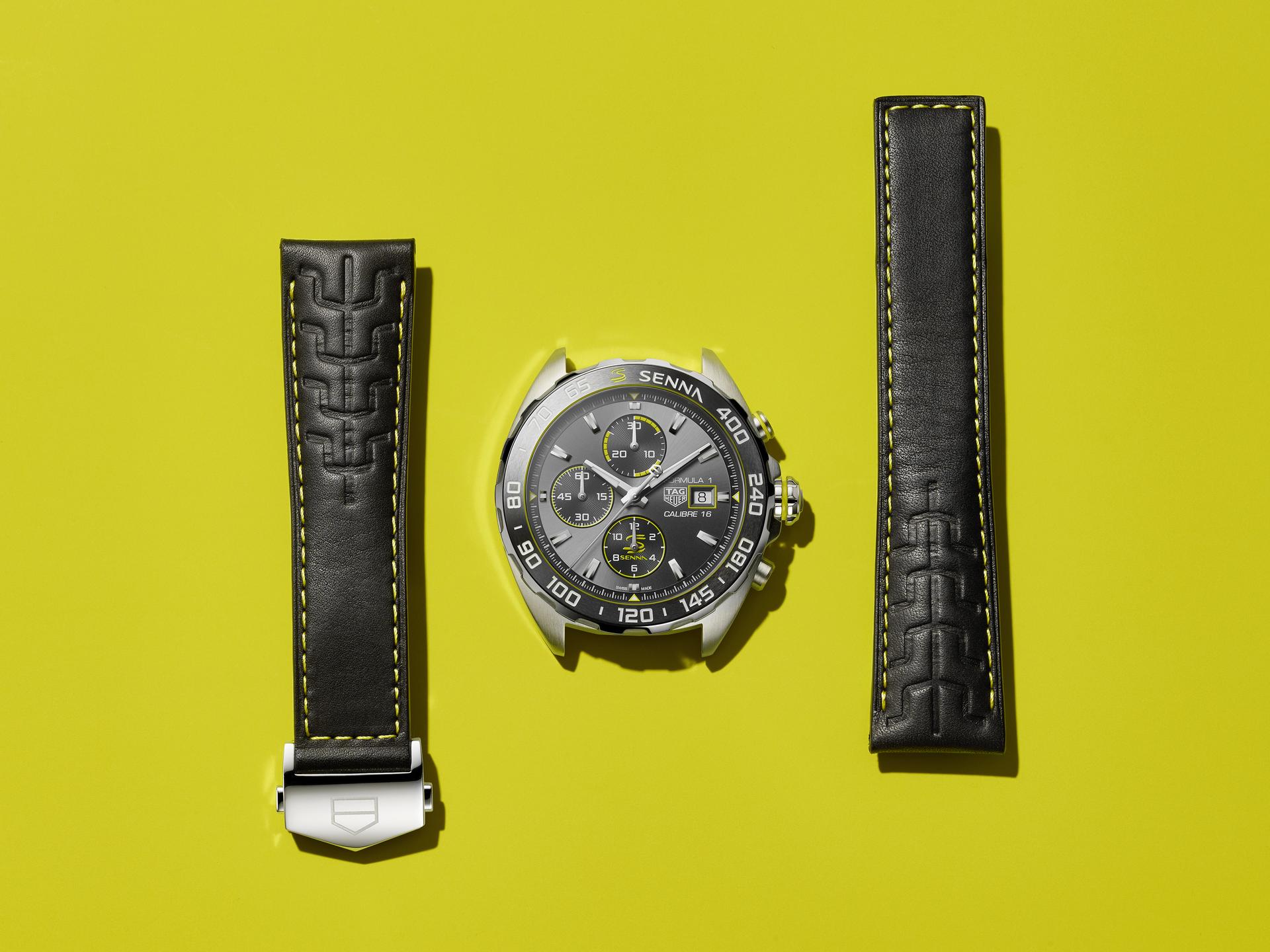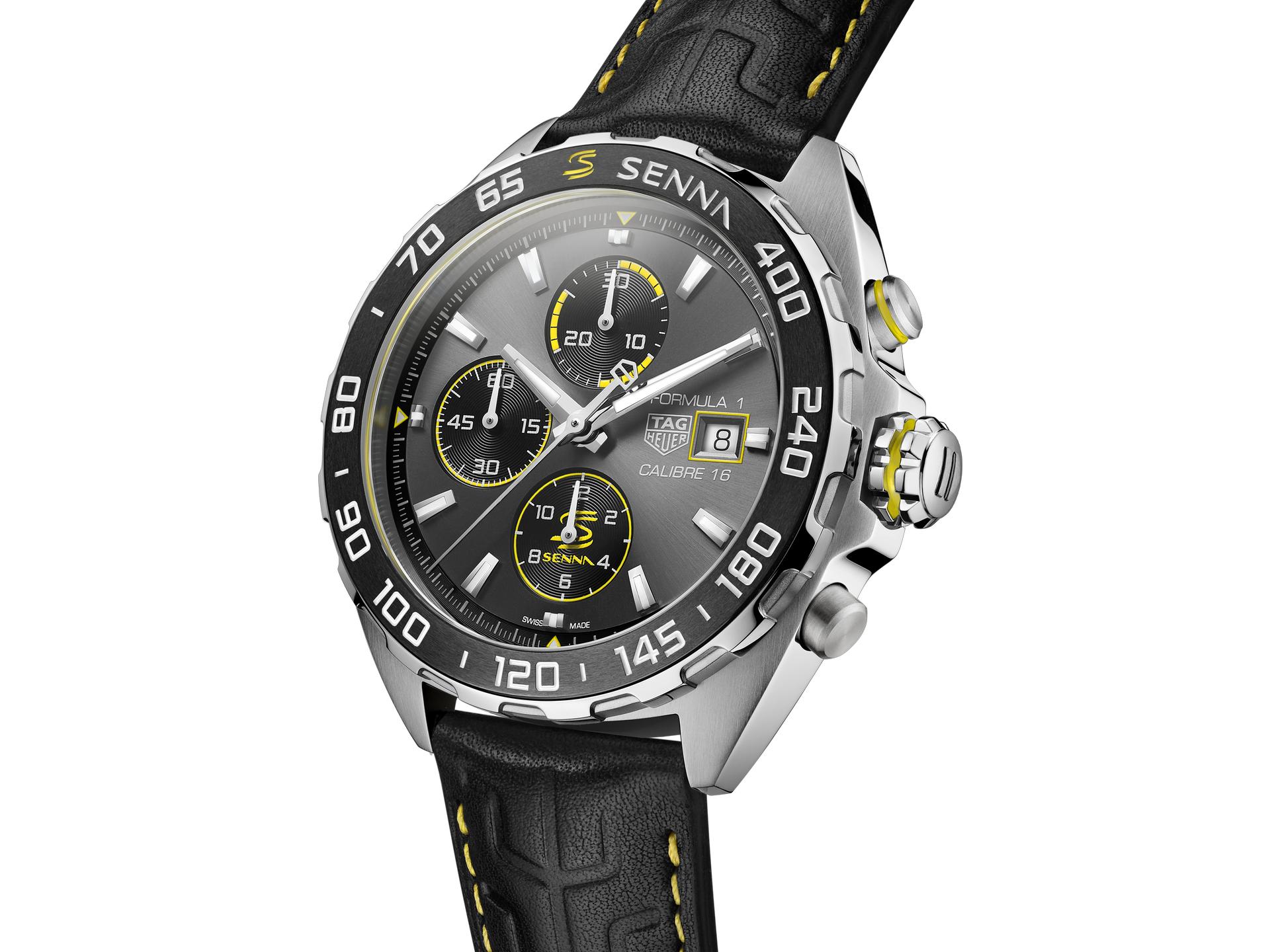 This luxurious yet sporty timepiece is presented on a black calfskin strap with black lining and Senna yellow stitching that matches the colourful details on the dial, around the date window, around the bezel and on the top pusher and crown. An additional nod to Senna is the embossed “S” pattern on the strap, which is reminiscent of the links on his favourite TAG Heuer stainless-steel bracelet. The stainless-steel folding clasp has a double safety system and a pilot extension that makes it possible to wear the watch over a driving suit. Powering this special-edition timepiece is the automatic Calibre 16, which is protected by a stainless-steel screw-down caseback engraved with the Senna logo.