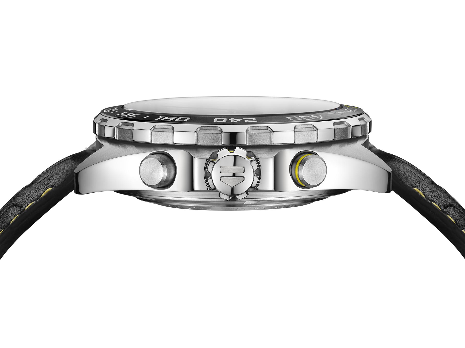 The 2020 Senna special edition is also available with a quartz movement and serves as a prime example of sporting power and prestige. The 43 mm TAG Heuer Formula 1 Quartz Chronograph Senna Special Edition 2020 has a sunray-brushed anthracite dial with luminous black counters at 3, 6 and 9 o’clock. The fixed bezel is fashioned from ultra-resistant black ceramic and, as with its Calibre 16 counterpart, yellow touches on the dial and bezel complete the unmistakable colour scheme that links the watch to Senna.