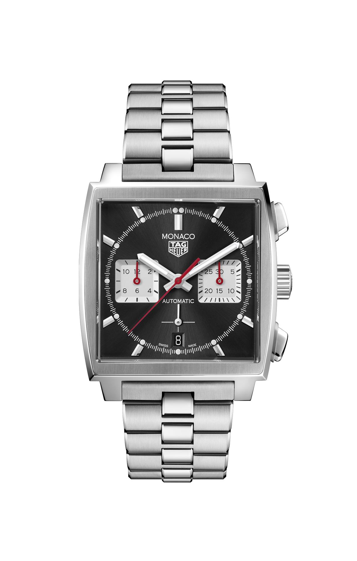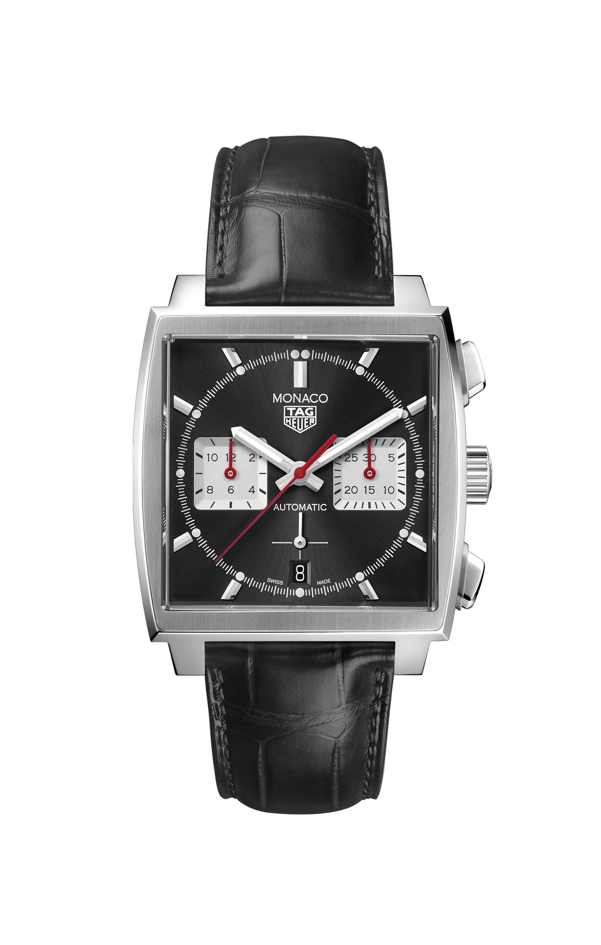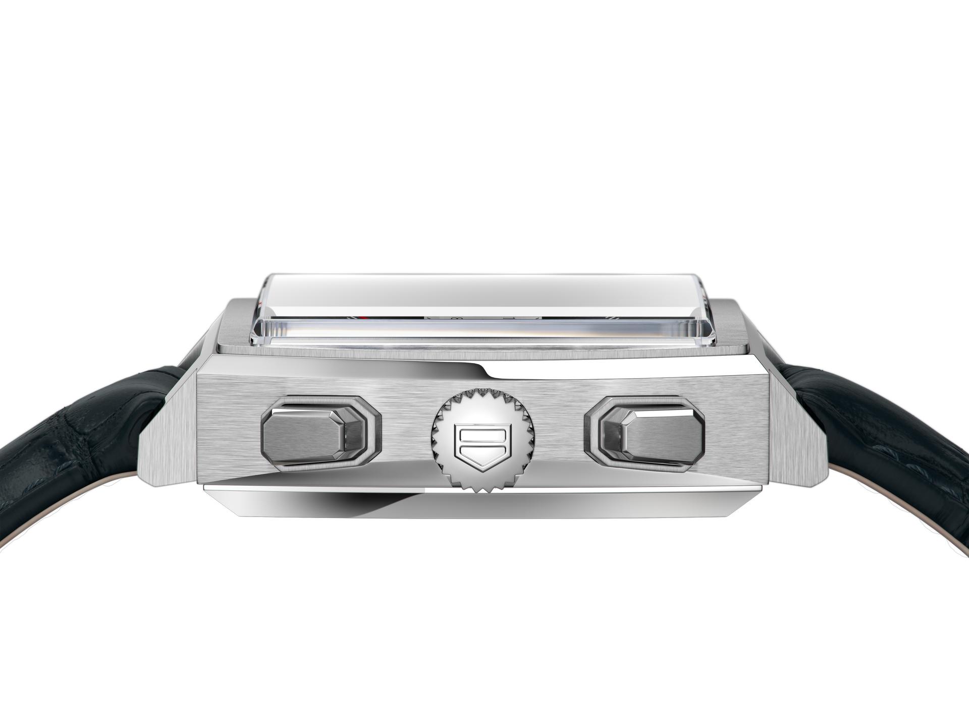 The highlight of these three newcomers is the model with a bold black dial with a sunray-brushed appearance. Its counterpart features a lustrous blue sunray-brushed dial with a red, white and blue colour scheme reminiscent of the original Monaco timepieces of 1969. Both models are presented on a stainless-steel bracelet and feature striking square counters at 3 and 9 o’clock and a red central chronograph seconds hand. The model with the black dial is also available with a black leather strap.