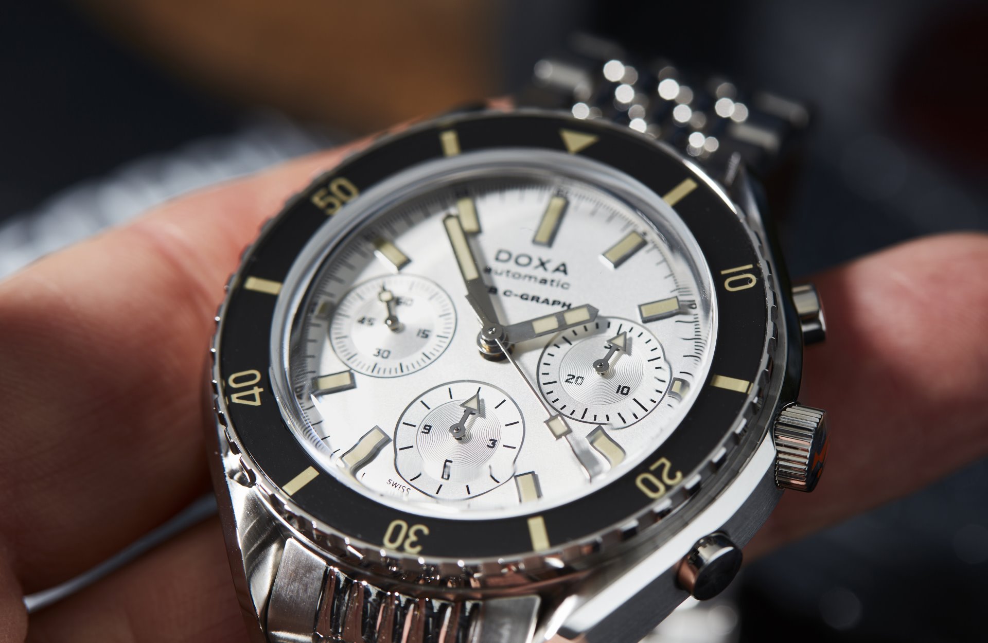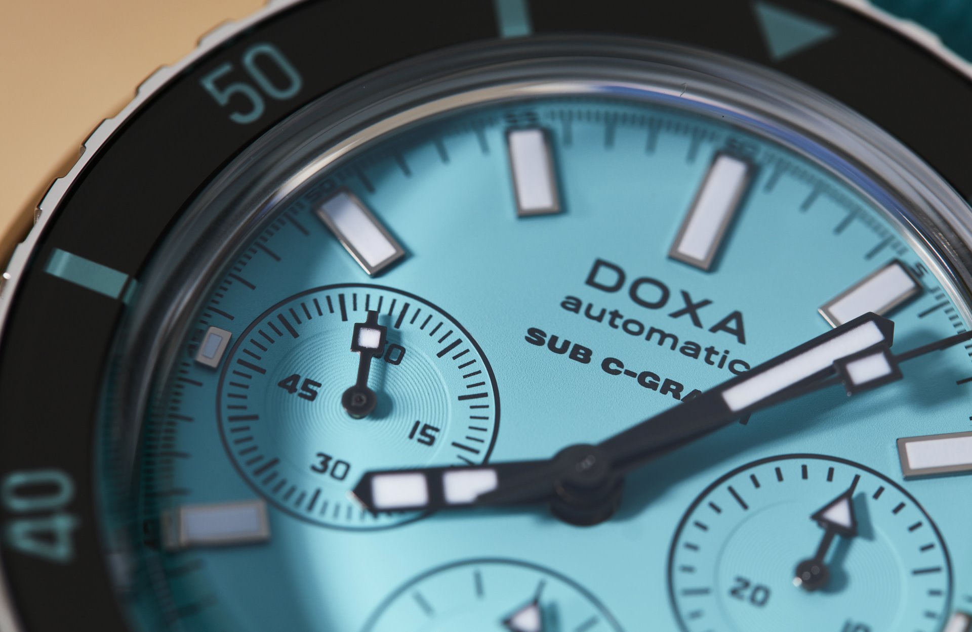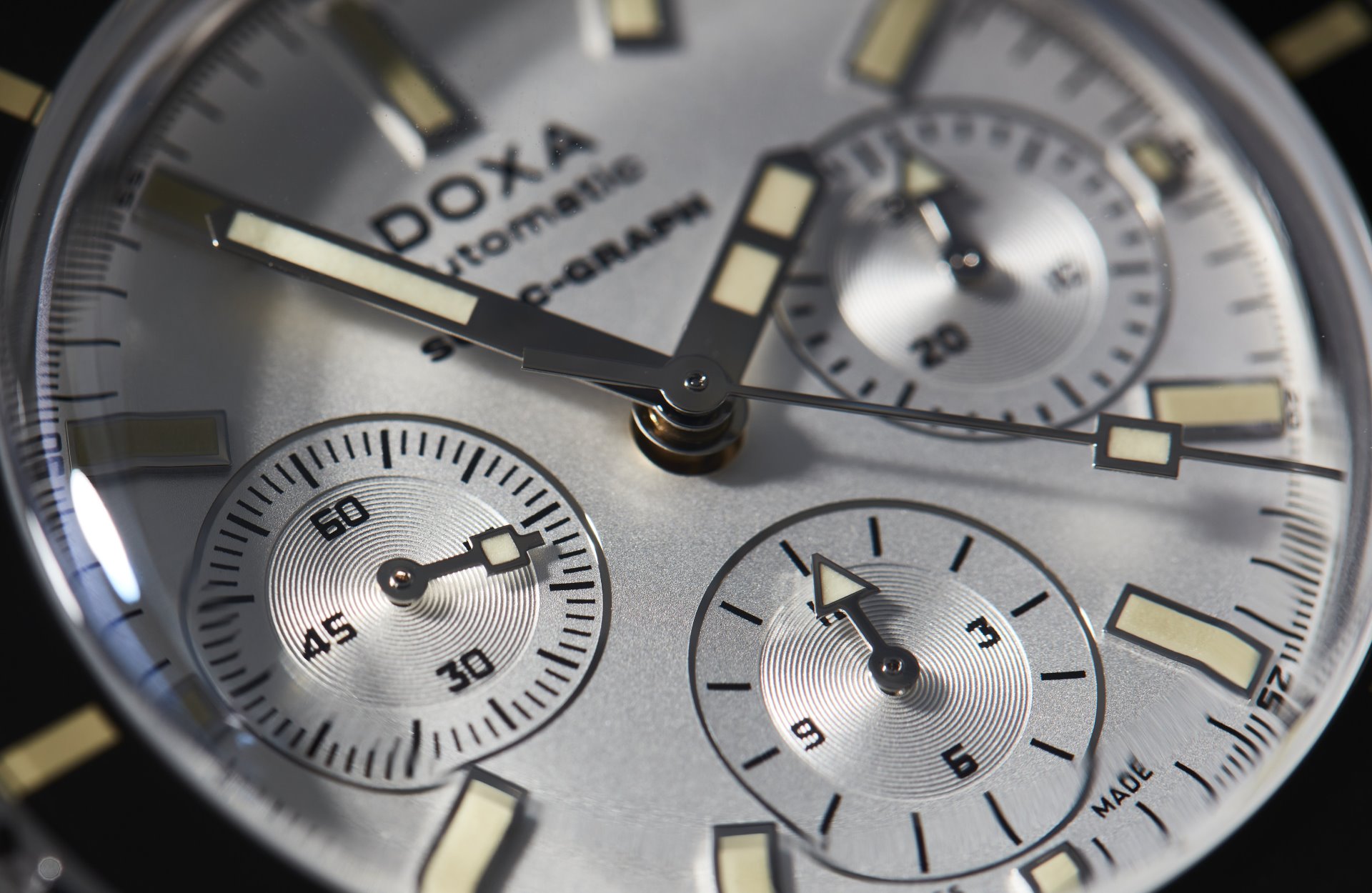 Under the dome-shaped, scratch-resistant sapphire glass box crystal, all dive-related indications on the dial are treated with a Super-LumiNova® luminescent coating to ensure optimum legibility under low-visibility conditions.DOXA SUB 200 C-GRAPH