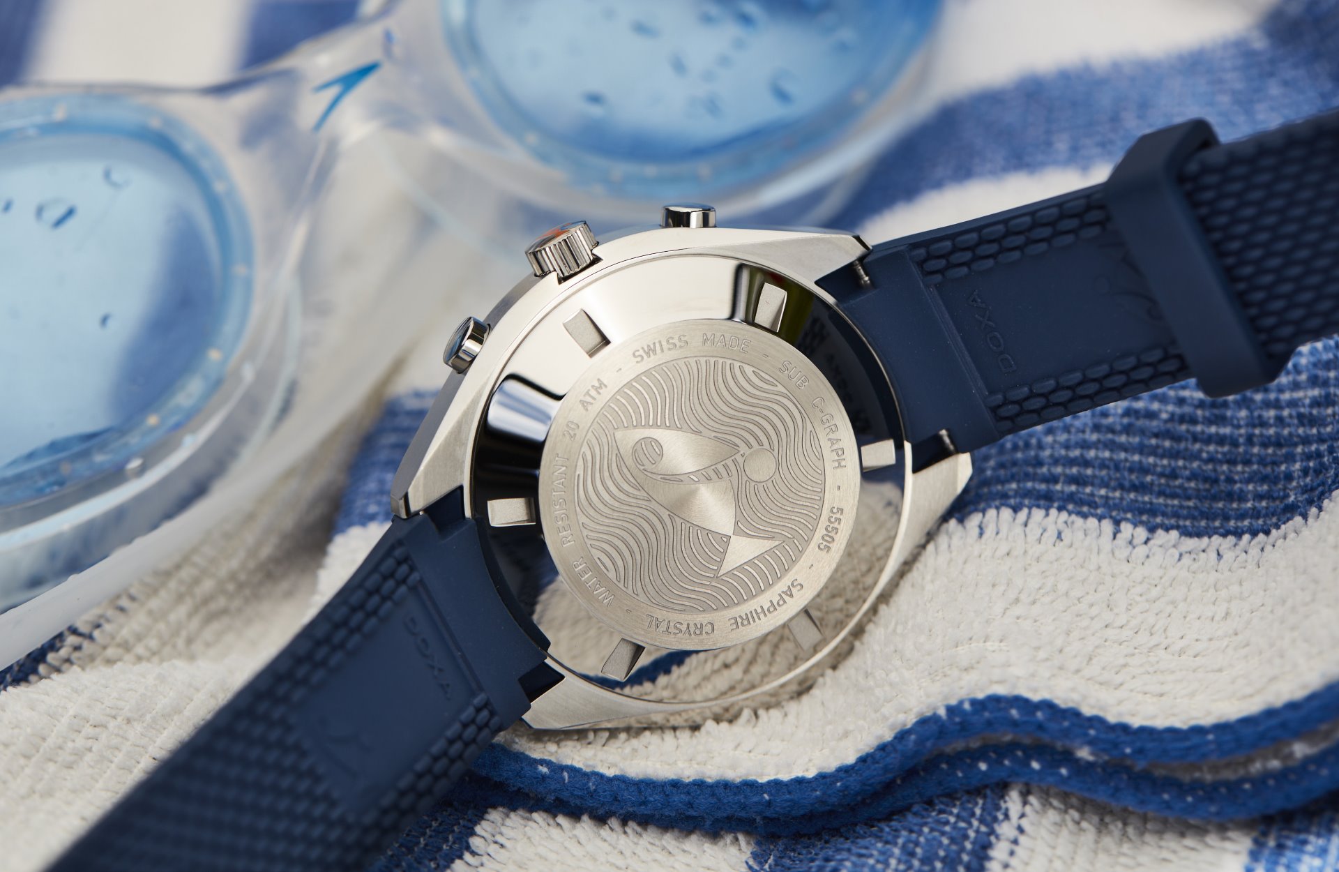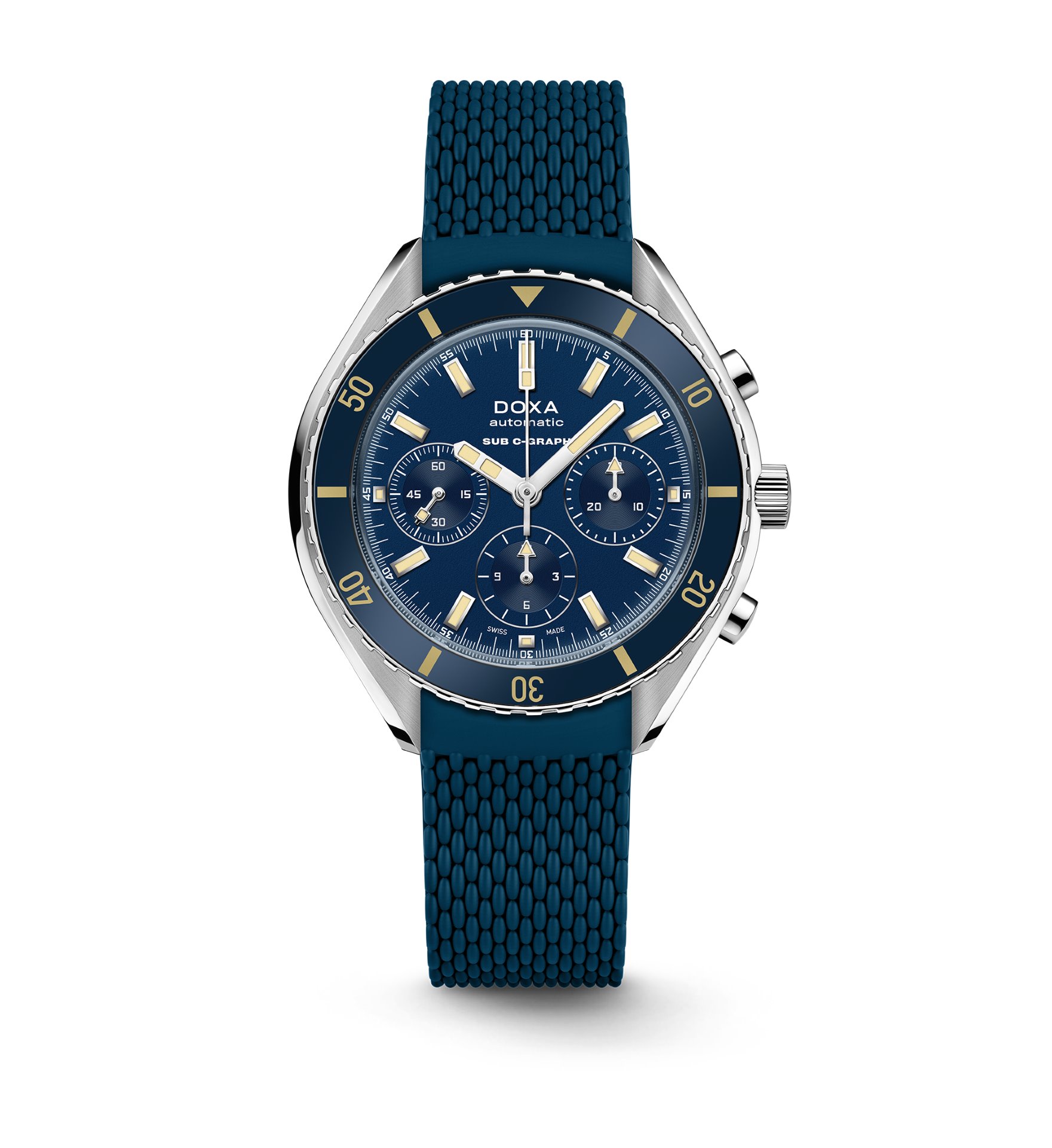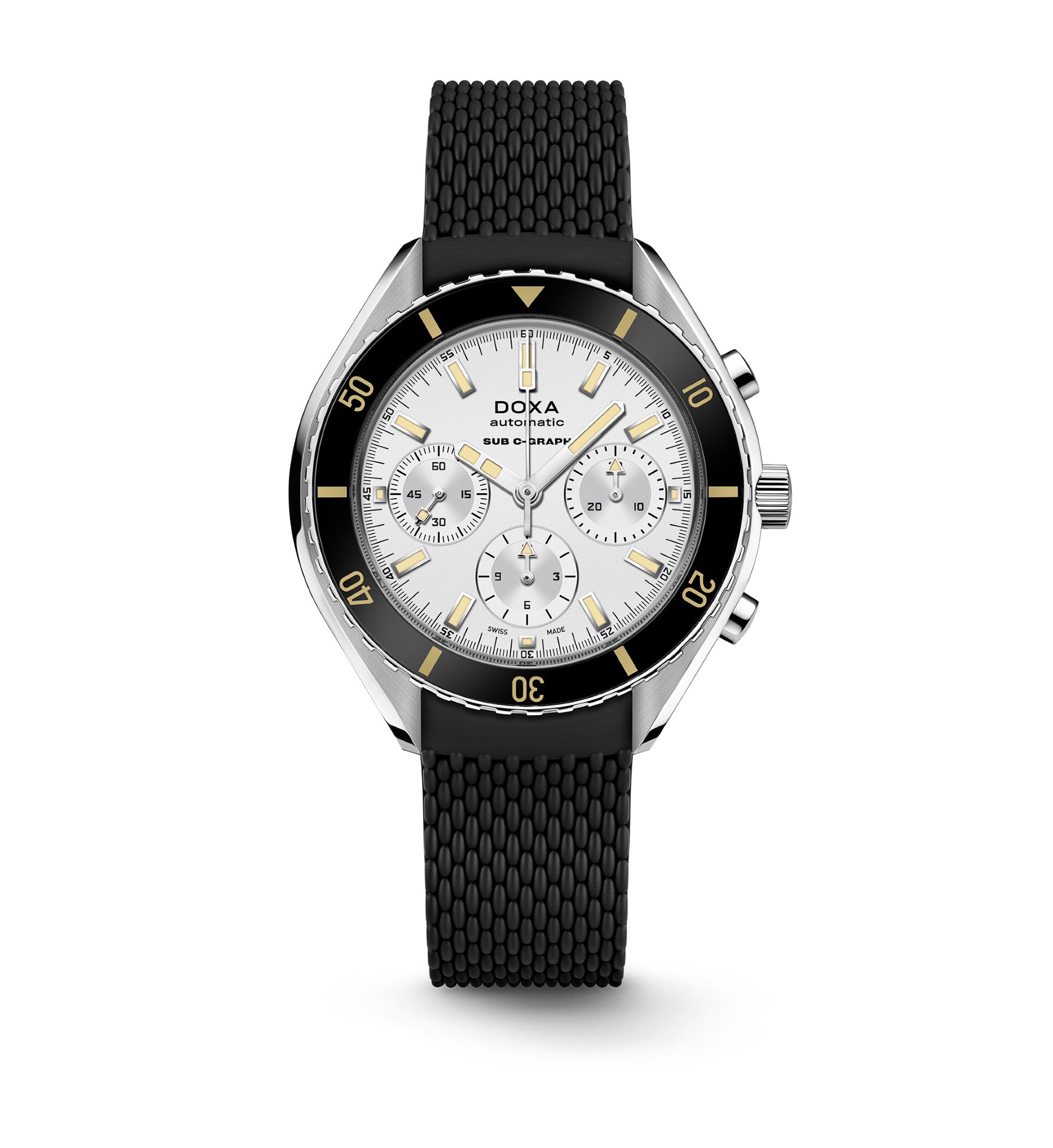 Each of the 6 colour variants of the DOXA SUB 200 C-GRAPH is available in two versions: either with the iconic stainless steel ‘rice bead’ bracelet with a deployant clasp and diver’s extension (for quick wrist size adjustment when wearing a wet or drysuit); or with a new, sportier, supple and resistant rubber strap, with a tang buckle, that matches the dial color and features distinctive DOXA markings on both sides.