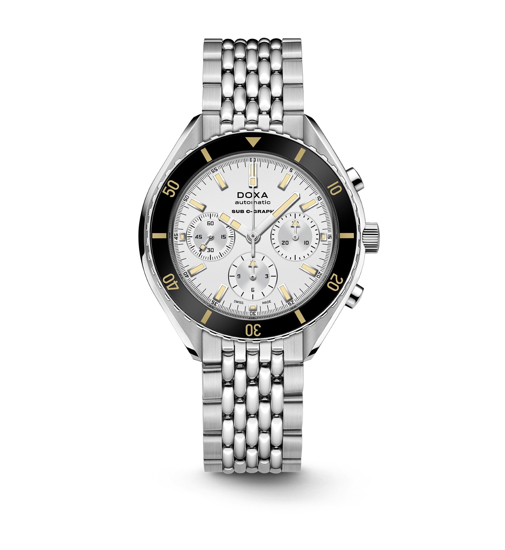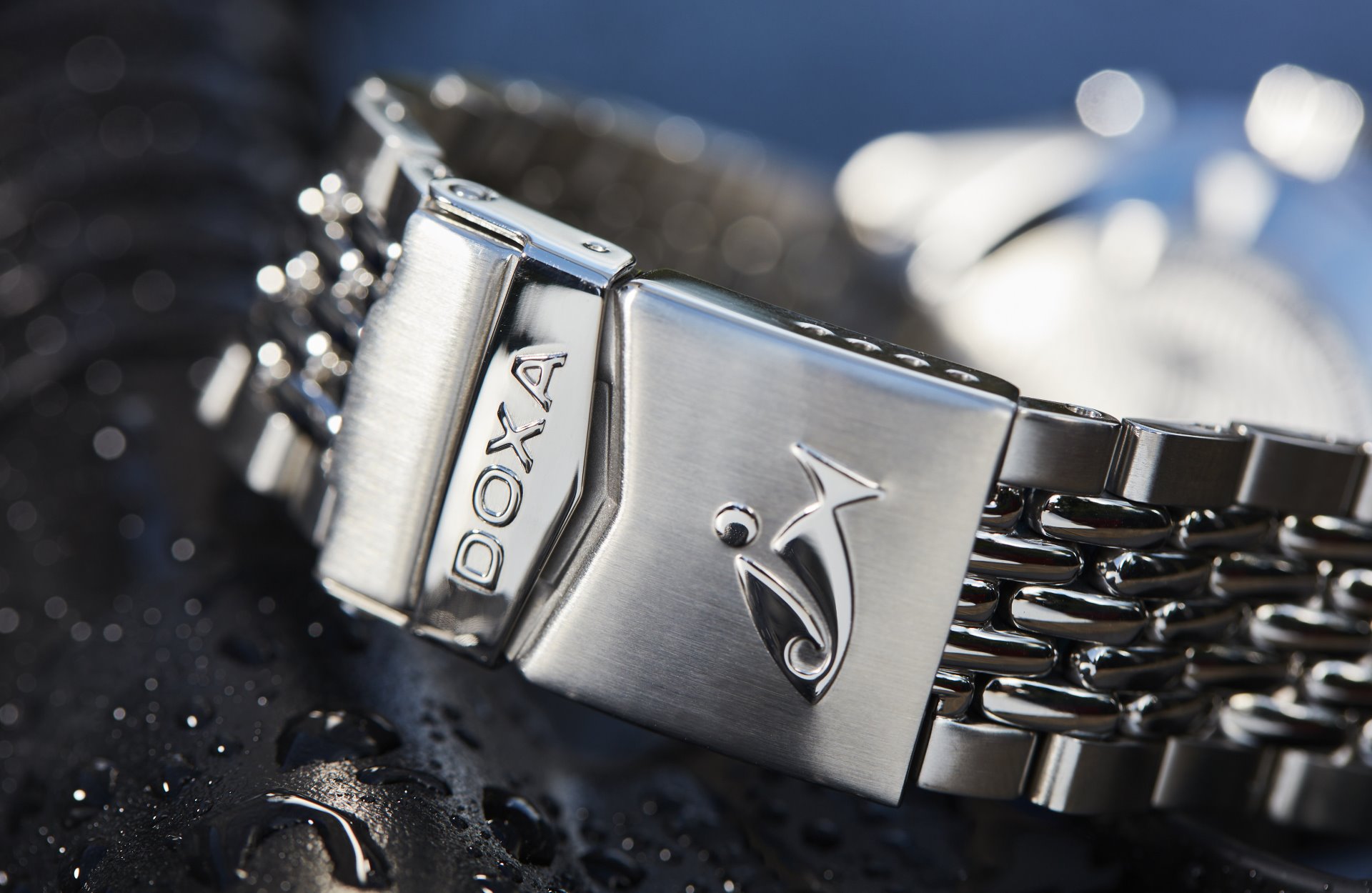 • Stainless steel ‘rice bead’ bracelet with a deployant clasp featuring a diver’s extension and the ‘DOXA fish’ symbol.