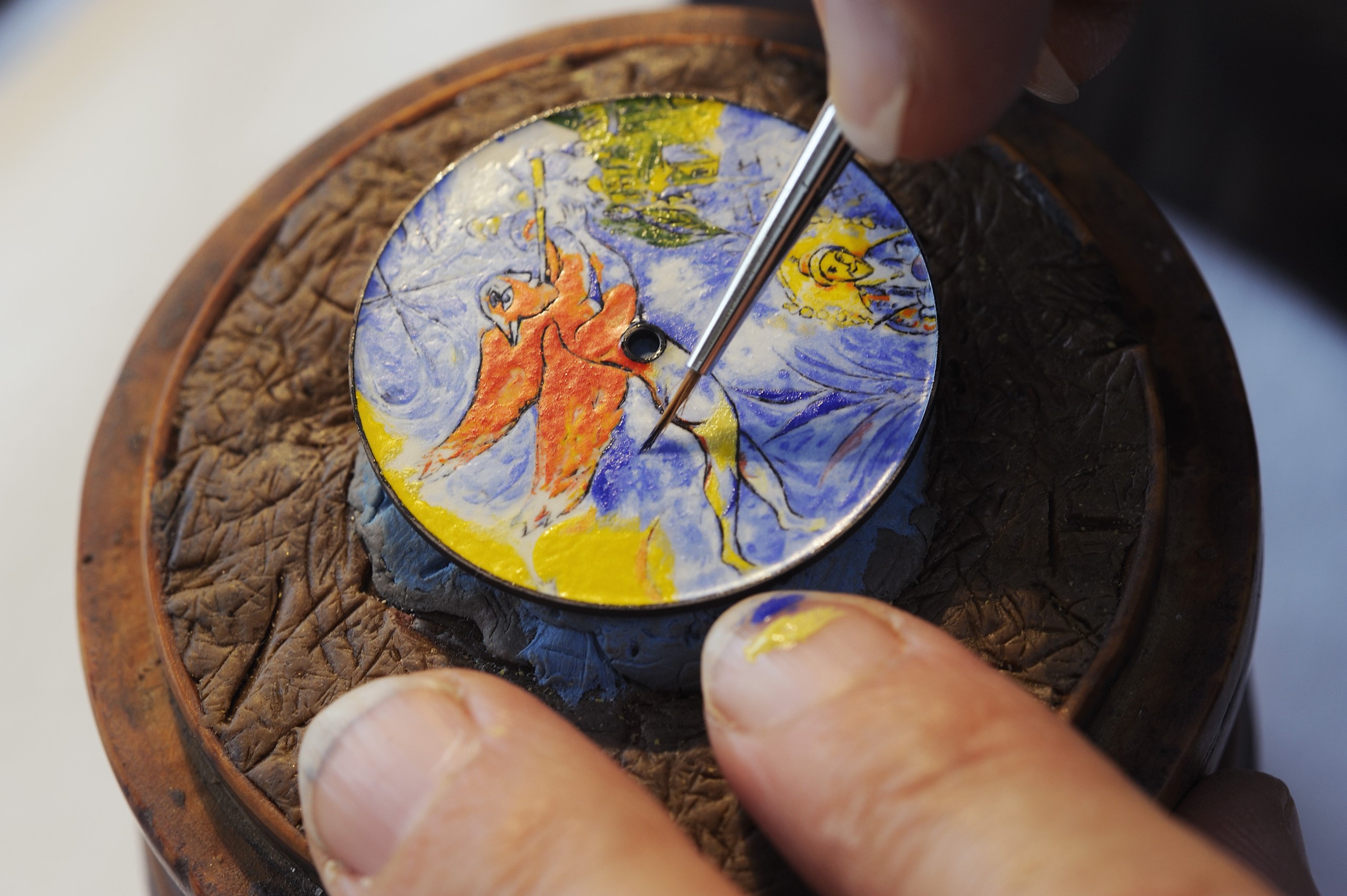 The delicate skill involved in miniature enamel – in its version known as the “Geneva technique” dating from the 18th century – is reserved for the most experienced artisans mastering both pigments and fire. One of the main challenges consists in composing a colour palette compliant with the original shades of the work, while remaining keenly aware that the multiple firings in the kiln at over 800°C are liable to alter its colour and brilliance.
