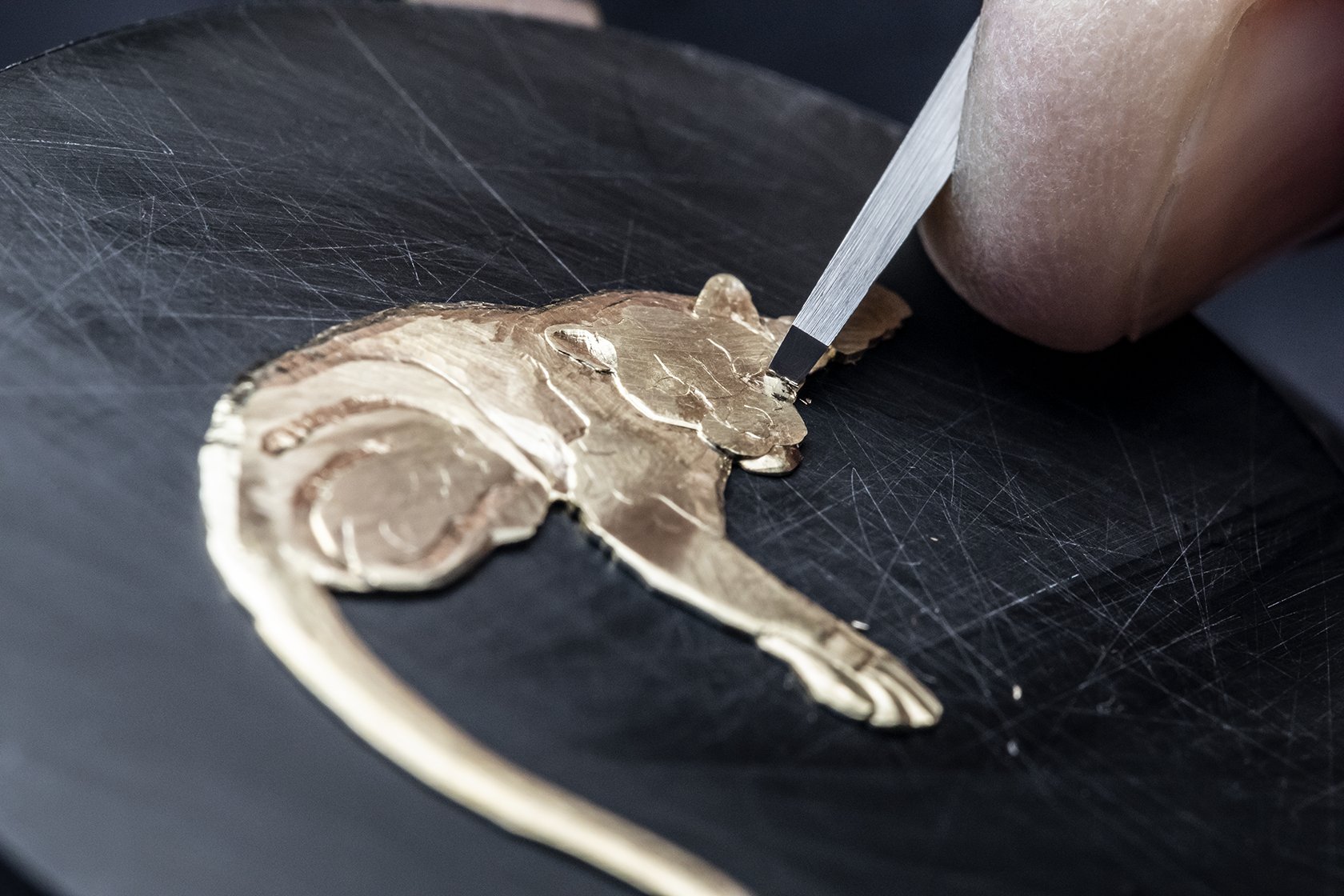 The same naturally applies to the majestic feline. Also crafted using the enamel painting on porcelain and engraving techniques, along with shakudō, its tawny coat with spots reminiscent of clouds is strikingly realistic. On the engraved model, the craftsmen of the Manufacture have gone so far as to inlay the panther’s whiskers hair by hair, made of gold threads almost as fine as a silk ribbon, in accordance with the art of damascening.