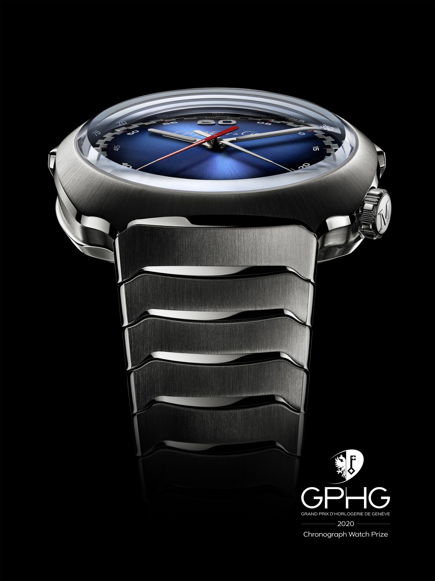 Streamliner: the evocative name of the line released in 2020 by H. Moser & Cie. Overall winner of the 2020 Grand Prix d’Horlogerie de Genève (GPHG) in the Chronograph category, the Streamliner is quickly becoming the must-have model. Imbued with the fluidity of geometric curves and dynamic forms, this collection is characterised by the seamless integration of its steel bracelet with the cushion-shaped case. Steel on steel, Moser-style, of course. Which means employing minimalism to perfectly enhance the resolutely innovative aesthetic of the Streamliner models. After the success of its Chronograph Flyback Automatic with a grey fumé dial and of its three-hand watch, H. Moser & Cie. is unveiling the Streamliner Flyback Chronograph Automatic Funky Blue, featuring the now unmistakable eponymous dial.