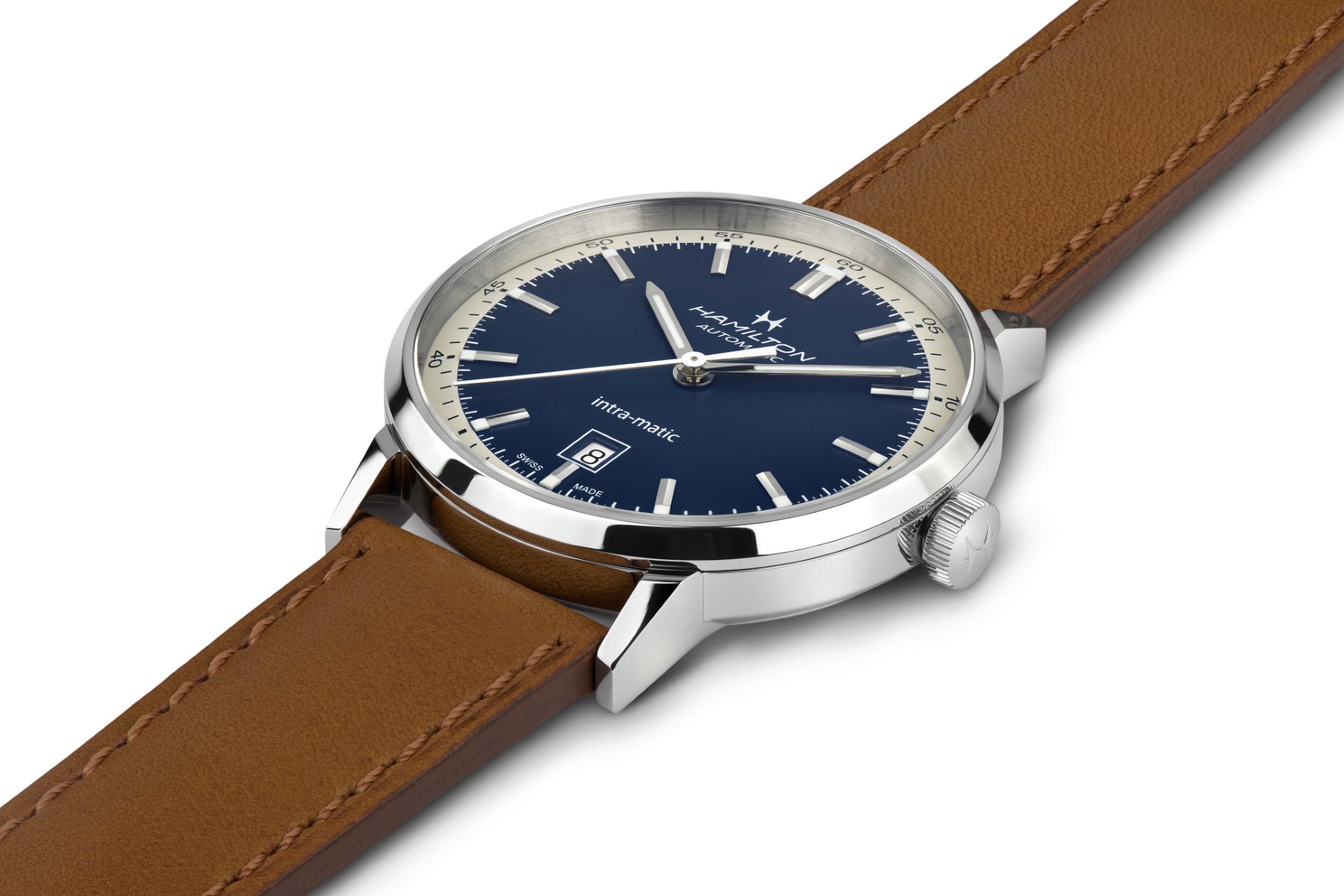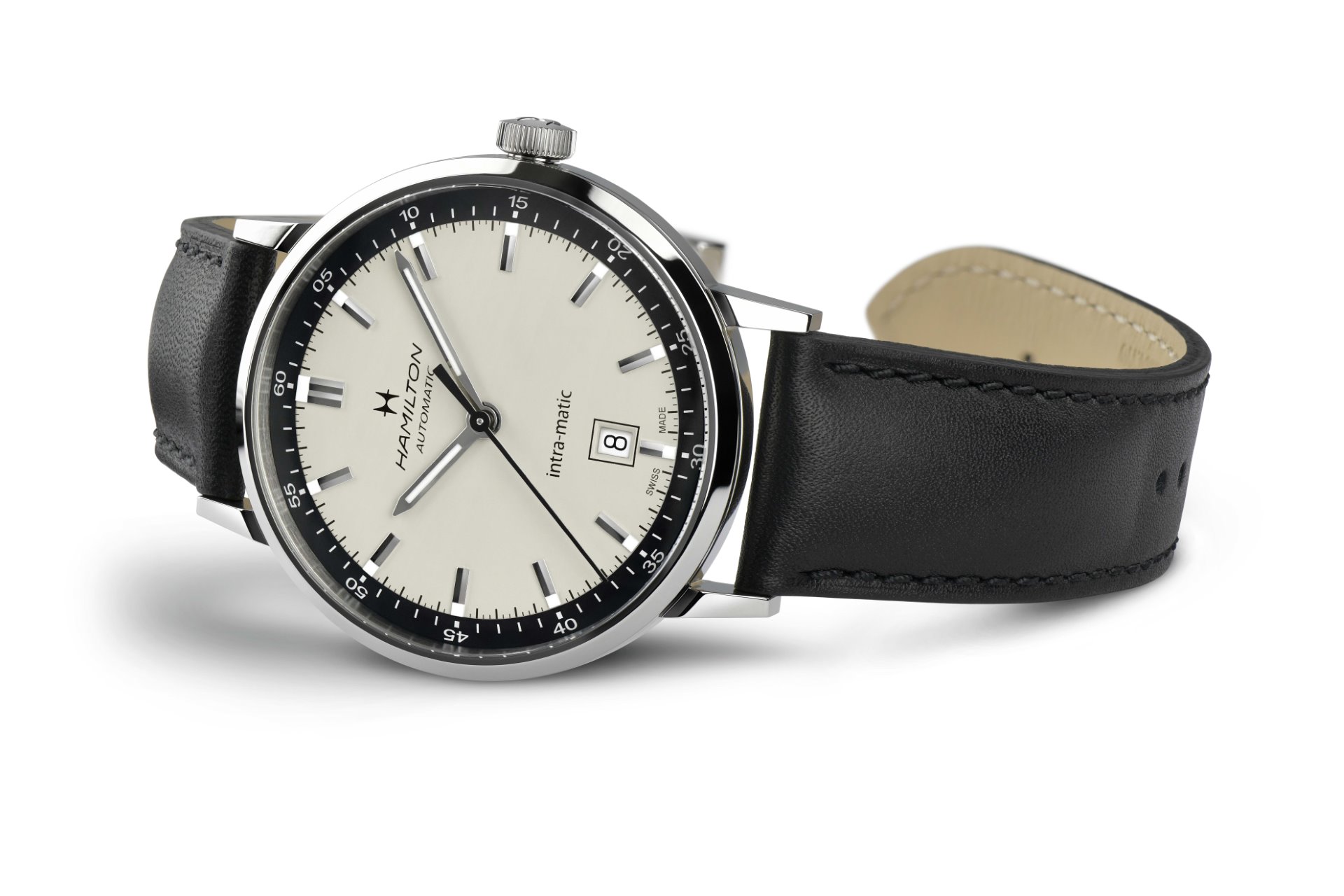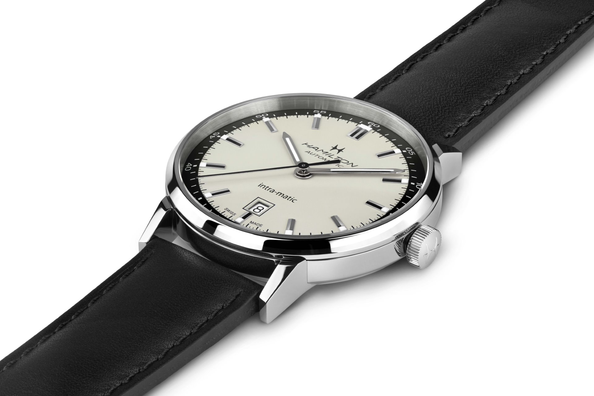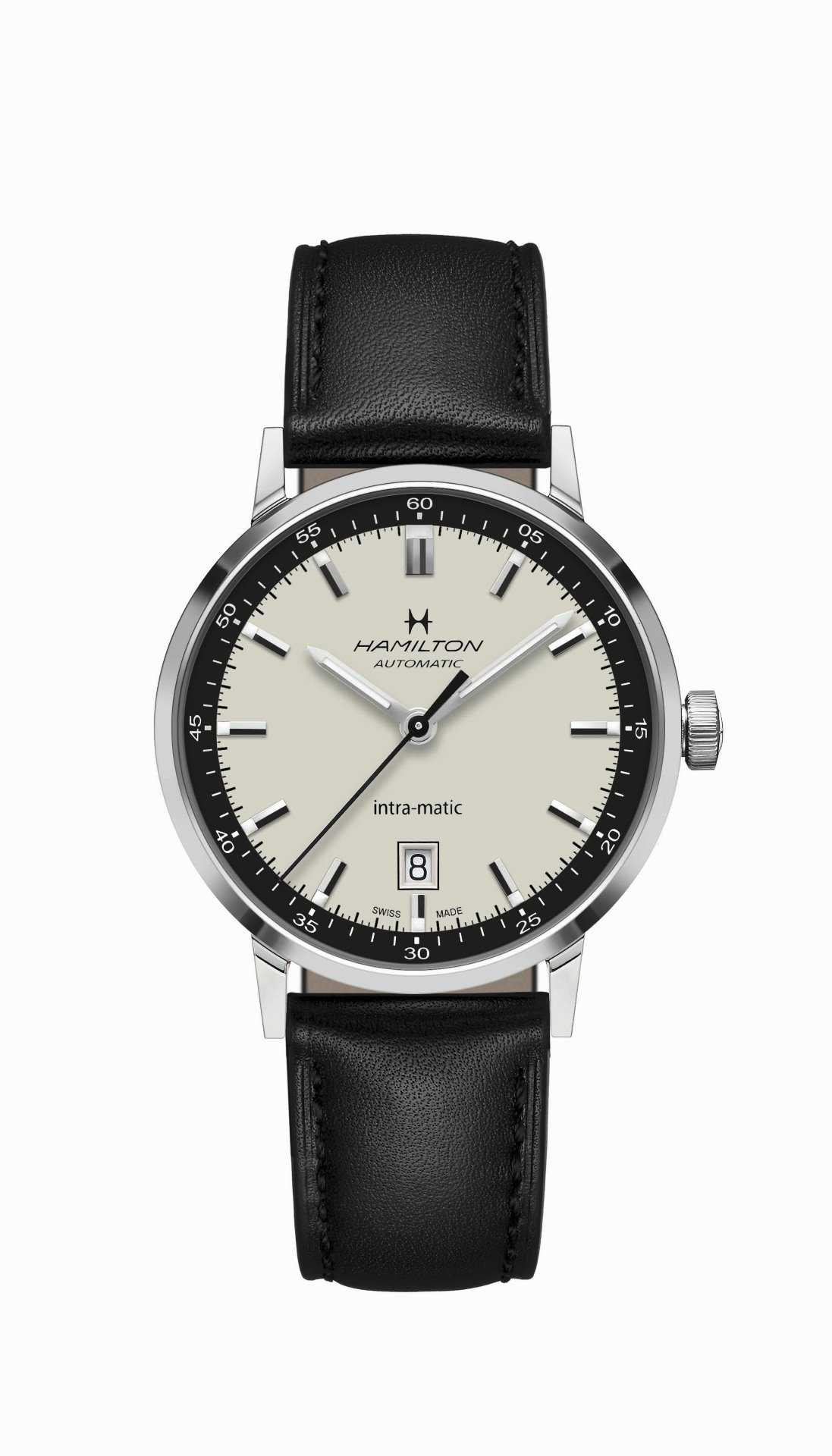 At Hamilton, we love the Automatic Chronograph’s unmistakable aesthetic so much that we decided to extend its design to a non-chronograph wristwatch. The new Intra-Matic Automatic 40mm is a sophisticated three-hand automatic with a date window at 6 o’clock. Its vintage-infused style makes it the perfect choice for those looking for a watch that can easily transition from the office to a weekend getaway on the Italian Riviera.