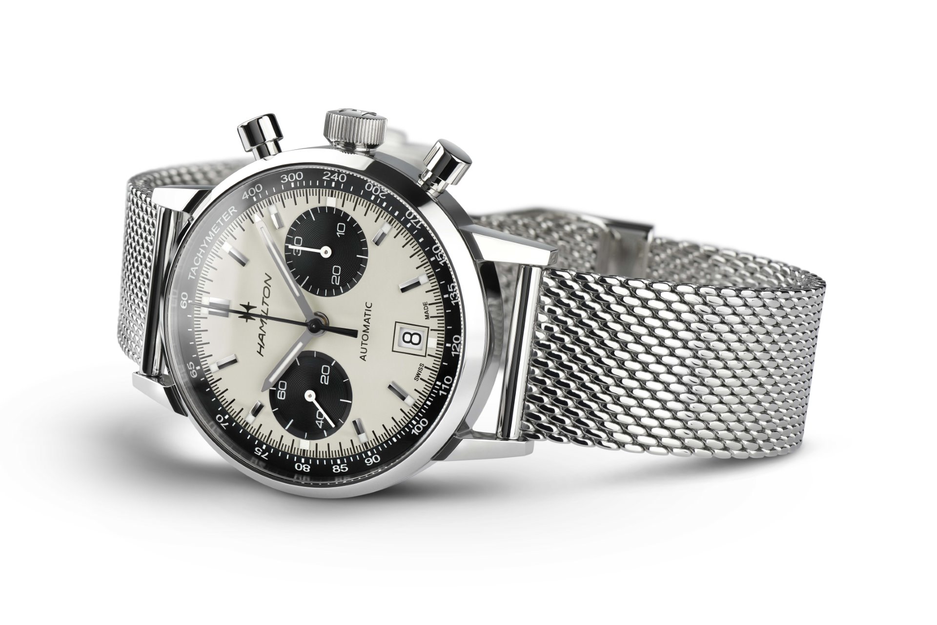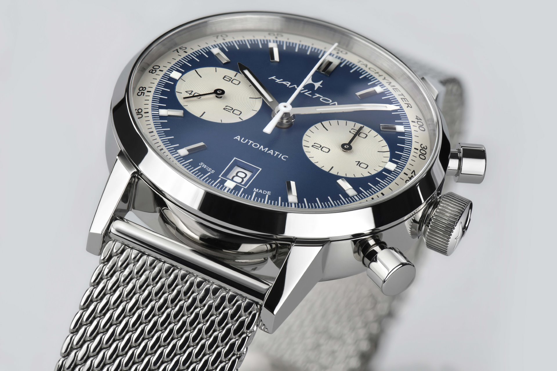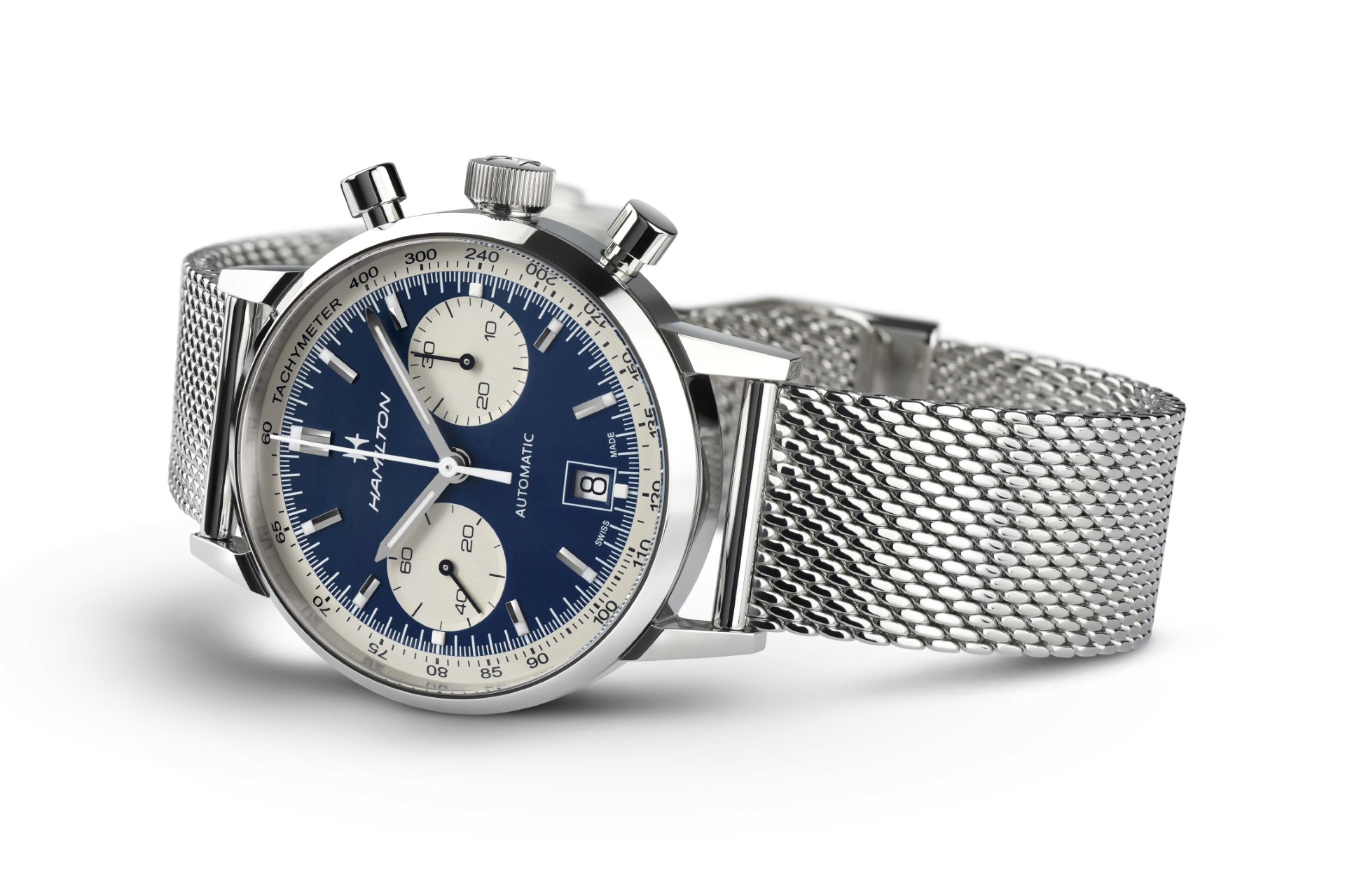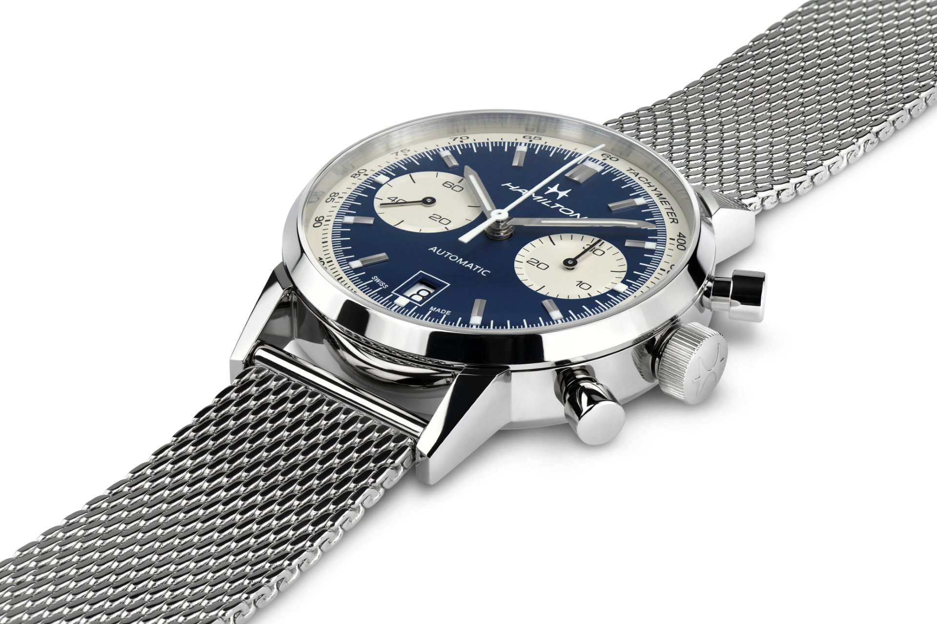 The mesh bracelet is available on both versions of the Hamilton Intra-Matic Automatic Chronograph: off-white dial with black chronograph counters, and blue dial with off-white chronograph counters.