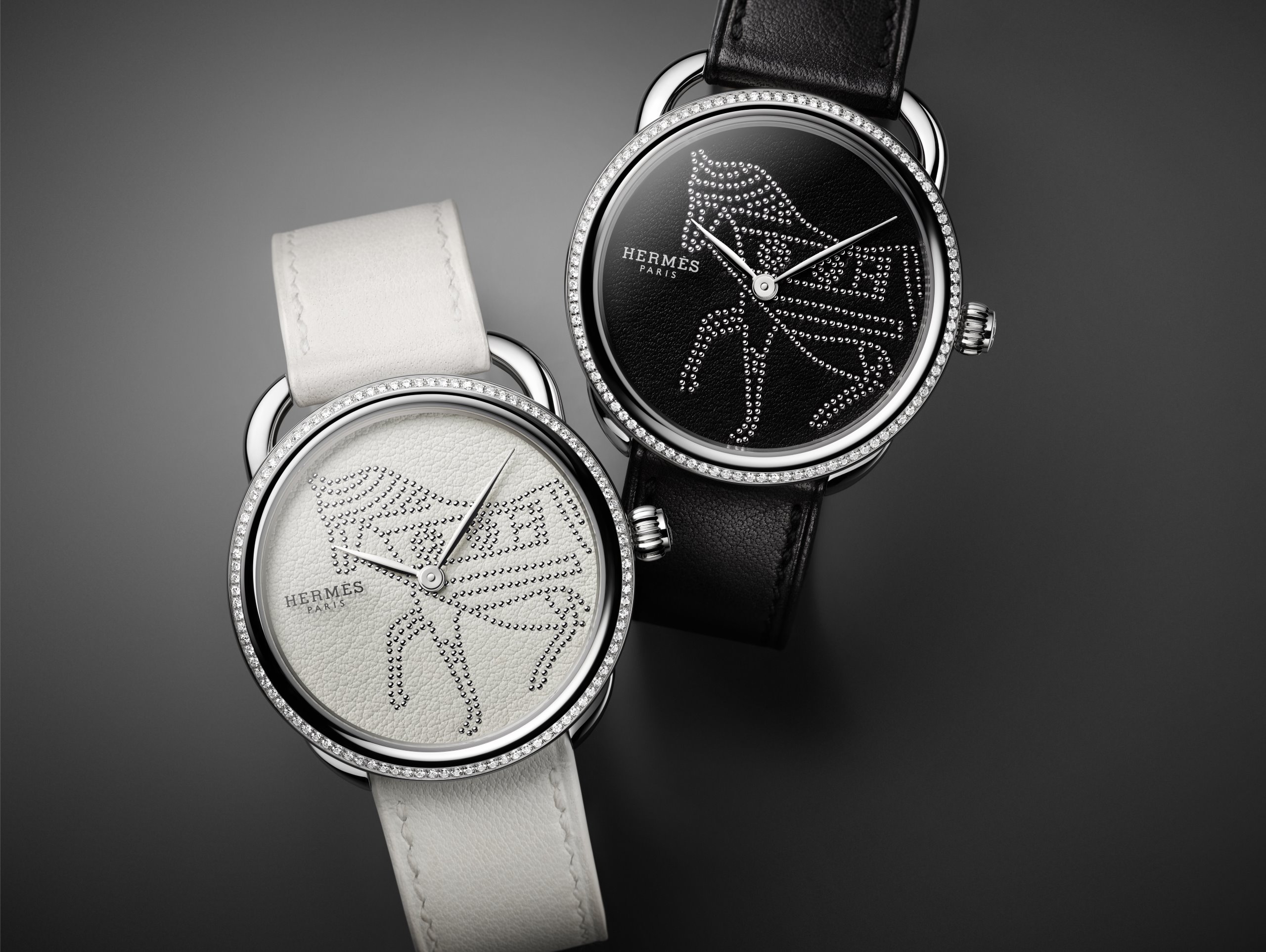 The result of Hermès’s saddlery and leathermaking expertise, 395 mini studs – individually placed on the leather dial of the new Arceau Horse – compose an equestrian motif. The meticulous studding is complemented by the delicate crafting of the black or white leather, both miniaturised to the scale of the dial. The spirited horse comes to life framed by a steel case set with 100 diamonds and secured to the wrist by a calfskin strap matching the dial colour – all produced in the Hermès Horloger workshops. In a fascinating blend of understatement, brilliance and careful attention to every demanding detail, the Arceau Horse boldly flaunts its singularity both by day and by night.
