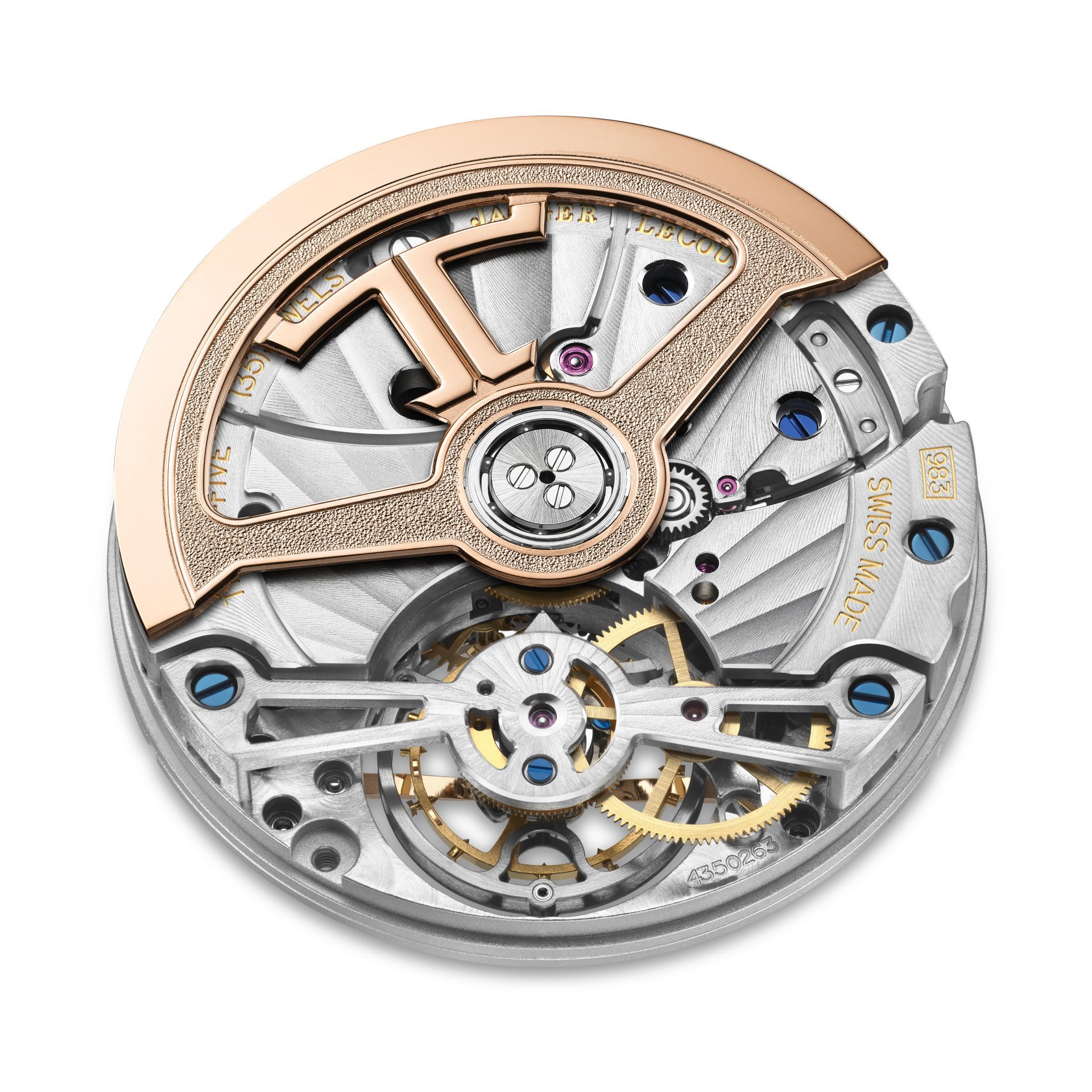 On the reverse side, the long span of the open-worked tourbillon bridge further enhances this transparency, while its Côtes de Genève decoration complements the sunray pattern of the stripes on the main plate. The open-worked pink gold winding rotor, which features the JL logo and a combination of polished and micro-blasted surfaces, allows a clear view of the movement, with additional fine finishes including blue screws, circular graining and chamfered bridges.