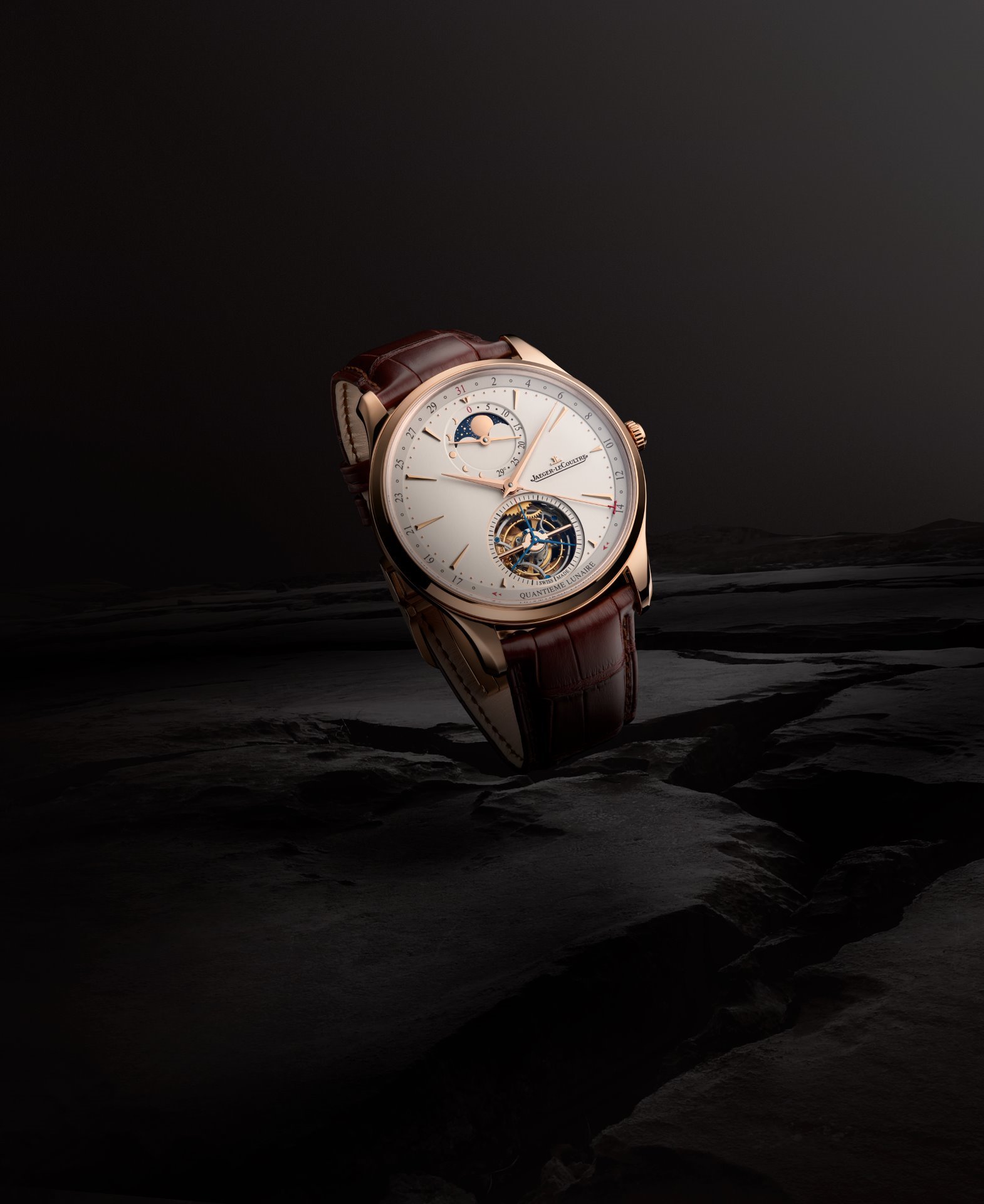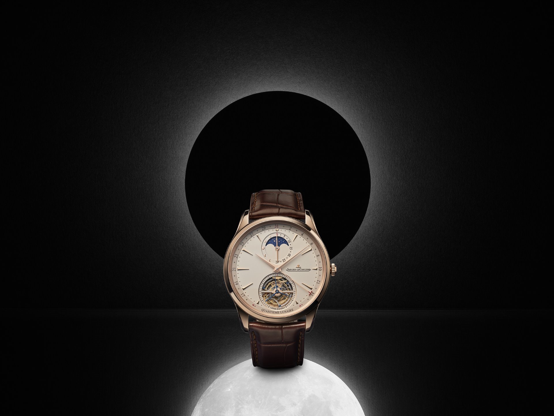 The Master Ultra Thin Tourbillon Moon is presented in a case made of Le Grand Rose gold. Introduced this year, the new pink gold alloy has a remarkable sheen and depth of colour, and is highly resistant to fading over time. True to the classically elegant design codes of Master Ultra Thin, the case is fully polished, with elongated and bevelled lugs and a fine bezel.