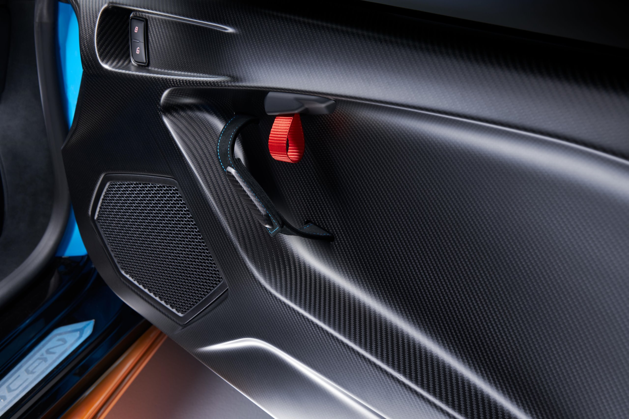 The interior of the Huracán STO reflects the lightweight persona of the exterior: extensive use of carbon fiber features throughout the cockpit, including sport seats in full carbon fiber; an Alcantara interior with Lamborghini’s Carbonskin; carpets removed and replaced by floor mats in carbon fiber; and the fully carbon fiber lightweight door panels with a door latch as opener. A rear arch with four-point seatbelts and a newly designed front trunk for helmet storage, underline the Huracán STO’s racing DNA. The rear arch, developed in cooperation with our Technical Partner Akrapovič, is made from high-grade titanium alloys. It is 40% lighter than conventional stainless-steel rear arches.