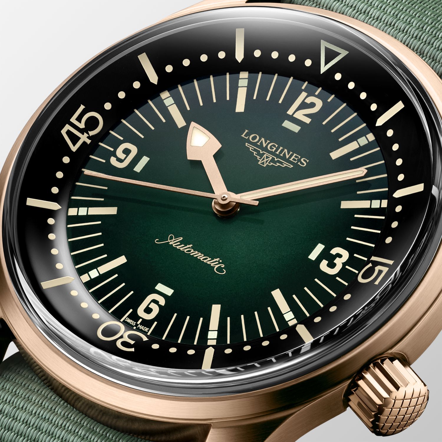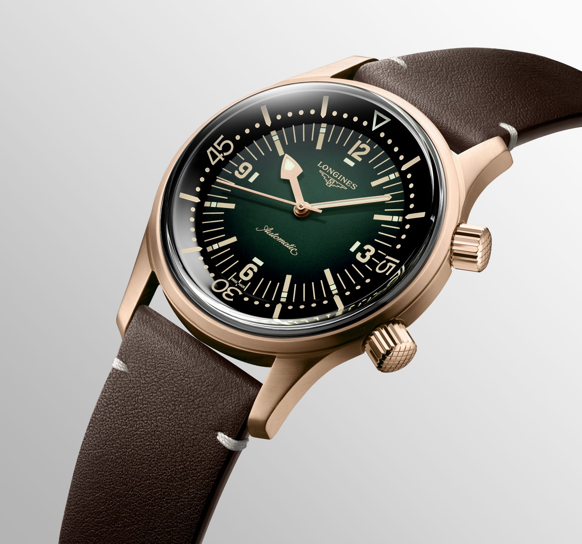 The newest Longines Legend Diver Watch houses an automatic movement with silicon balance-spring inside its 42mm bronze and titanium case. Its shaded green lacquered dial is covered with a sapphire crystal box and sports luminous hands, hour markers with coated Super-Luminova and Arabic numerals enhanced with luminescent rectangles for optimal legibility, a reminder of the codes of the sport for which this watch was originally intended.