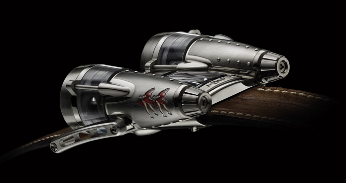The HM4 case escapes any standard definition, matched inside by an engine that defies conventional watch movement construction. Due to its complexity, it was limited from the beginning to just 100 pieces, and each of those 100 movements found its way into one of the various HM4 editions – the last remaining piece was sold years ago.