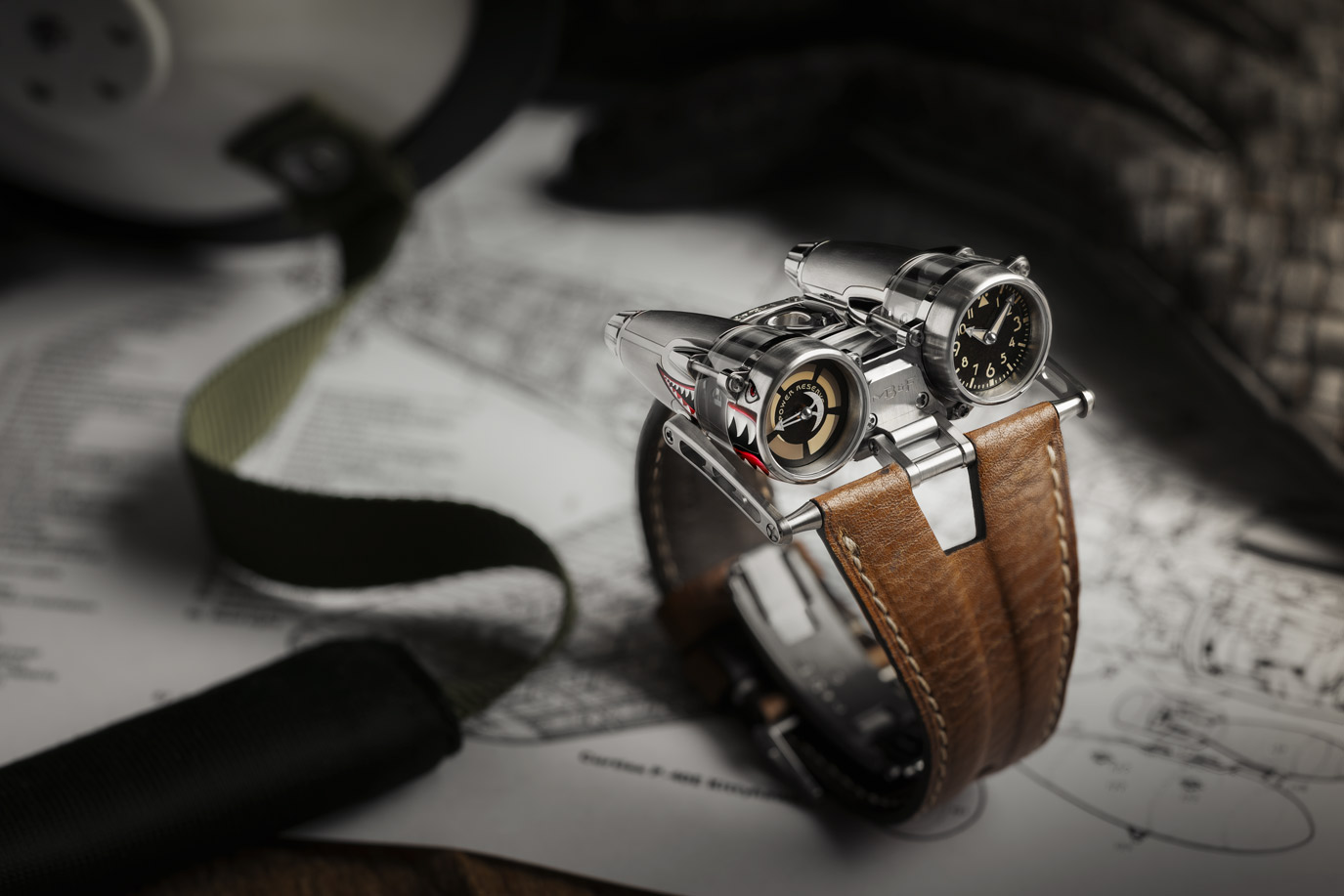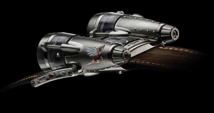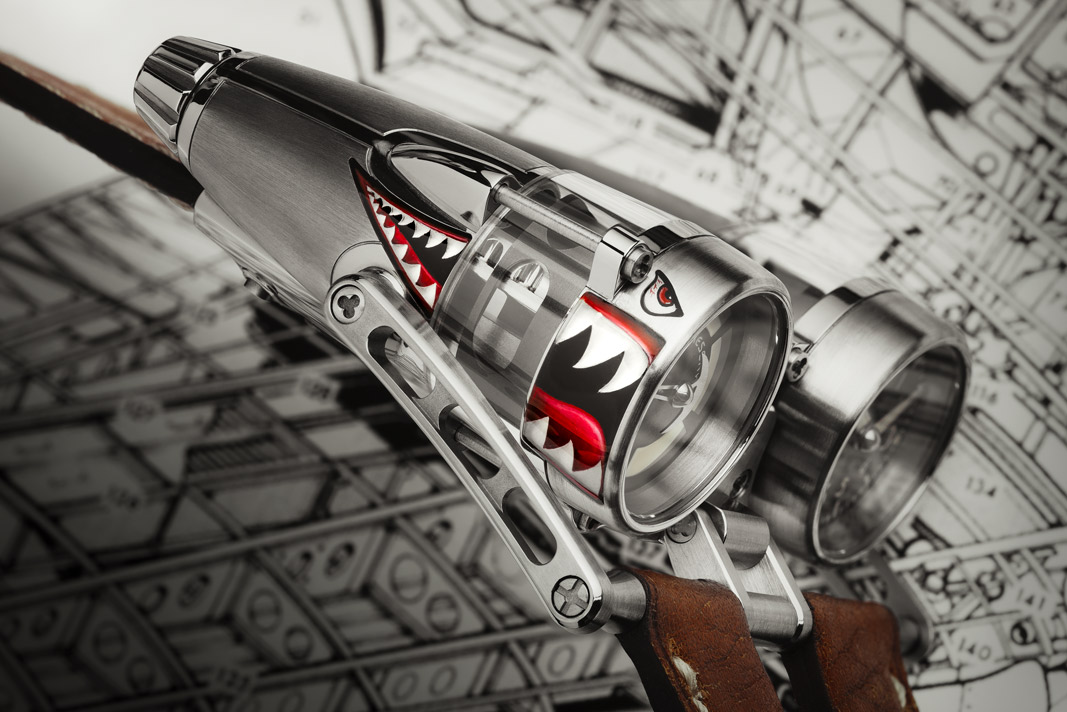Just like the “nose art” of those legendary WW2 aircraft, this Pièce Unique bears a hand-painted shark mouth and eyes, along with aged time and power reserve dials. The titanium case of the 10-year old prototype was first prepared to welcome the recessed painting by carefully removing microns of metal from the sides of the fuselage, following the shape of the illustrations. It was then handed over to the incredibly talented miniaturist painter Isabelle Villa, who delicately painted the menacing teeth and angry eyes. A final coat of transparent varnish was applied to protect the miniature painting, flush with the case.