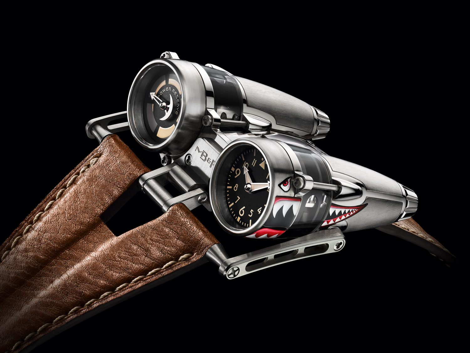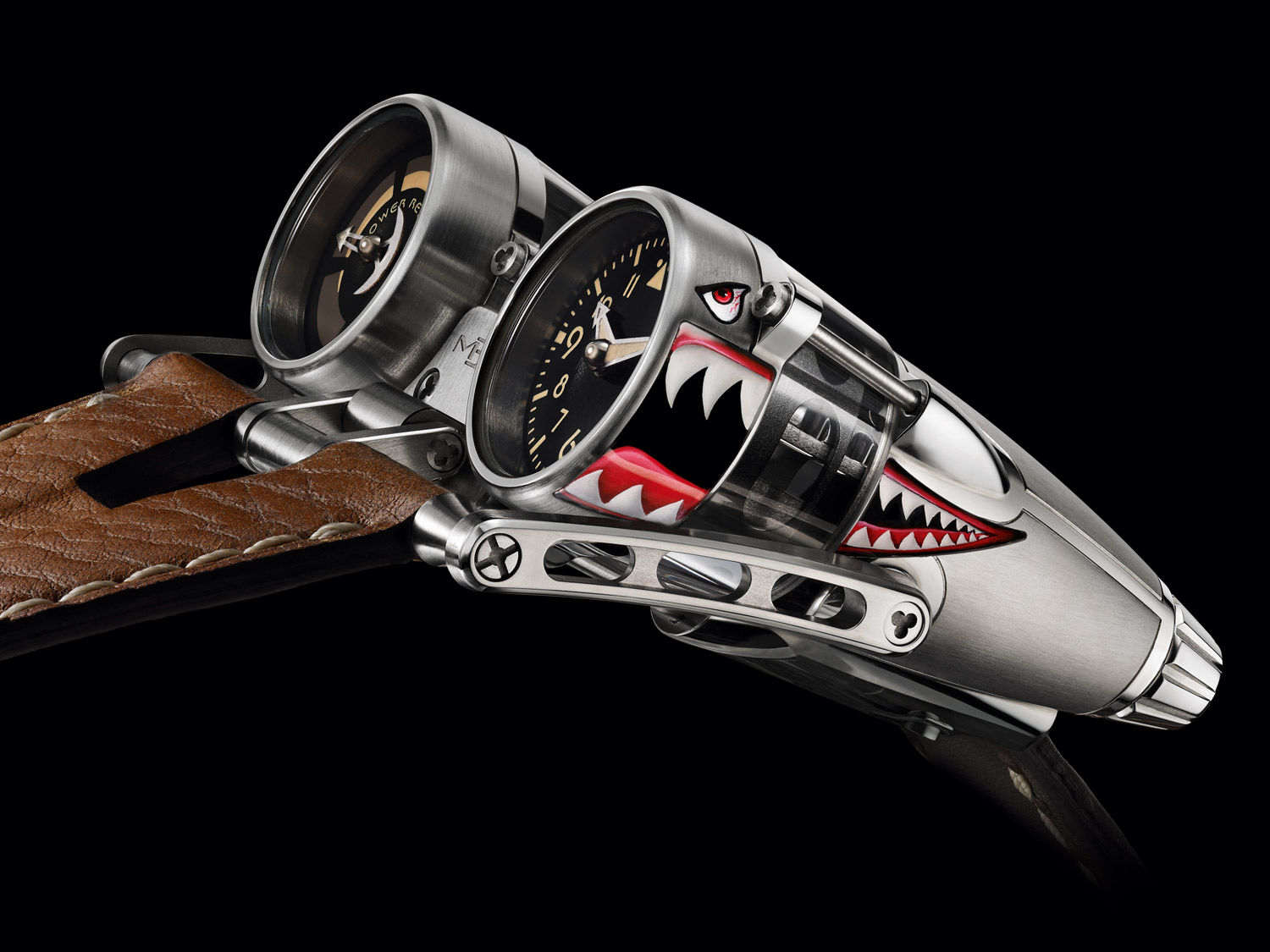 - HM4 ‘Kittyhawk’: grade 5 titanium and sapphire, hand-painted shark mouth and eyes