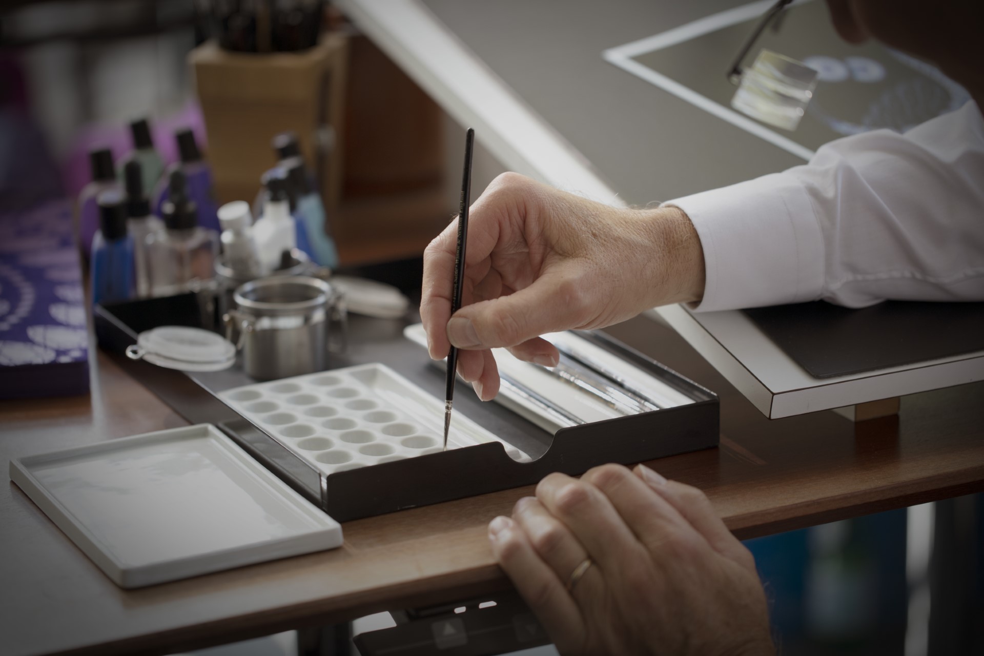 The most precious and difficult technique to master is gouache painting. It is a delicate wash painting technique which is in itself a work of art: a still life that aspires to true life. The process starts with a sketch, which is reworked and rethought several times, before being approved and then gouache painted. The artist who created the drawing also does the gouache painting and follows-up on the project all the way through subsequent ateliers.