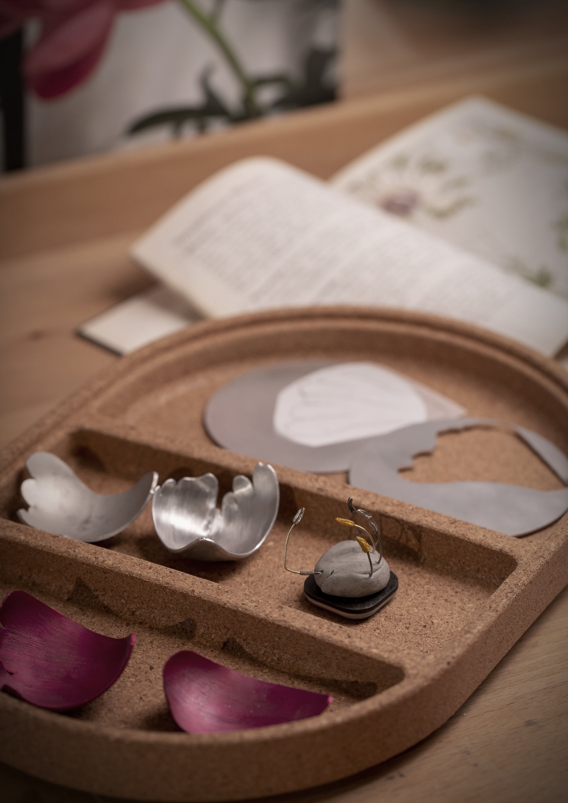 It all starts with the gouache painting of which the jeweller makes a photocopy. For Laura, a jewellery model-maker at Chopard since 2018, this photocopy is glued onto a plate made of tin, an extremely malleable metal. She then cuts out the shapes using jeweller’s tools: a tiny hand saw, files, milling cutters and a soldering iron. Then comes the actual construction of the jewel. The shadows enable the artist to imagine the jewel in terms of volume, a process that necessarily involves an interpretative element.