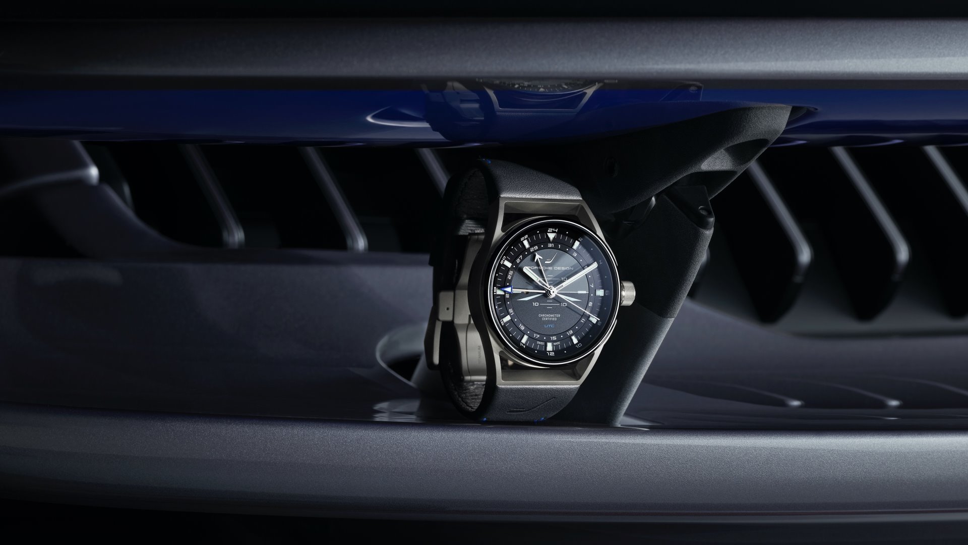 A special night design is obtained through use of luminous Superluminova material: the runway lights up in light blue in the dark, while the hour indices and hour and minute hands shine in light green. The tip of the date pointer is shaped like the Embraer logo. This is the letter “E”, stylised in the shape of a symmetrical plane. The black leather strap is made of real Porsche interior leather and features contrast stitching in Speed Blue. The cooperation logo can be found on the leather strap, the rear of the case and the dial. The 1919 UTC Globetimer Embraer is also limited to ten units and is exclusively reserved for owners of the jet and vehicle.
